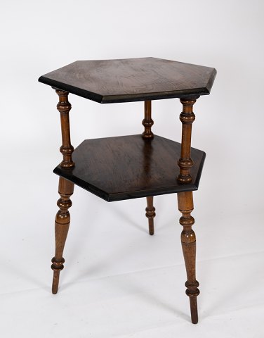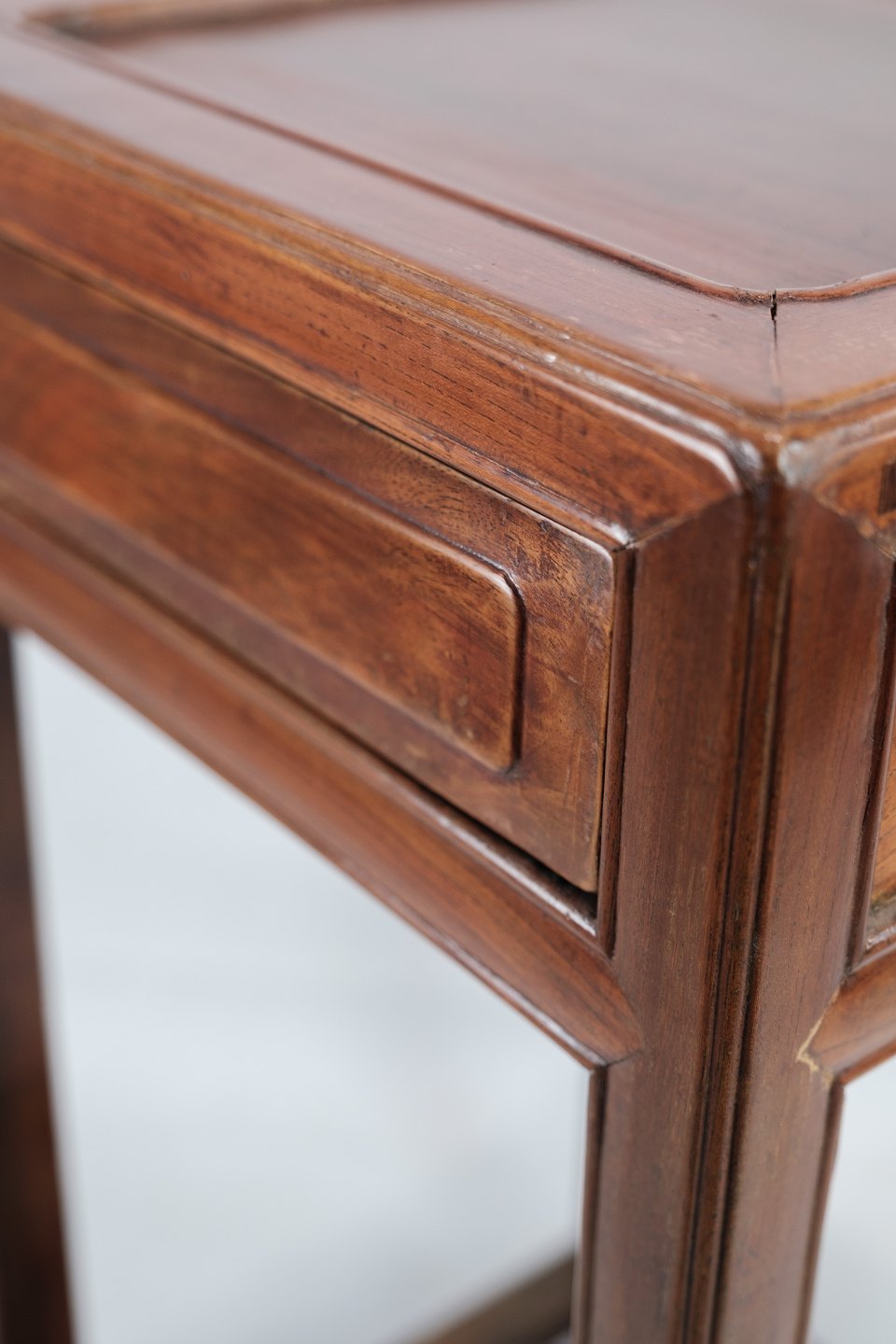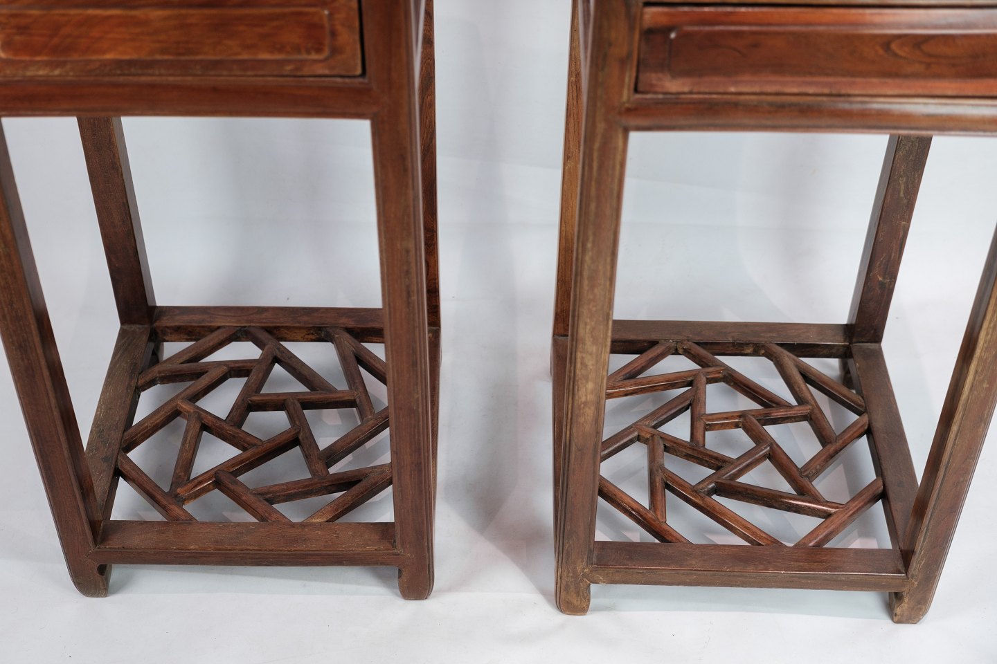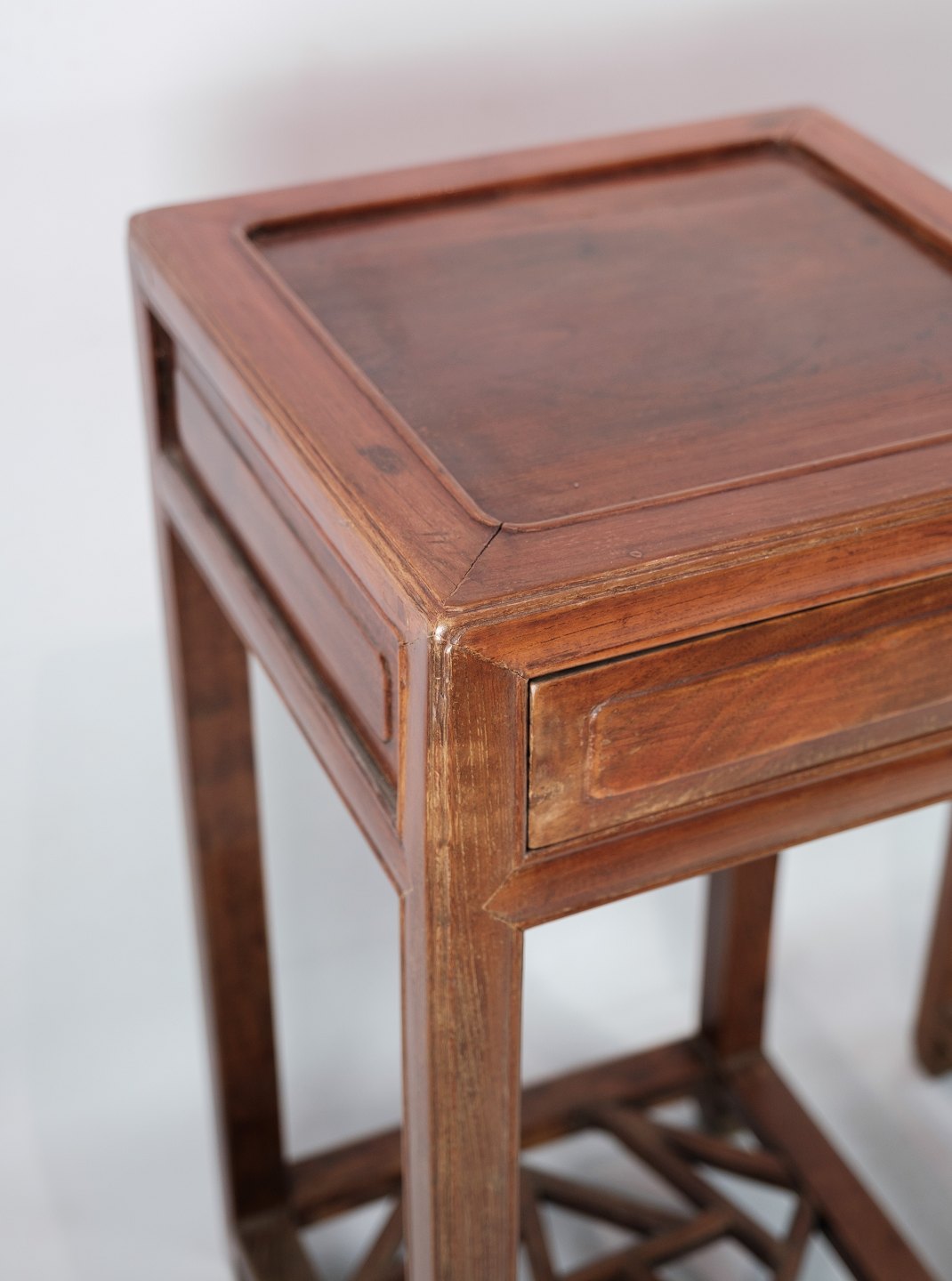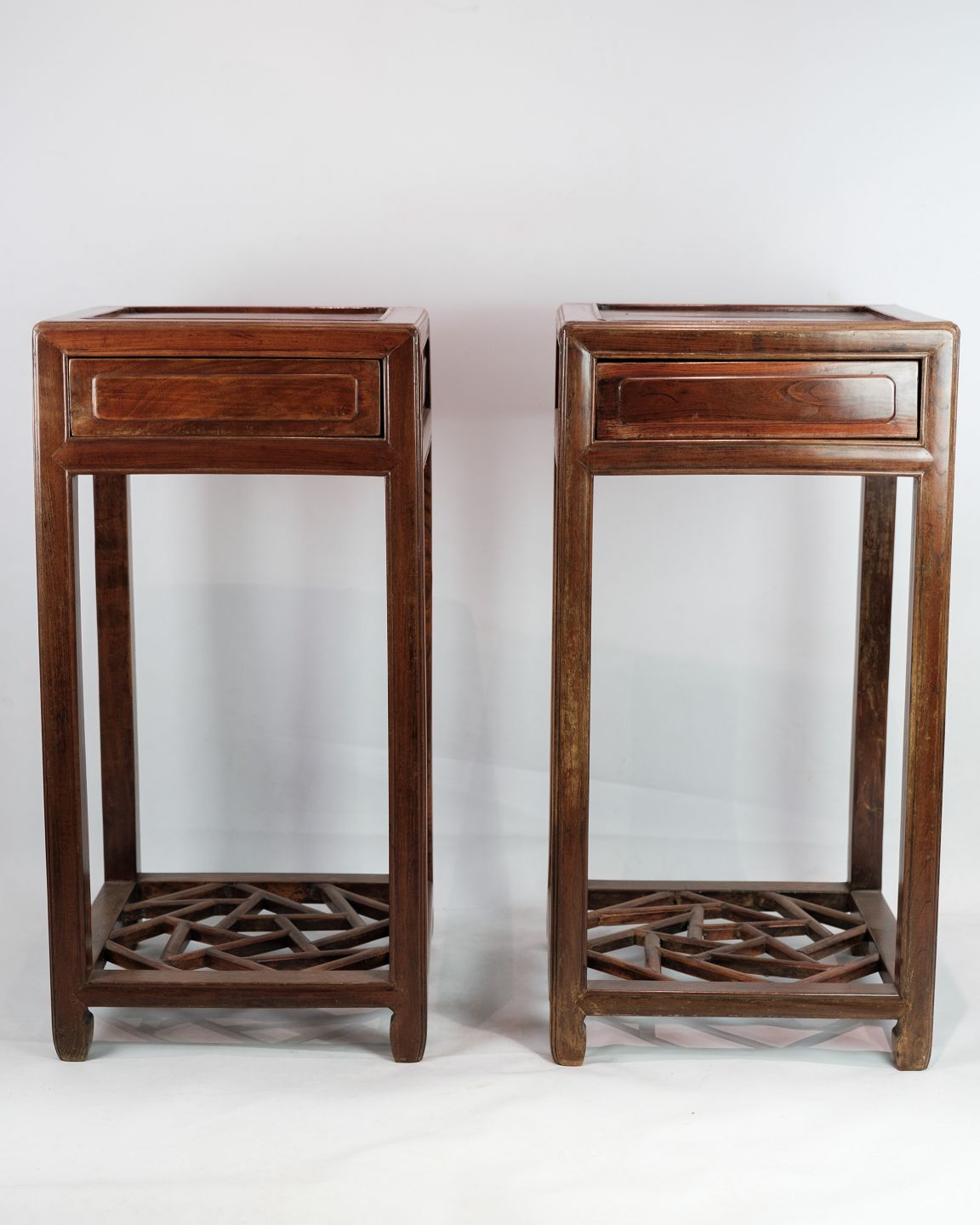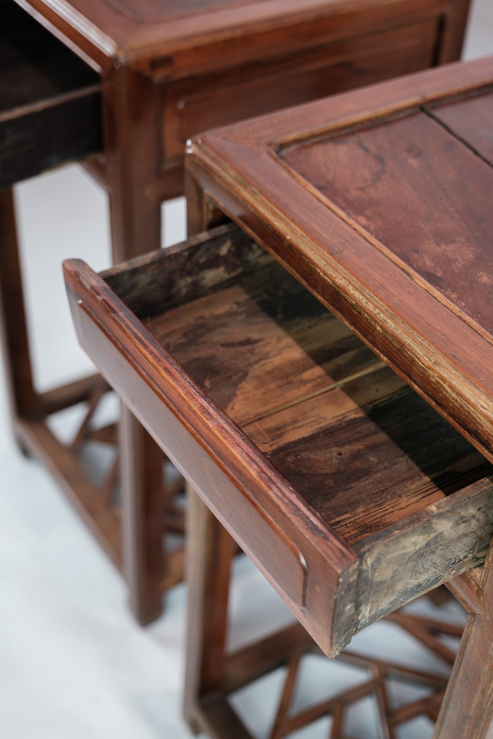A set of Chinese side tables with drawer in polished dark wood from around the year 1880s. In really good condition.