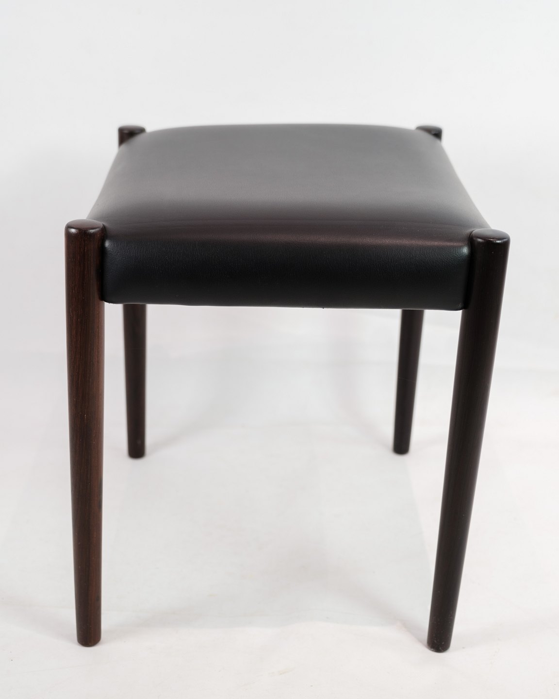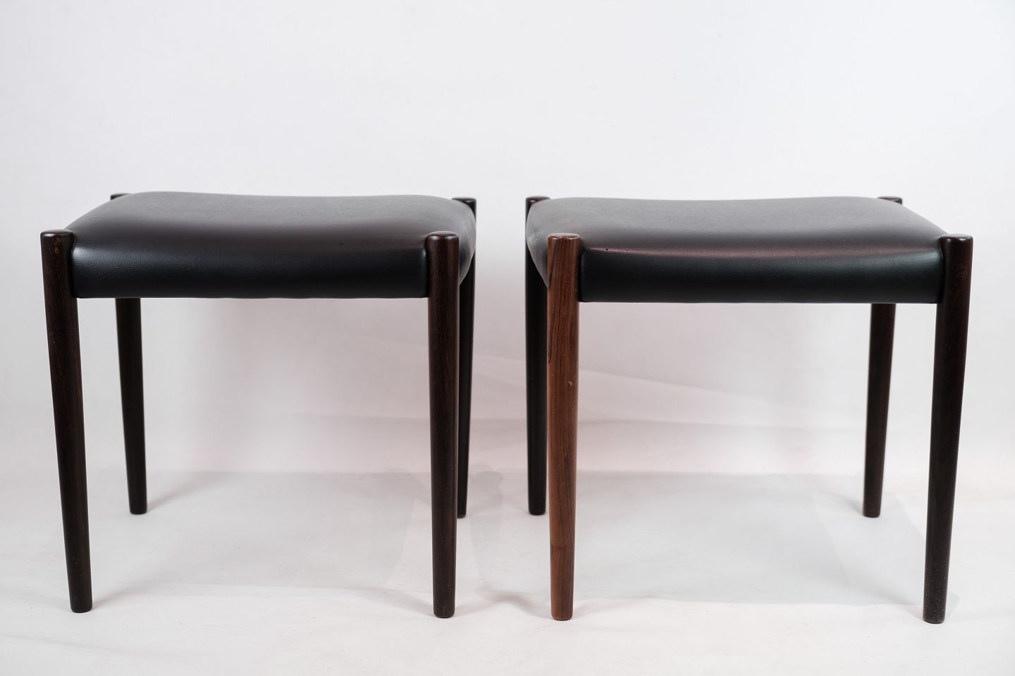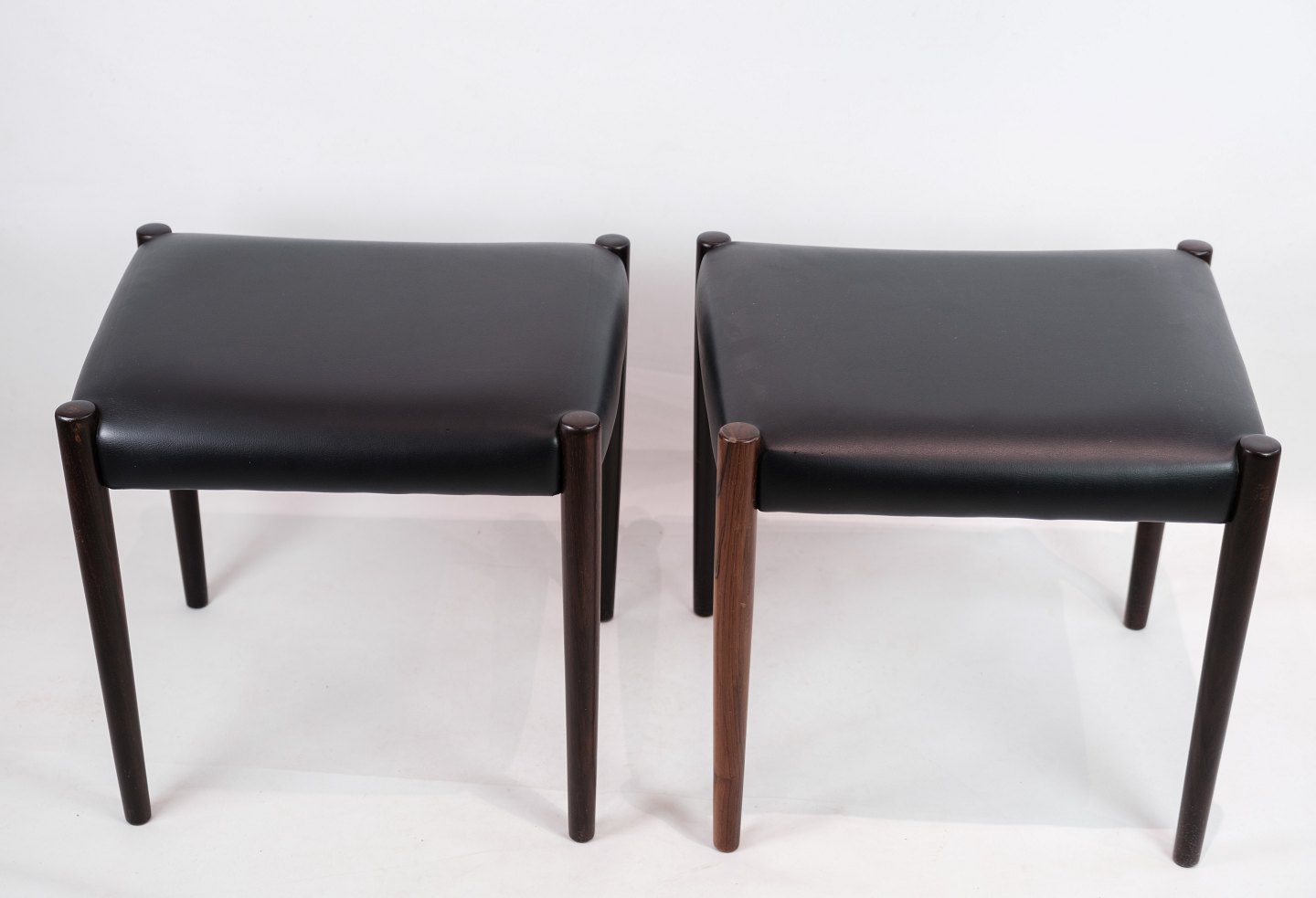 Dette sæt af to skamler er et smukt eksempel på dansk design fra 1960'erne. Skamlerne er fremstillet af palisandertræ, som giver dem en varm og naturlig farve med en smuk træstruktur. Den sorte læderpolstring tilføjer et elegant og tidløst touch til designet og sikrer samtidig komfort og holdbarhed.