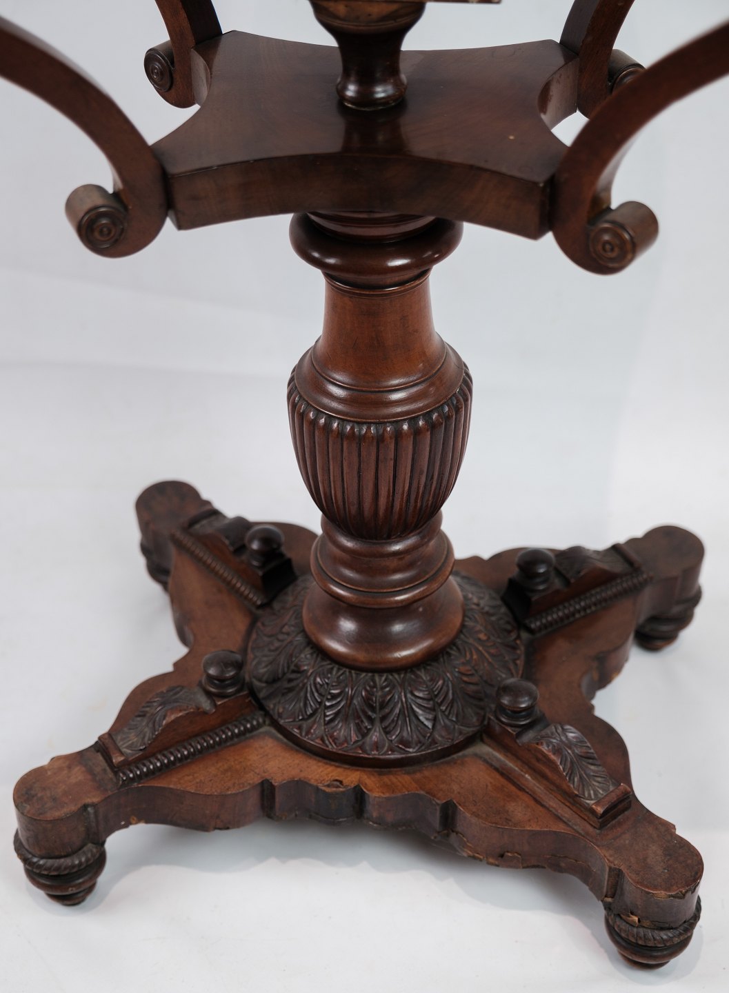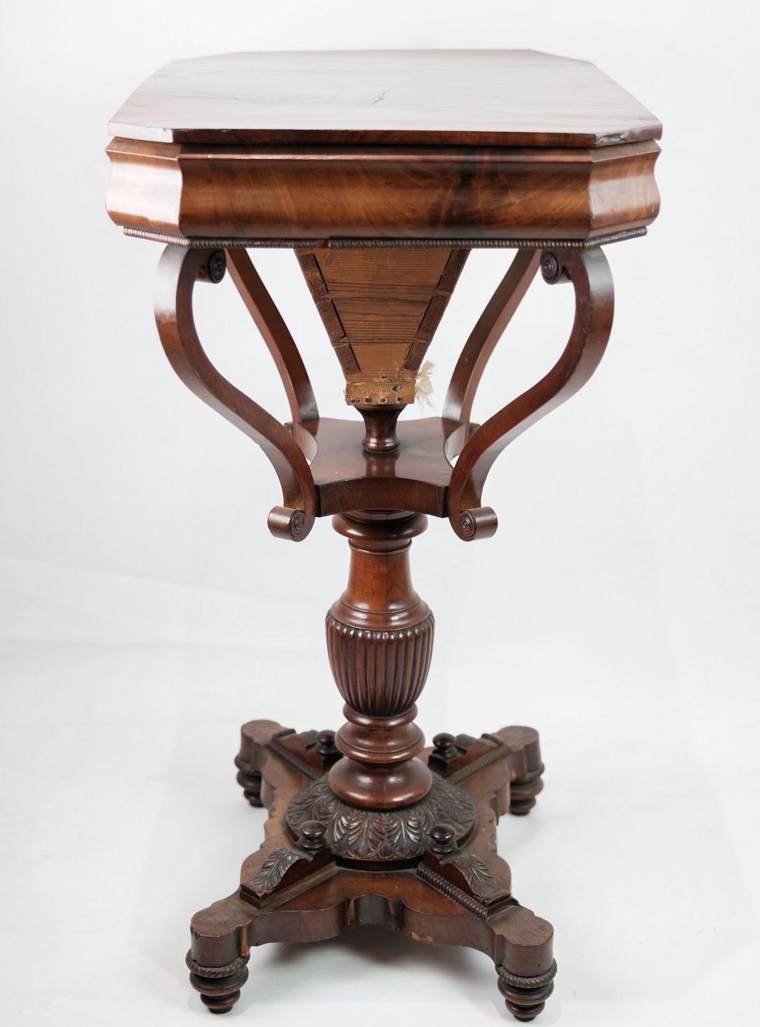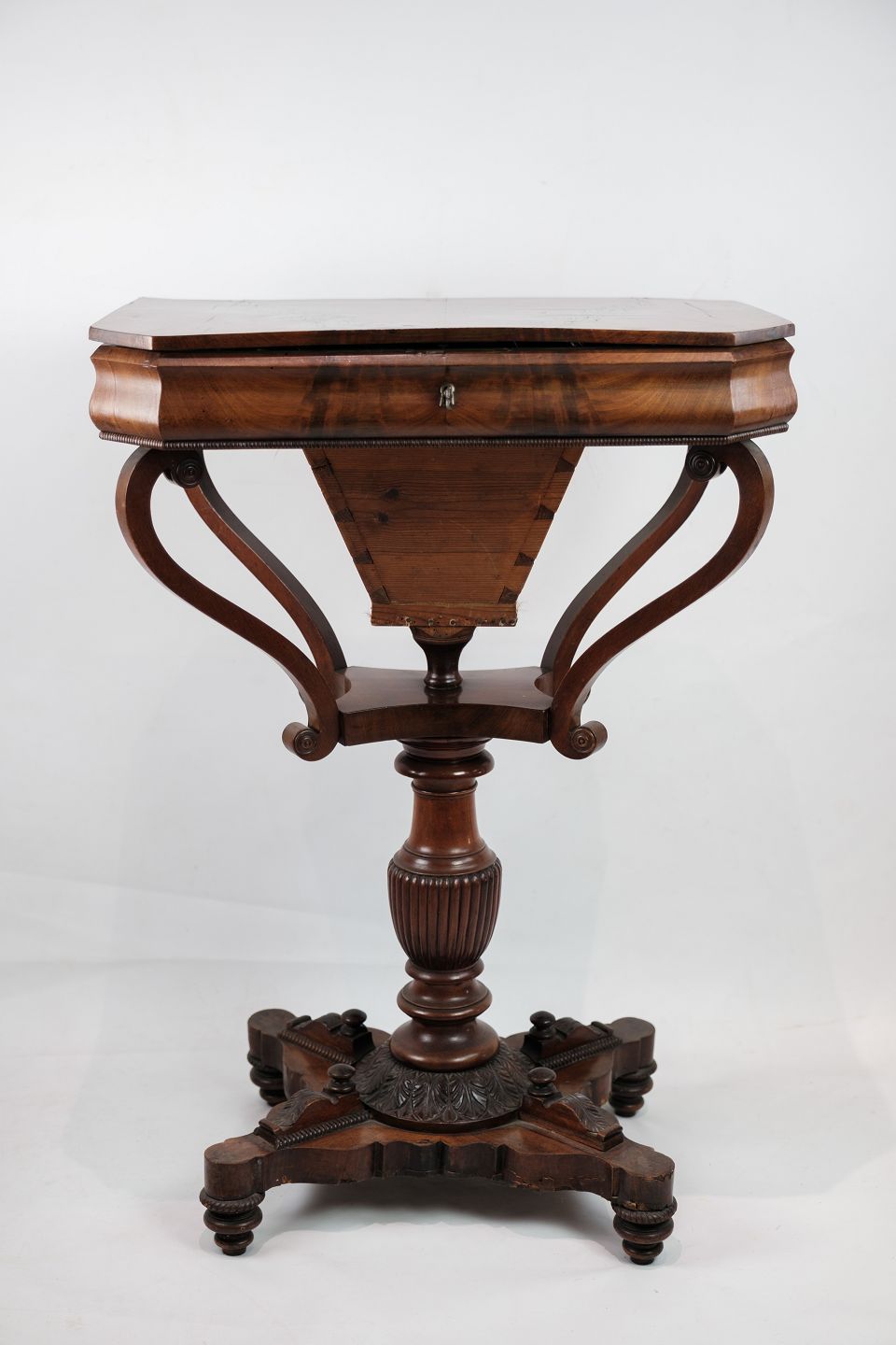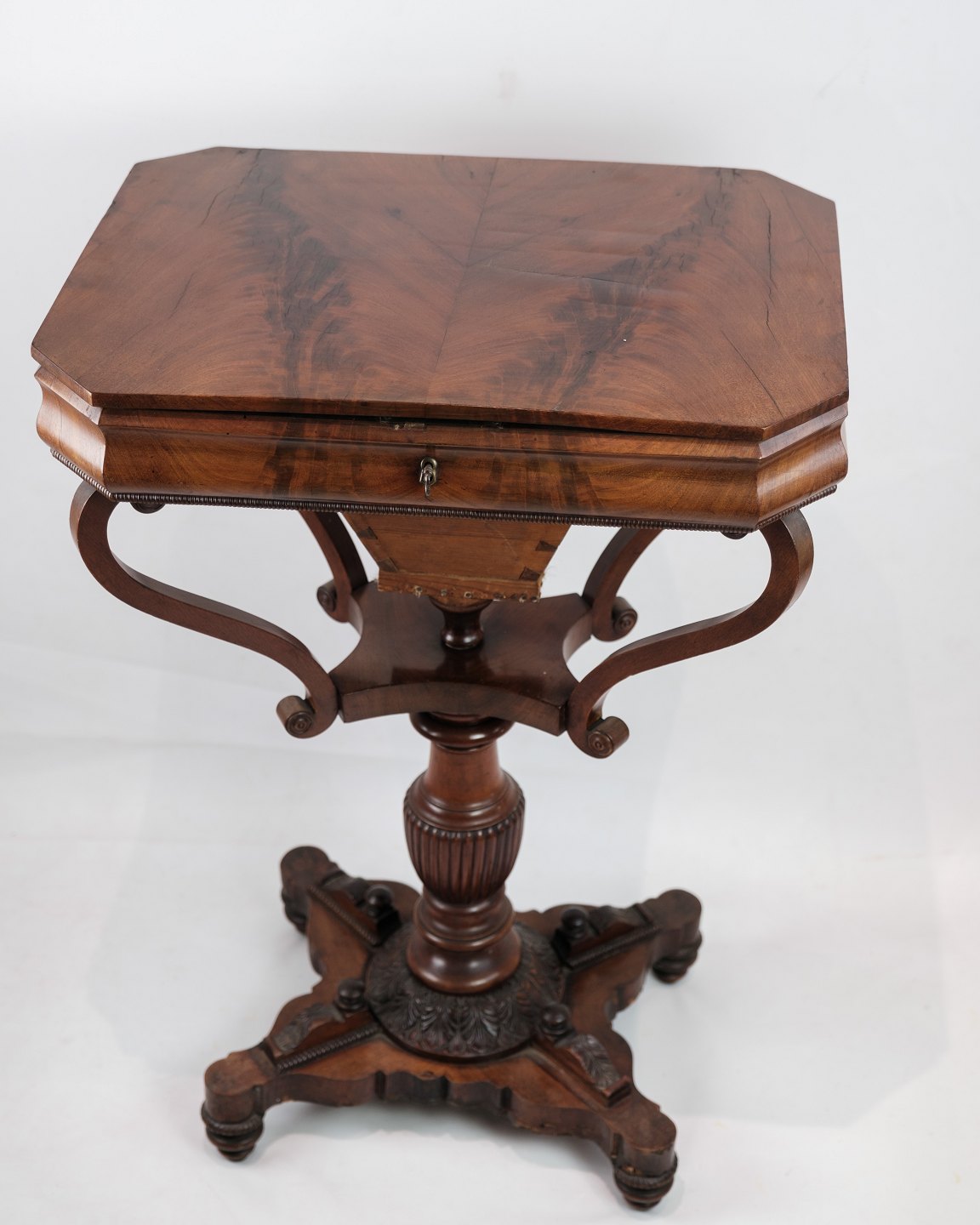 SolgtEt antikt sybord i mahogni på en søjle fra omkring år 1840'erne. Står i flot original stand.