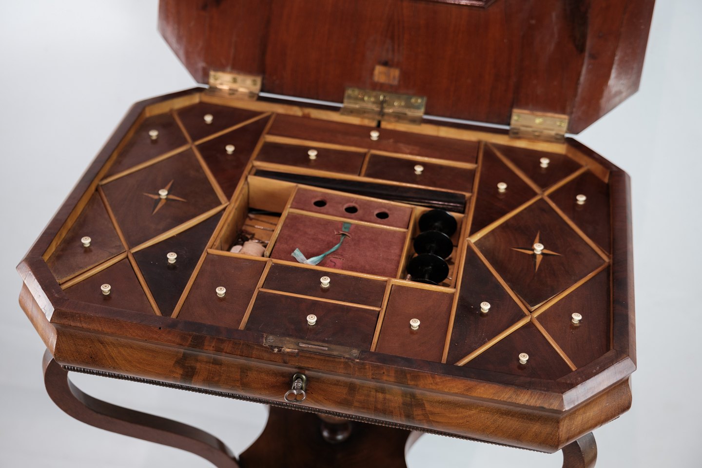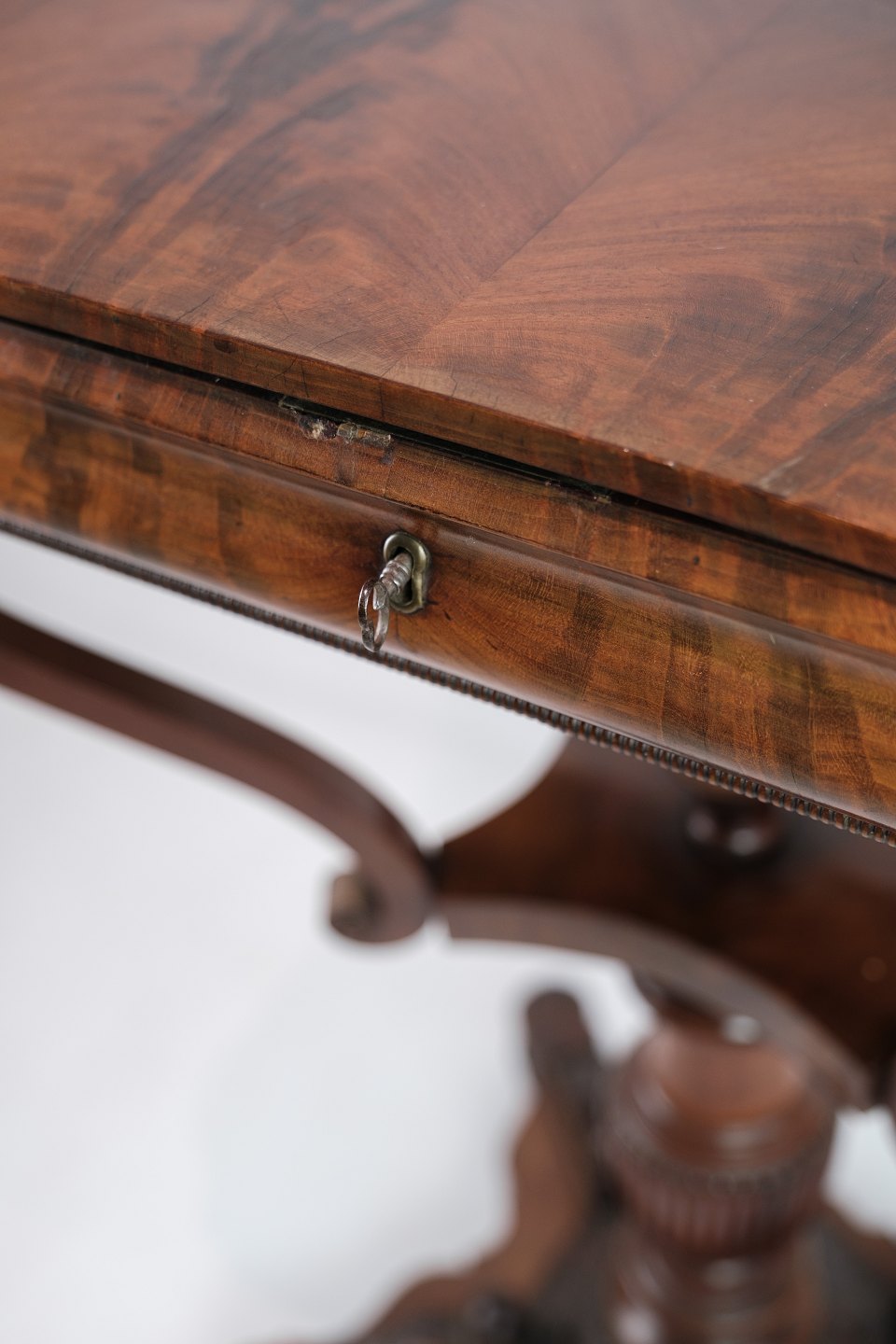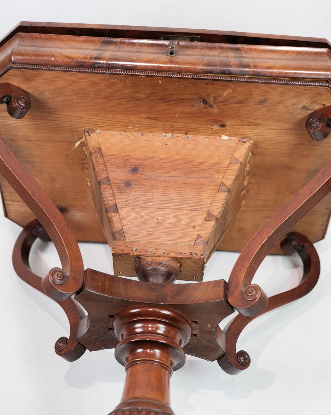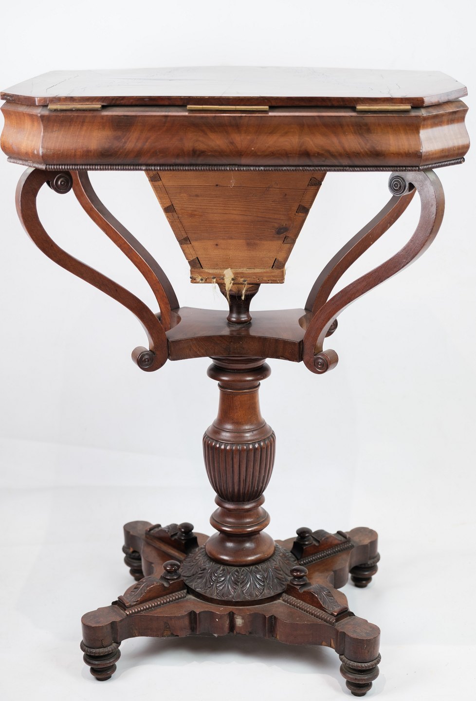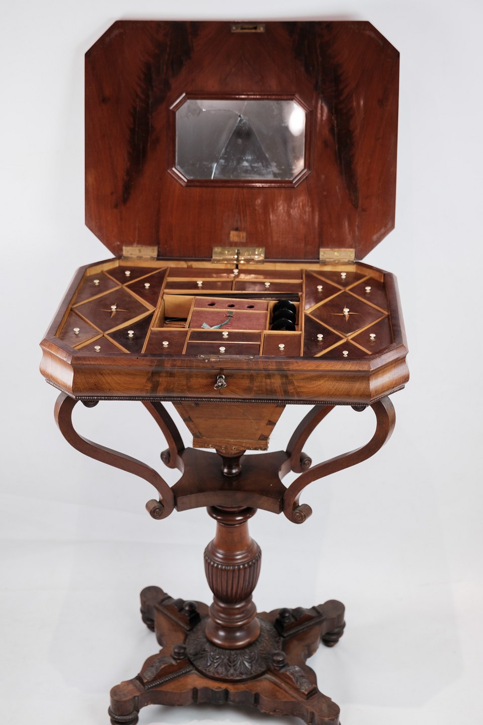 SolgtEt antikt sybord i mahogni på en søjle fra omkring år 1840'erne. Står i flot original stand.