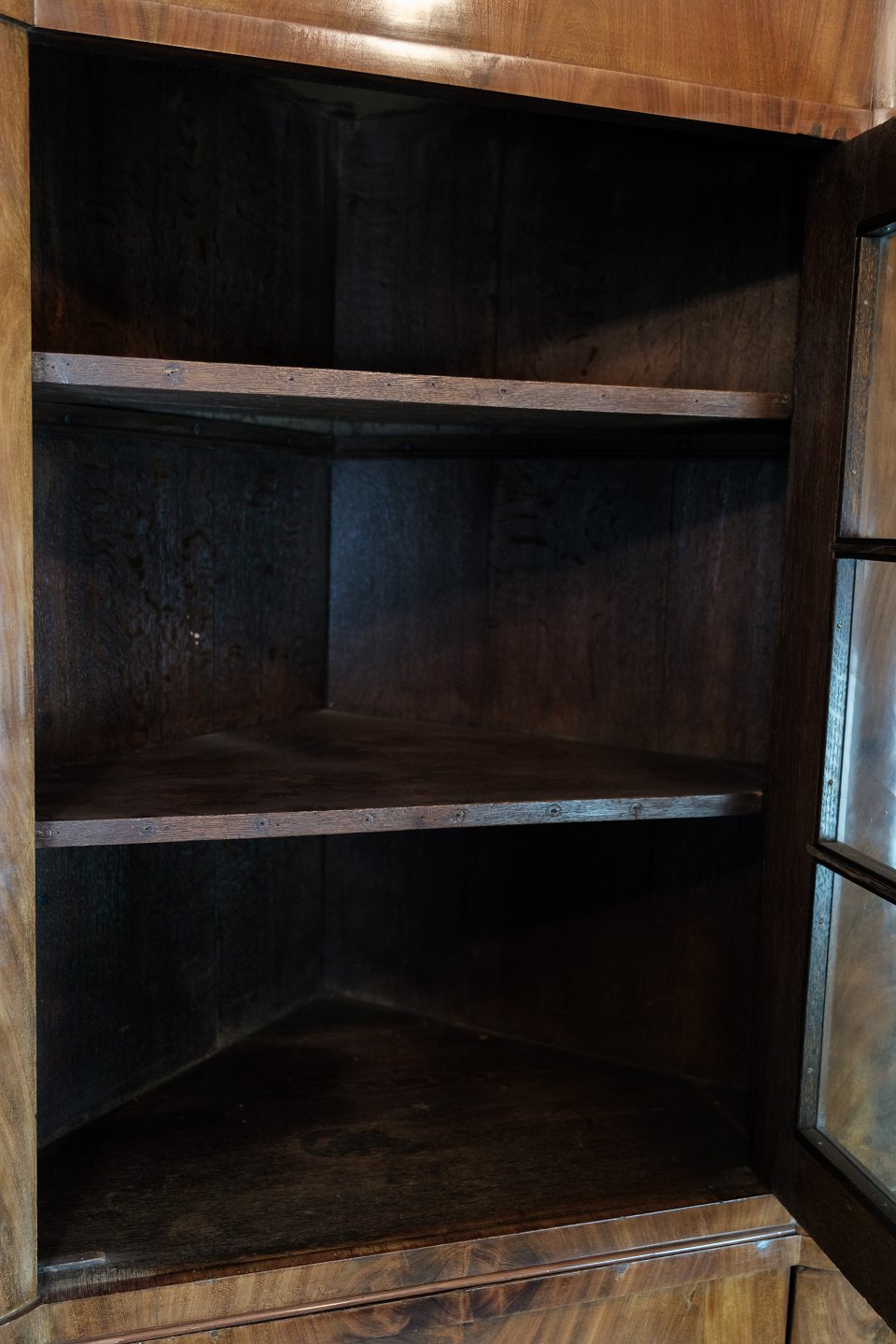 Mahognitræet, med sin varme farvetone og dybe glans, giver hjørneskabet en fornem og luksuriøs udstråling. Den polerede overflade fremhæver træets naturlige mønstre og skaber en smuk kontrast til de fine detaljer og dekorative elementer.