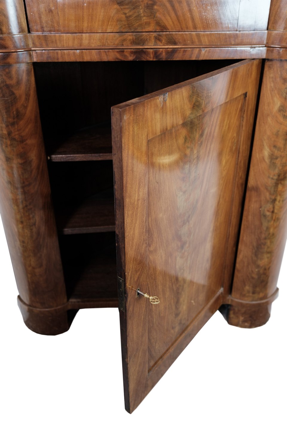 Hjørneskabet er designet i en klassisk Senempire-stil med elegante linjer, buede former og raffinerede ornamentikker. Dets nordtyske oprindelse tilføjer en særlig historisk og kulturel værdi, der gør det til et unikt og værdifuldt stykke møbelhistorie.
