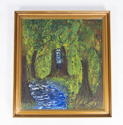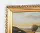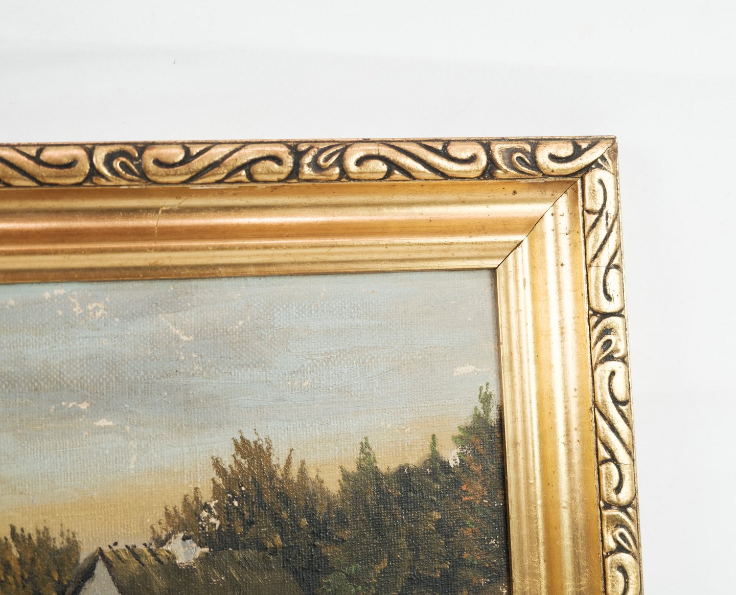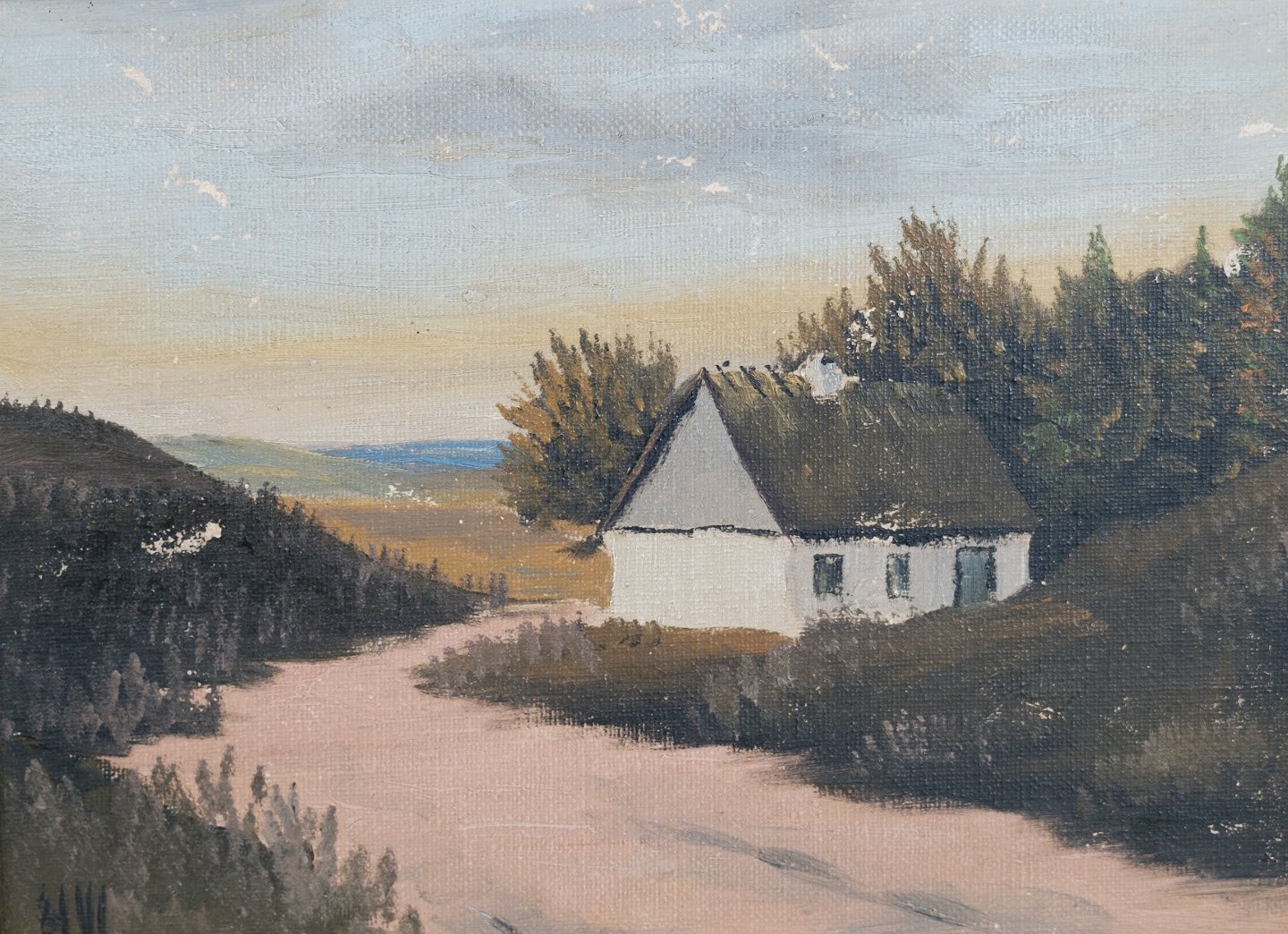 Oliemaleri af et lille bondehus og grusvej malet på træplade med guld ramme fra omkring år 1940'erne. Står i meget fin brugt stand.