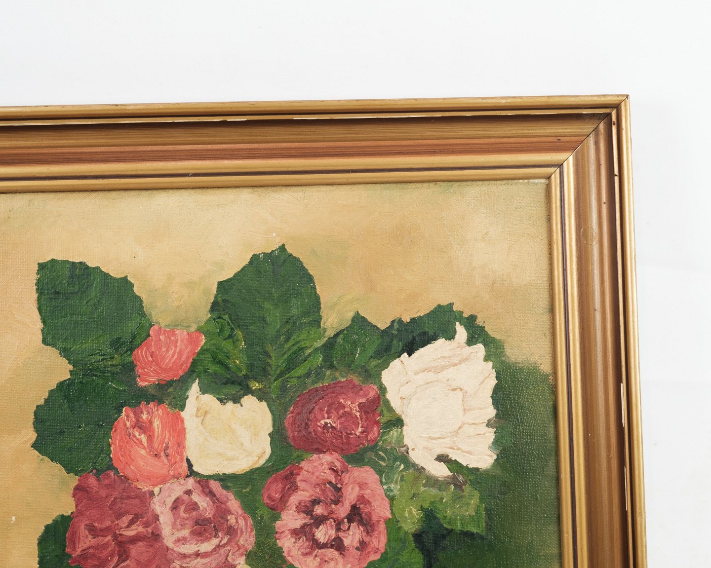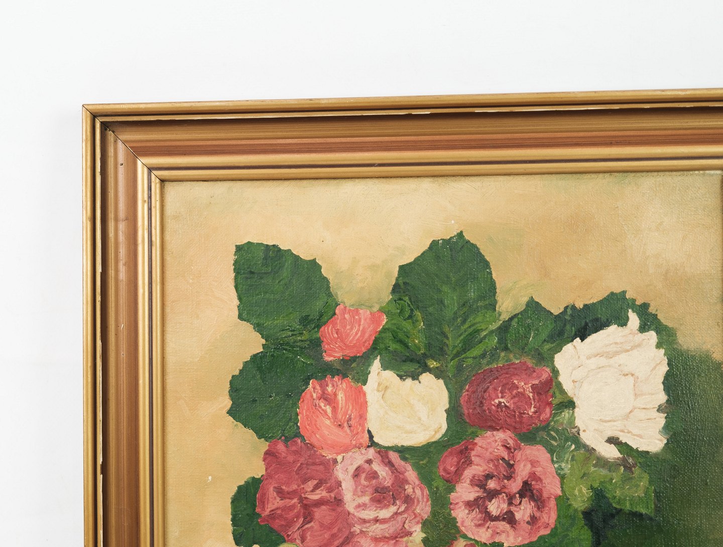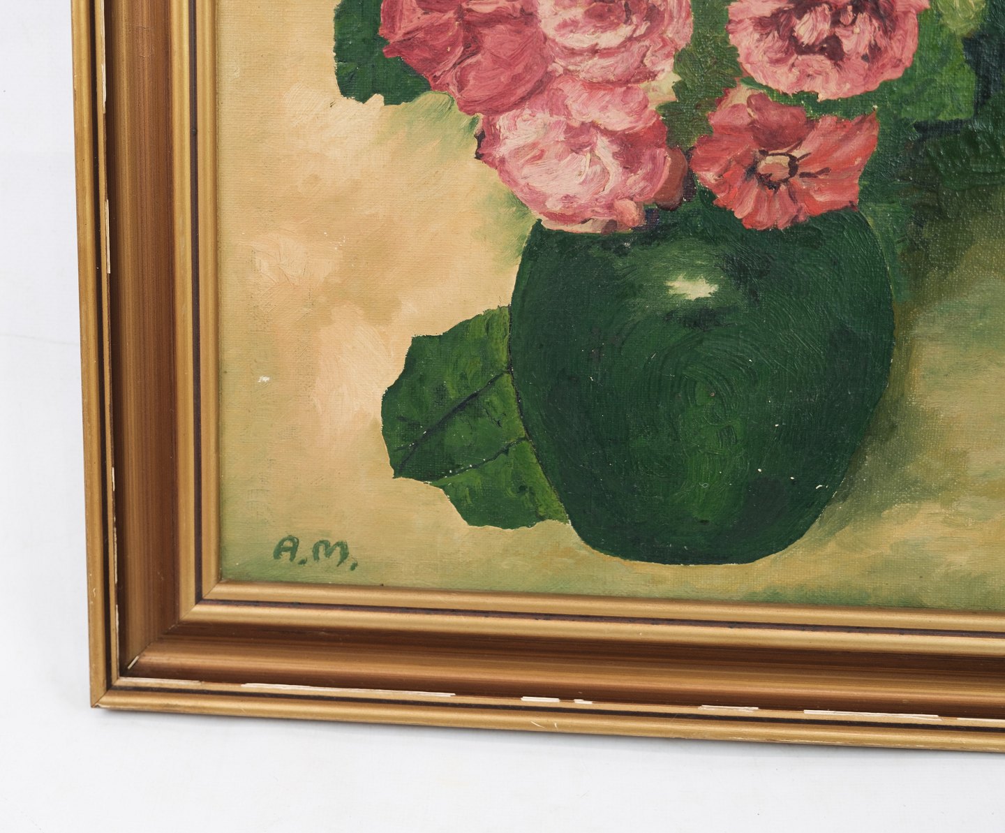Oliemaleri med motiv af blomster malet på lærredet signet A.M. fra år 1940'erne. Står i meget fin brugt stand.