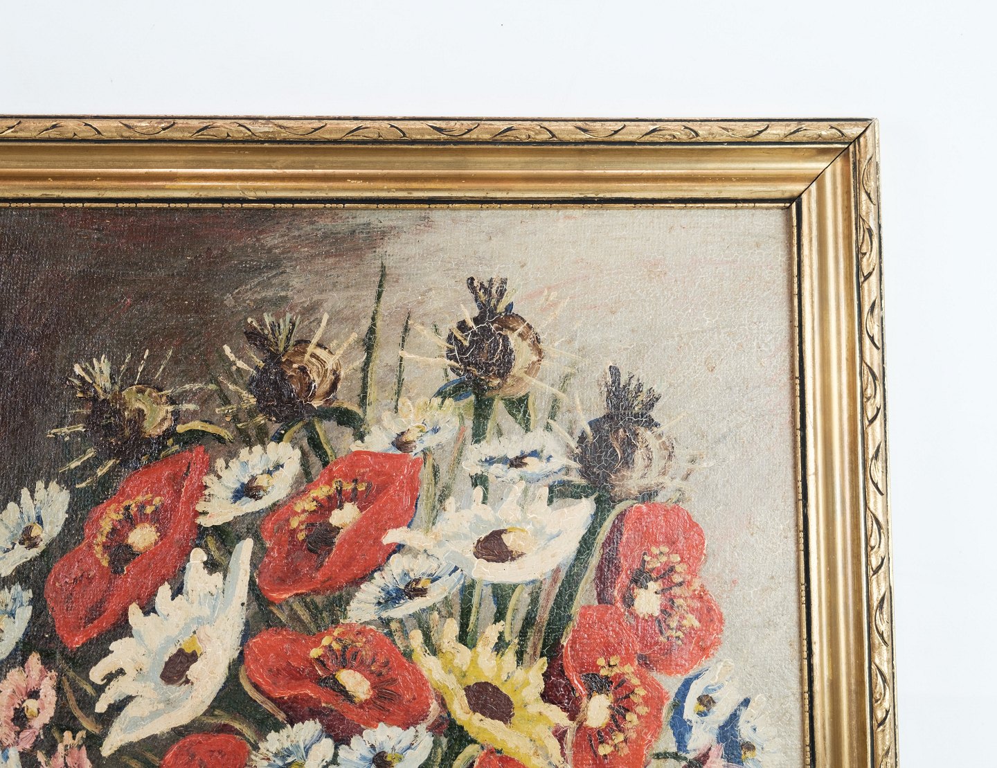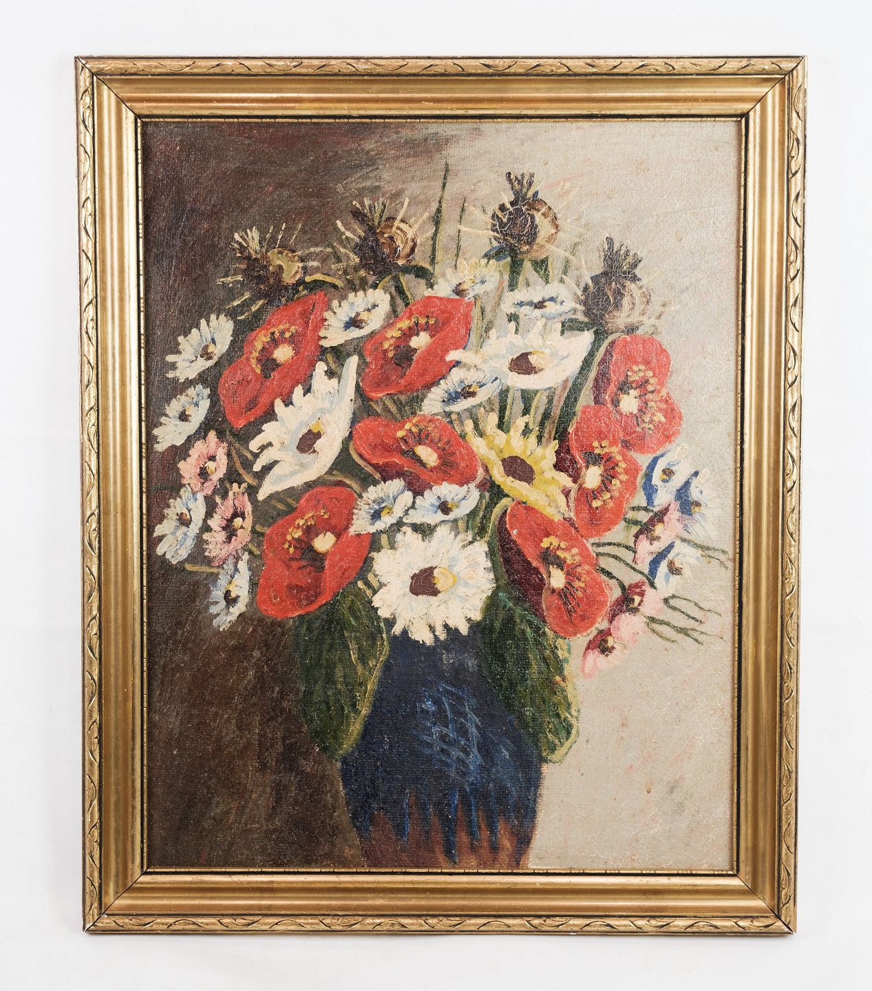Blomster oliemaleri malet på træ plade fra år 1940'erne. Står i meget fin brugt stand.