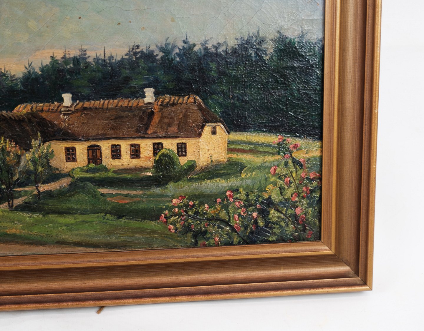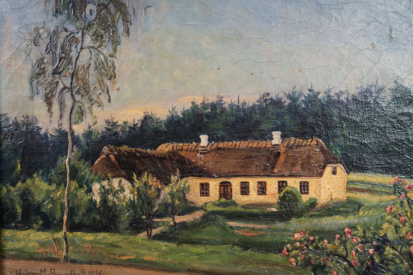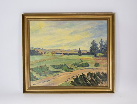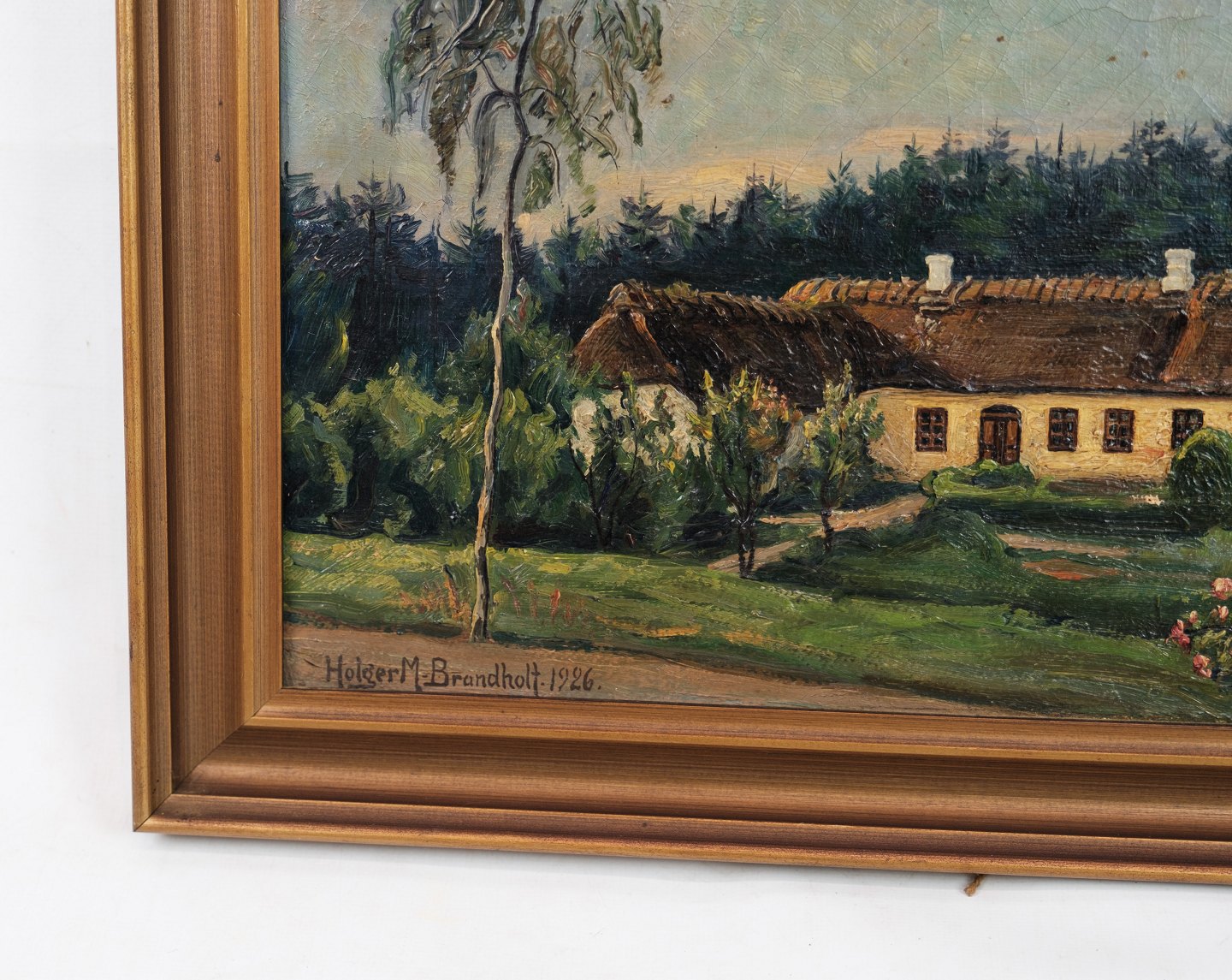 Oil painting with farmhouse and gold frame from around 1926. Signed Holger M. Brandholt. Stands in very nice condition.