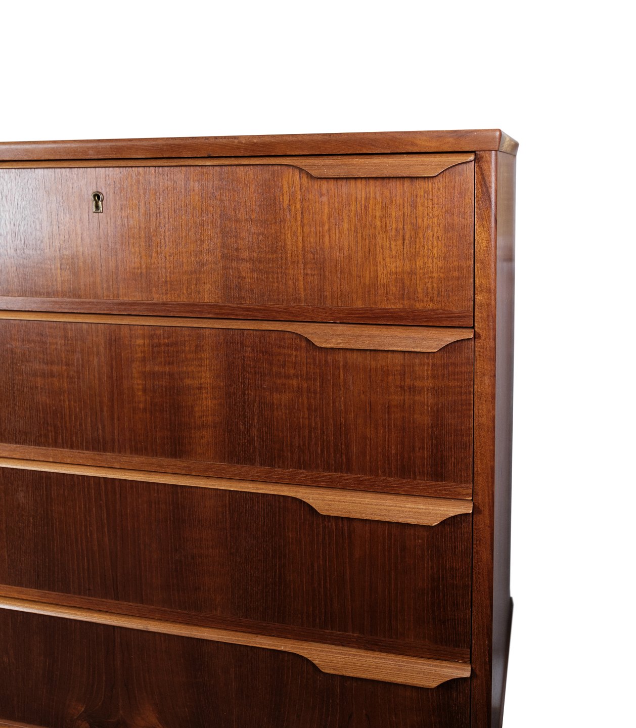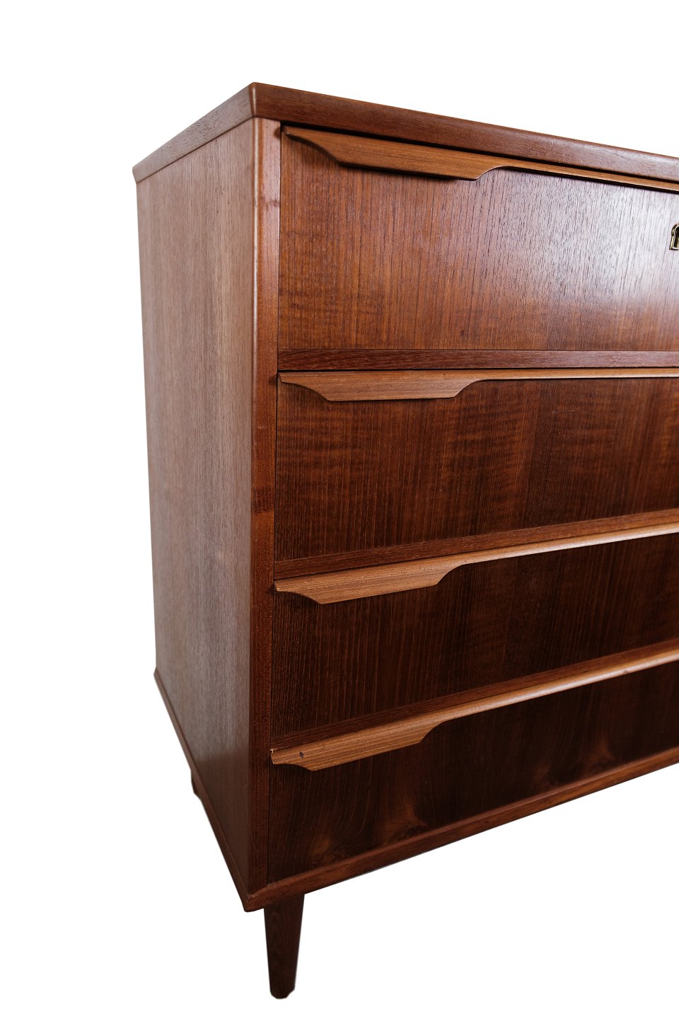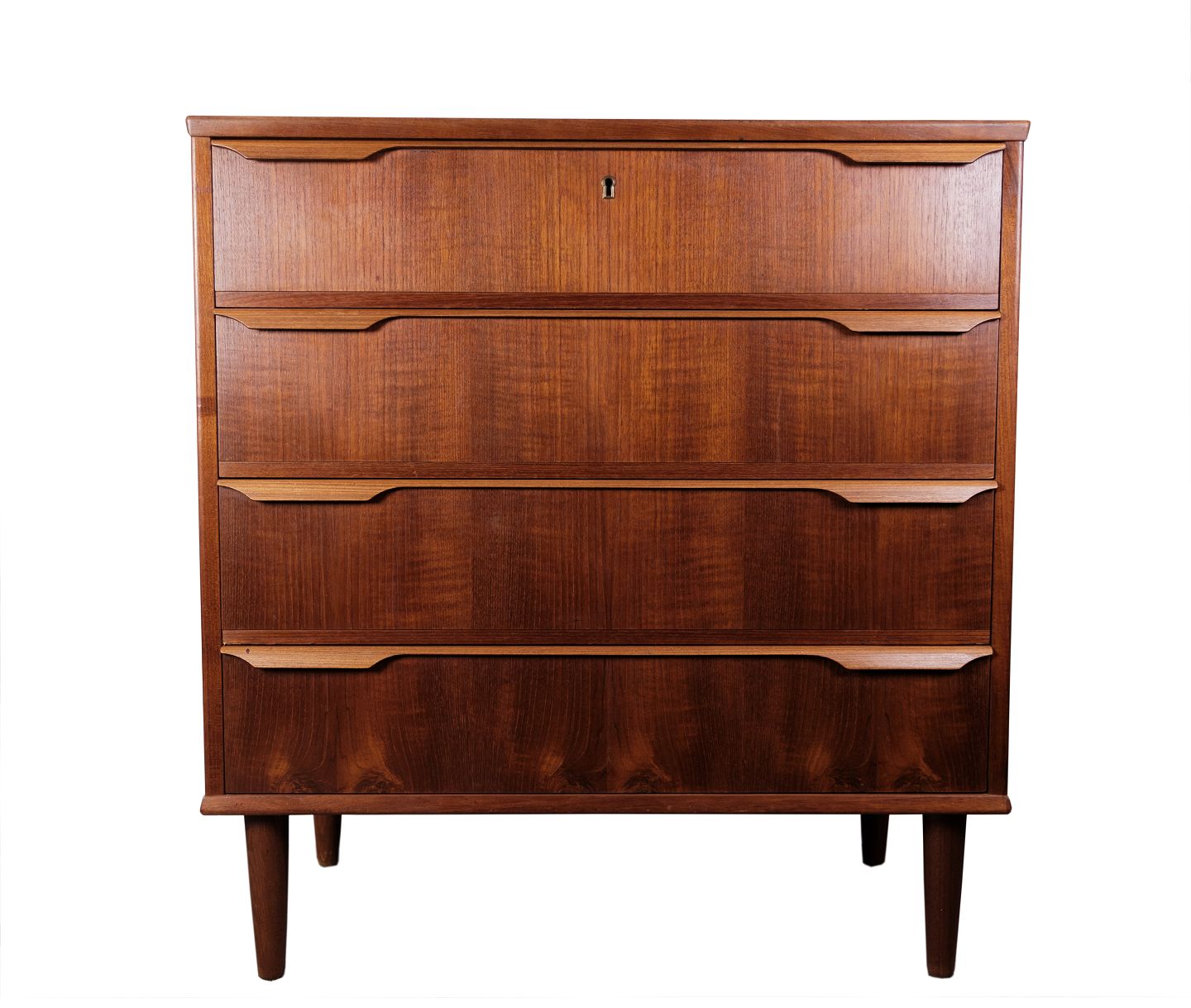 SoldA teak chest of drawers of Danish design from the 1960s. The chest of drawers has 4 drawers and the key is in the top drawer. is in very fine used condition.