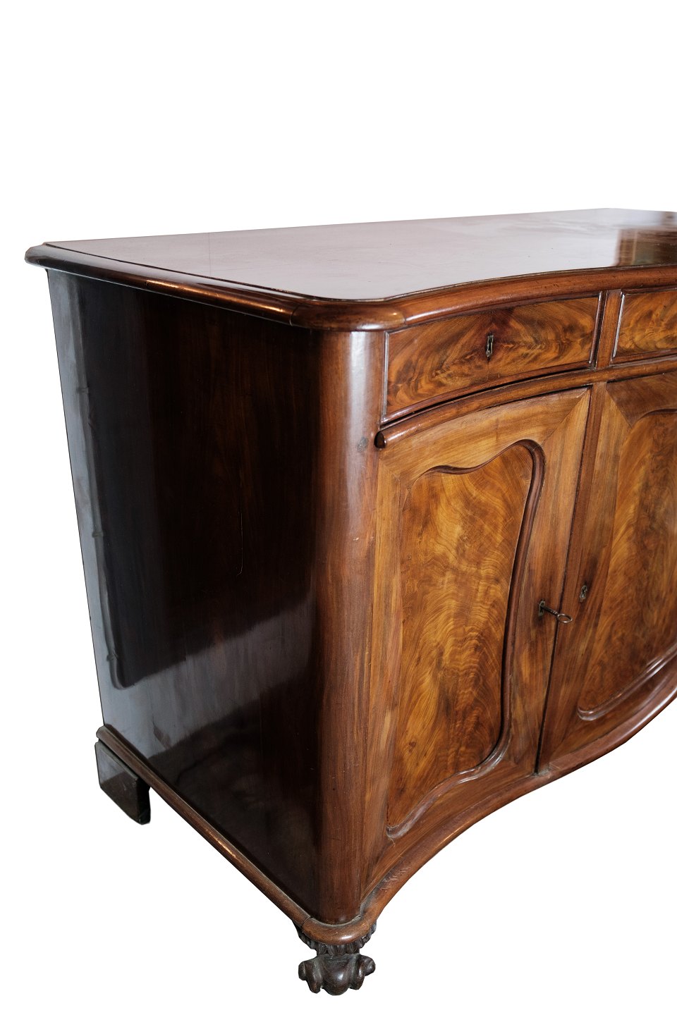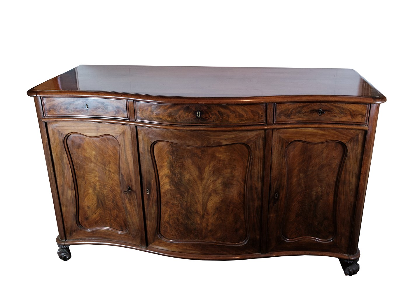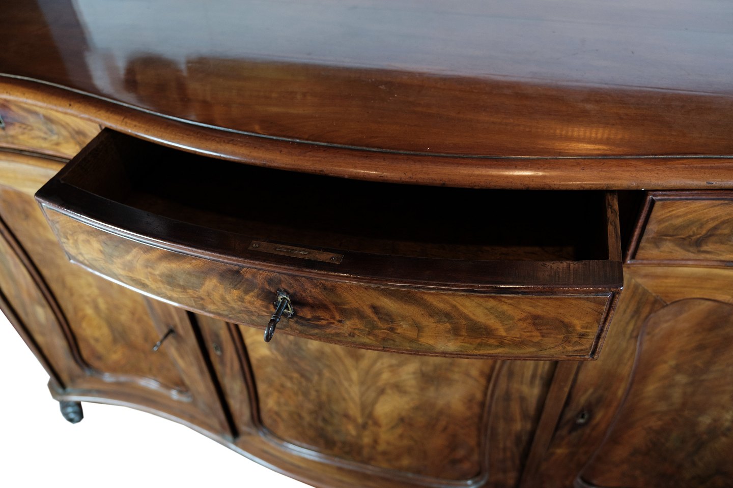 SolgtEn skænk i mahogni med en buede front med oprindelse fra Danmark lavet i 1860'erne. Står i meget fin brugt stand.