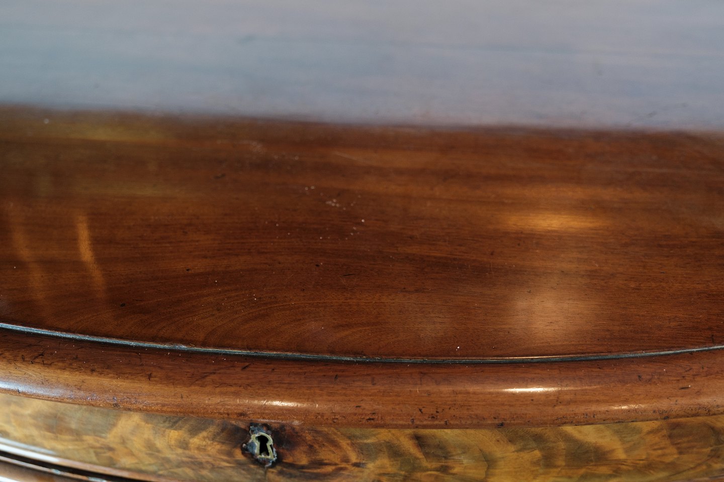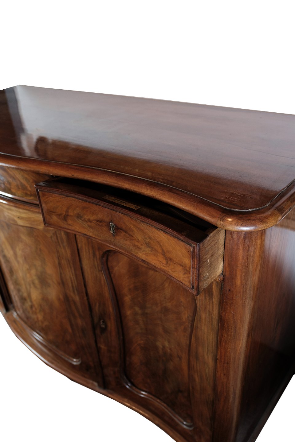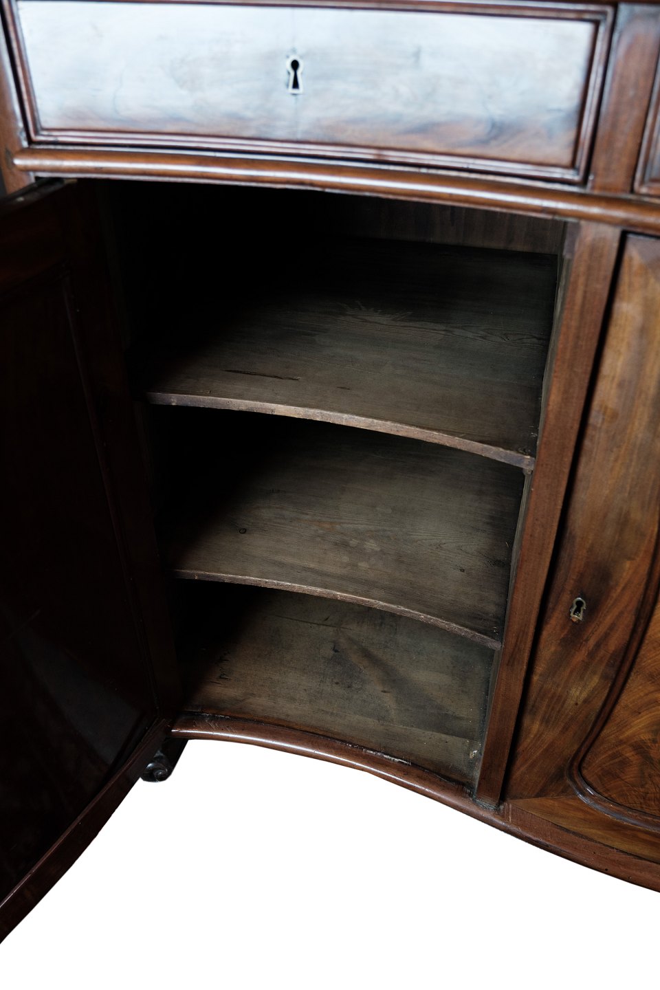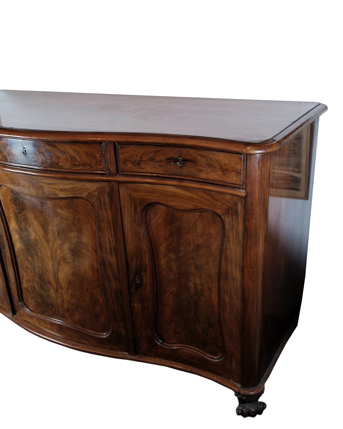 SolgtEn skænk i mahogni med en buede front med oprindelse fra Danmark lavet i 1860'erne. Står i meget fin brugt stand.