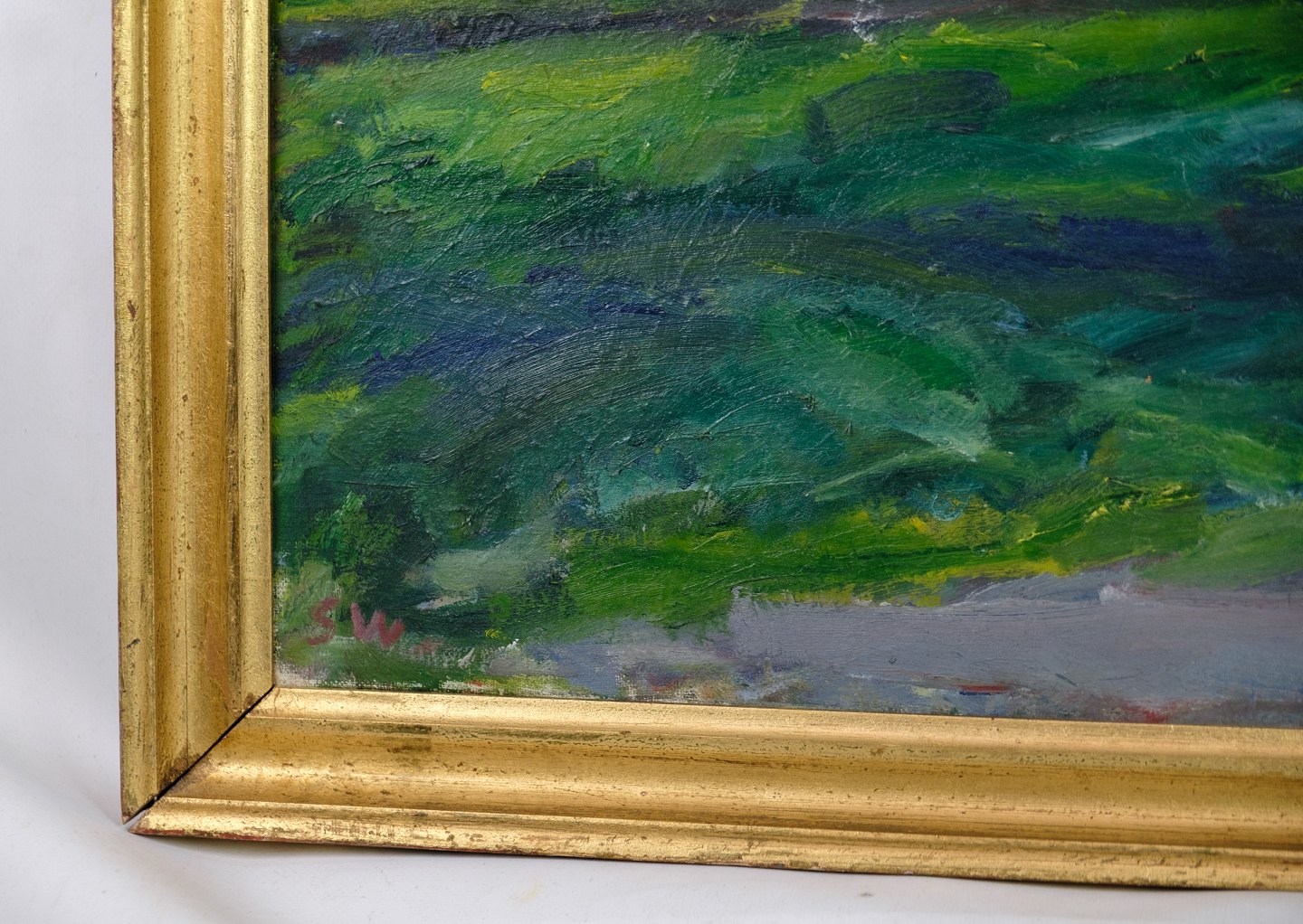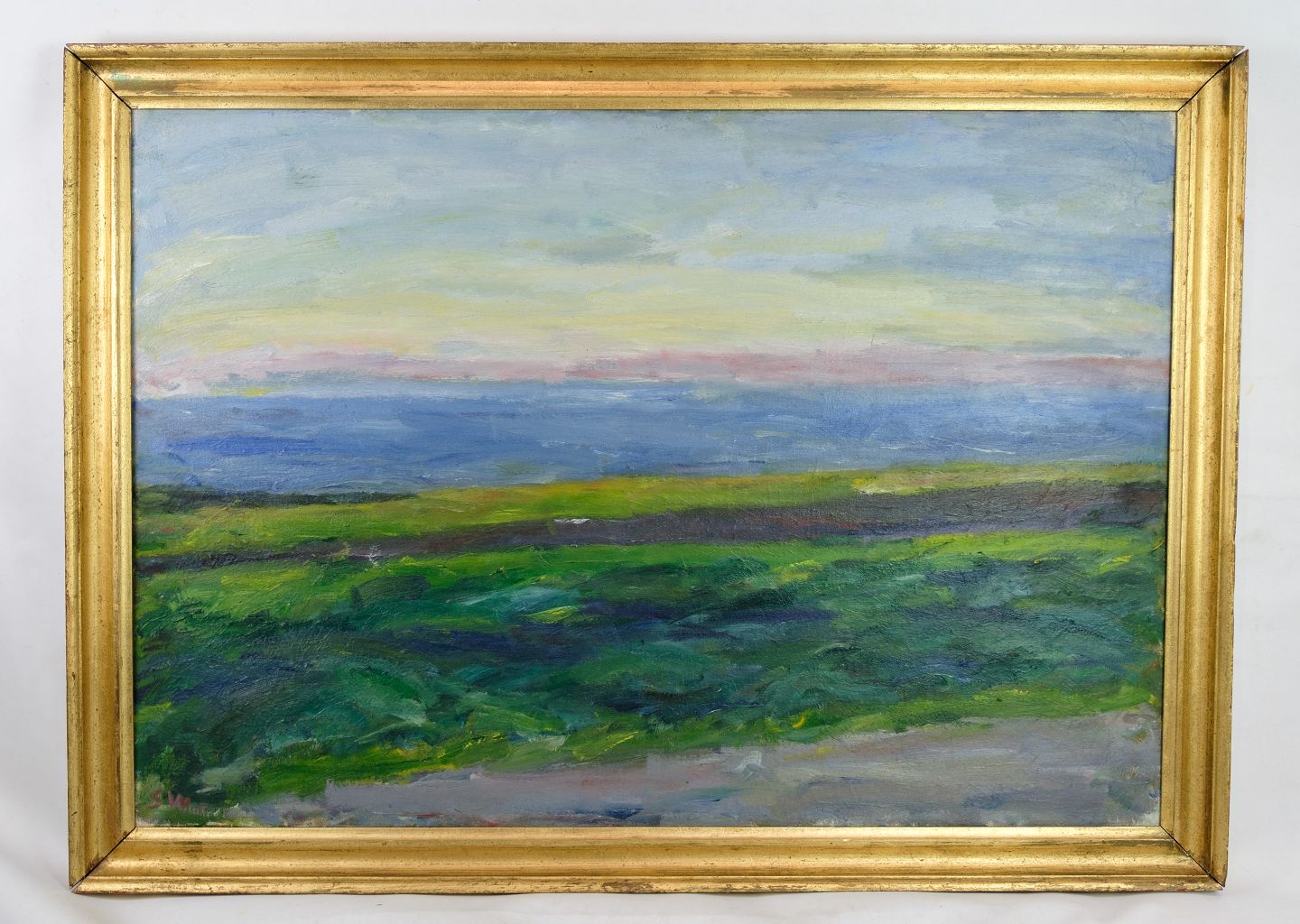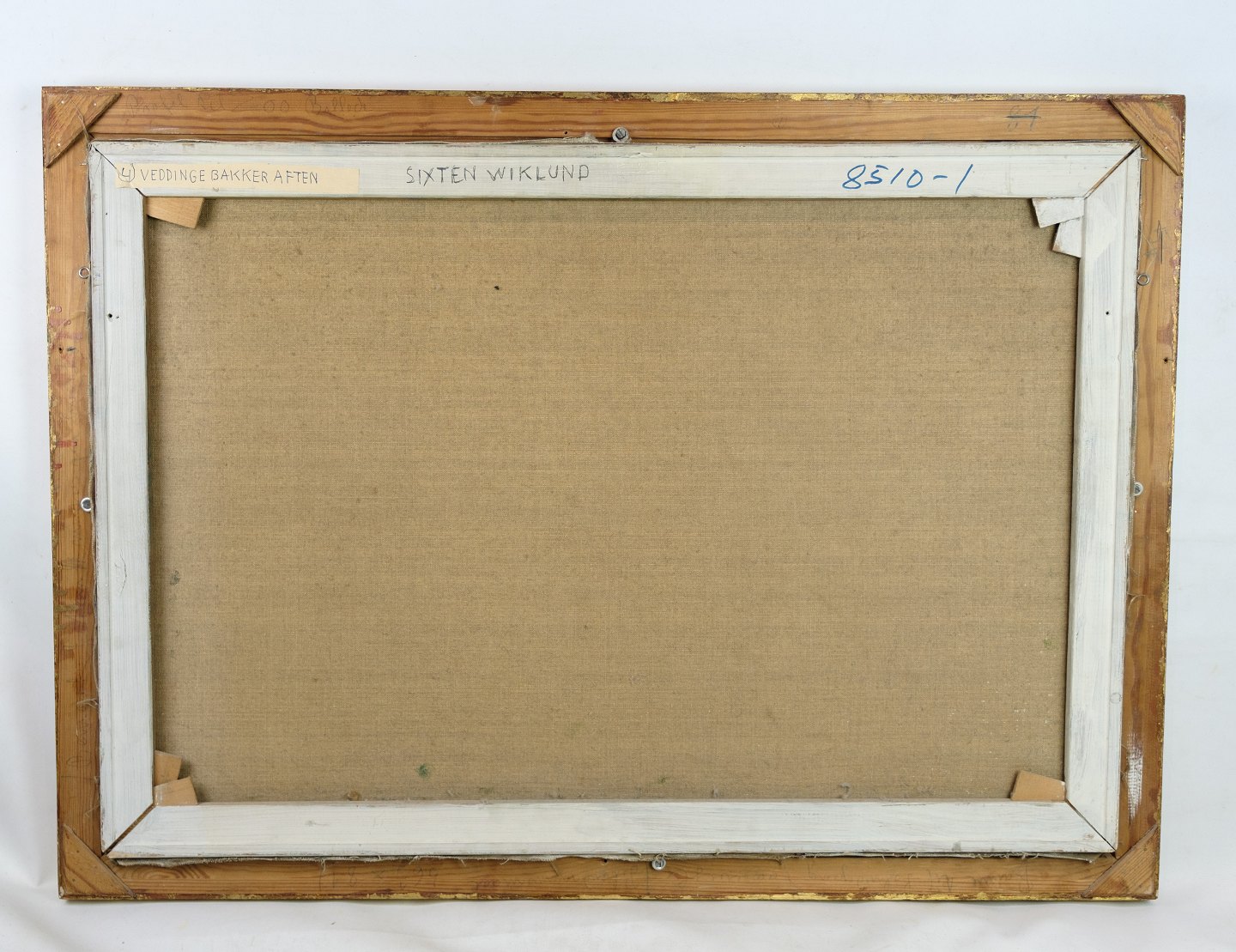 SolgtOliemaleri på lærredet med grønne og blå farve nuancer malet af Sixten Wiklund (1907-1986) fra år 1950'erne. Maleriet forstiller veddinge bakker om aften. Maleriet står i meget fin stand uden skader med original ramme.