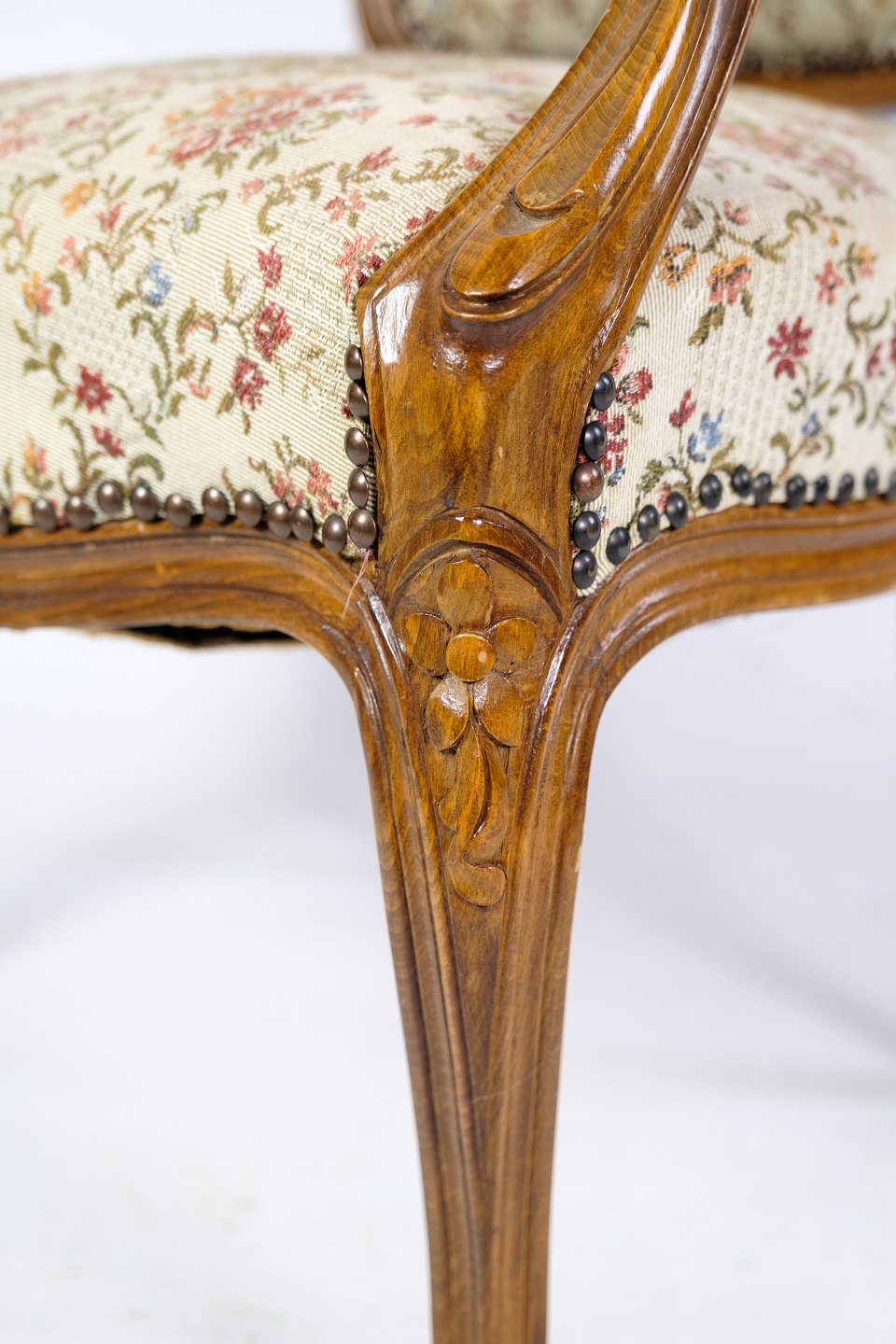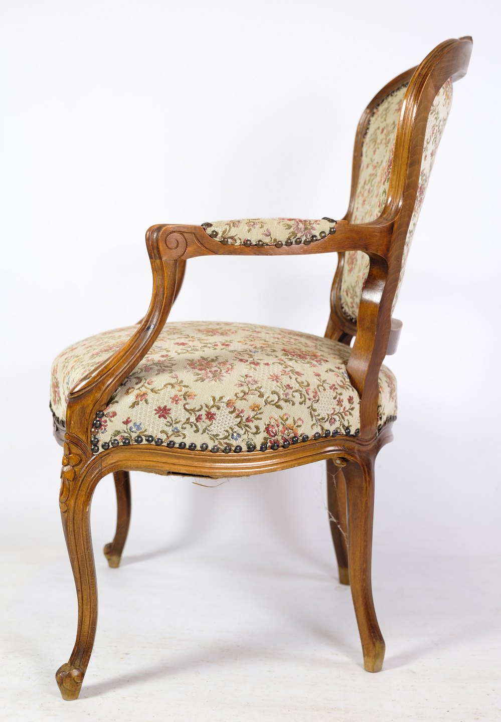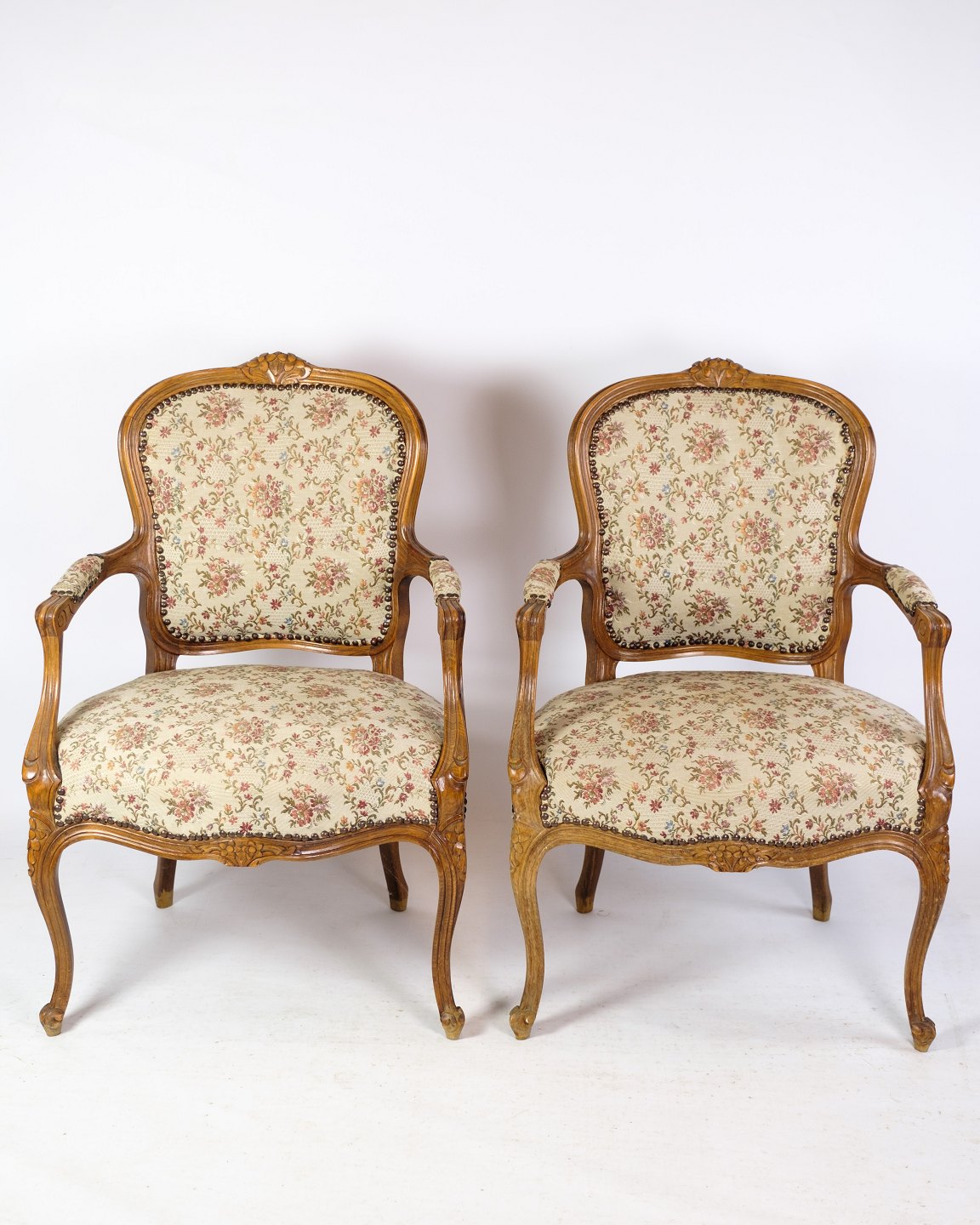 Et par nyrokoko armstole med dekorativt stof i lyst træ fra omkring 1930'erne er en smuk repræsentation af tidlig 20. århundredes møbeldesign og æstetik. Disse stole kombinerer elegance og raffinement med en subtil lethed og charme, der er karakteristisk for rokokostilen.