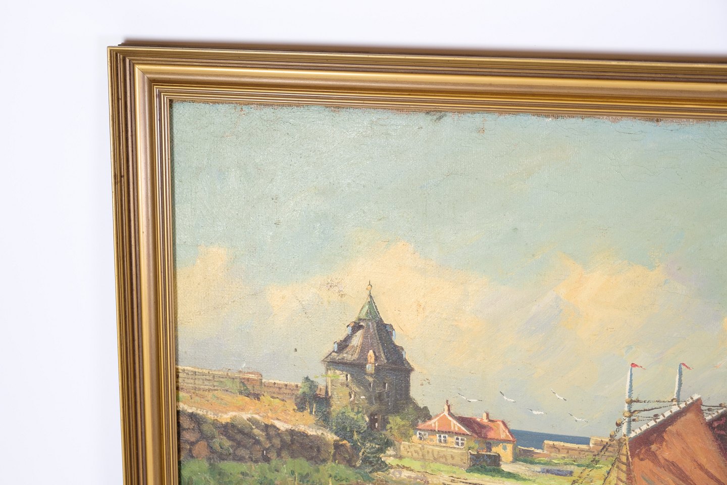 A large oil painting on canvas with motif of fishing boats near shore from around 1930s.