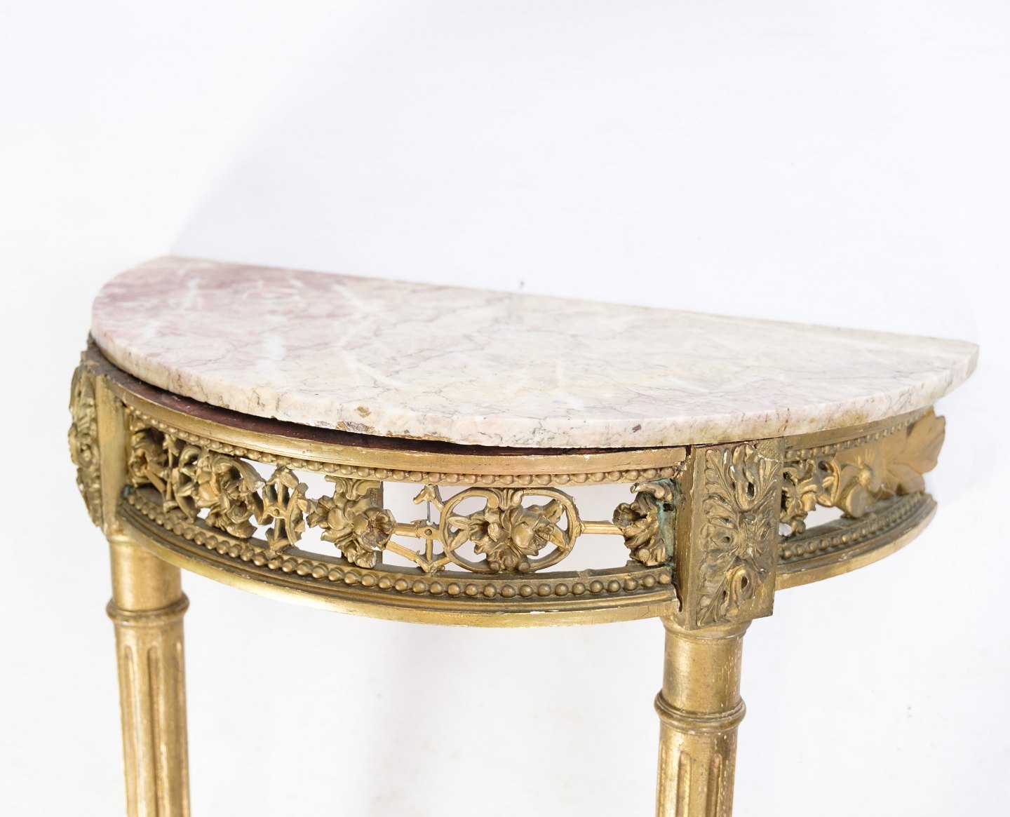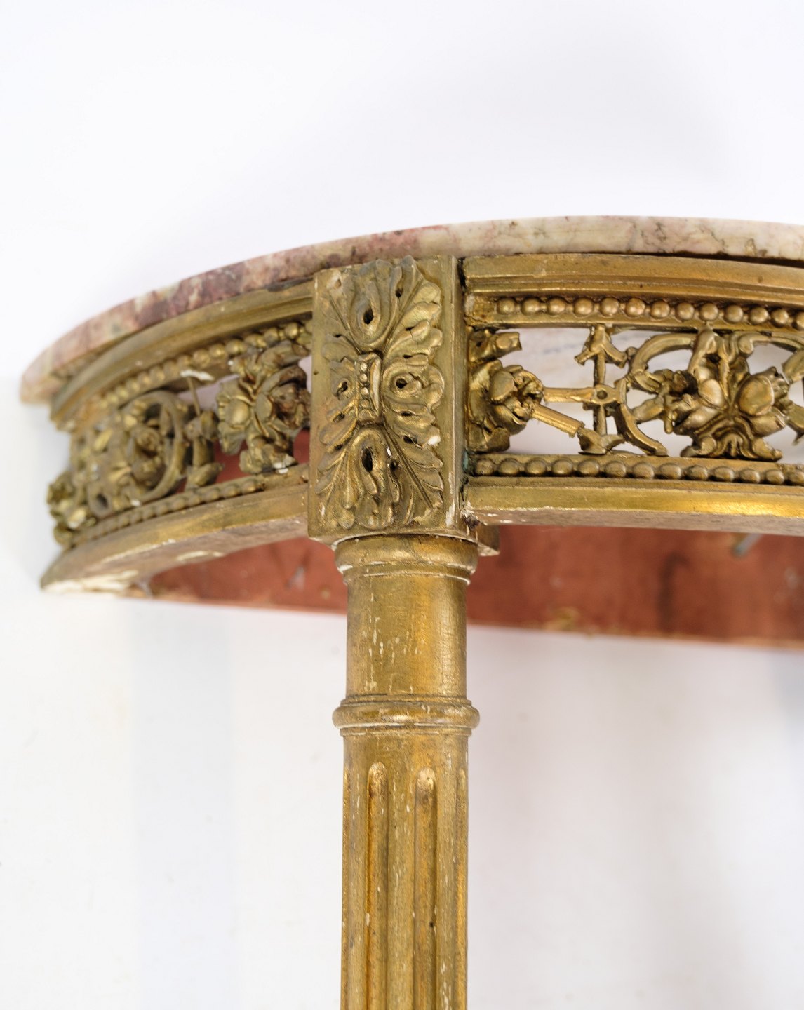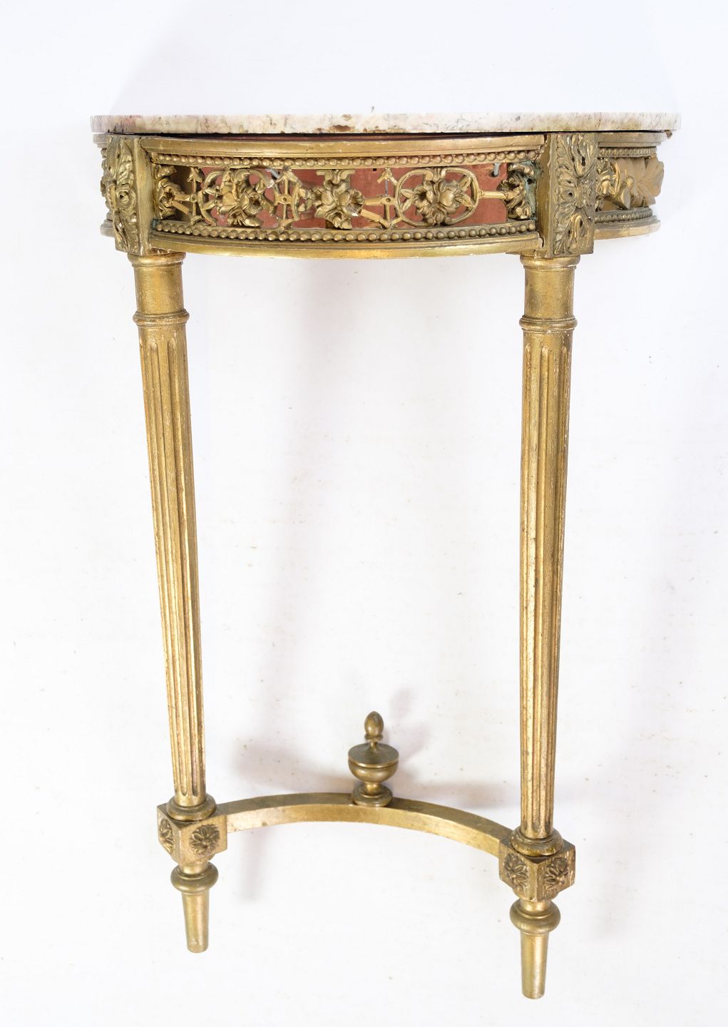 SolgtForgyldt konsolbord fra Danmark med hvid marmor plade fra perioden Louis Seize fra omkring år 1790'erne. Et konsolbord af meget høj kvalitet med meget historie.