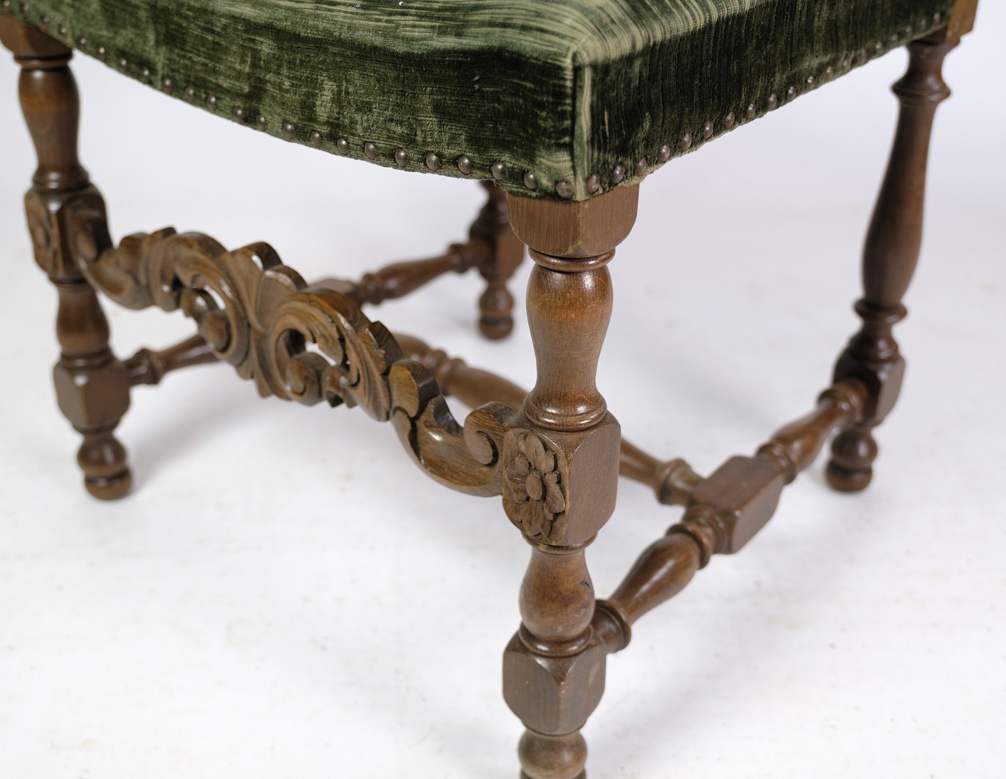 2 oak chairs in Renaissance style upholstered with green velor fabric from around the 1930s