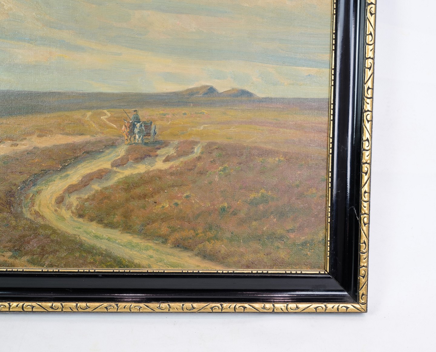 Oliemaleri på lærredet med motiv af landskab med sort ramme og bladguld fra omkring år 1930'erne.