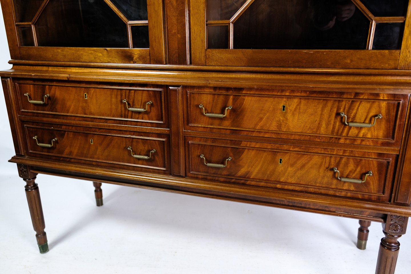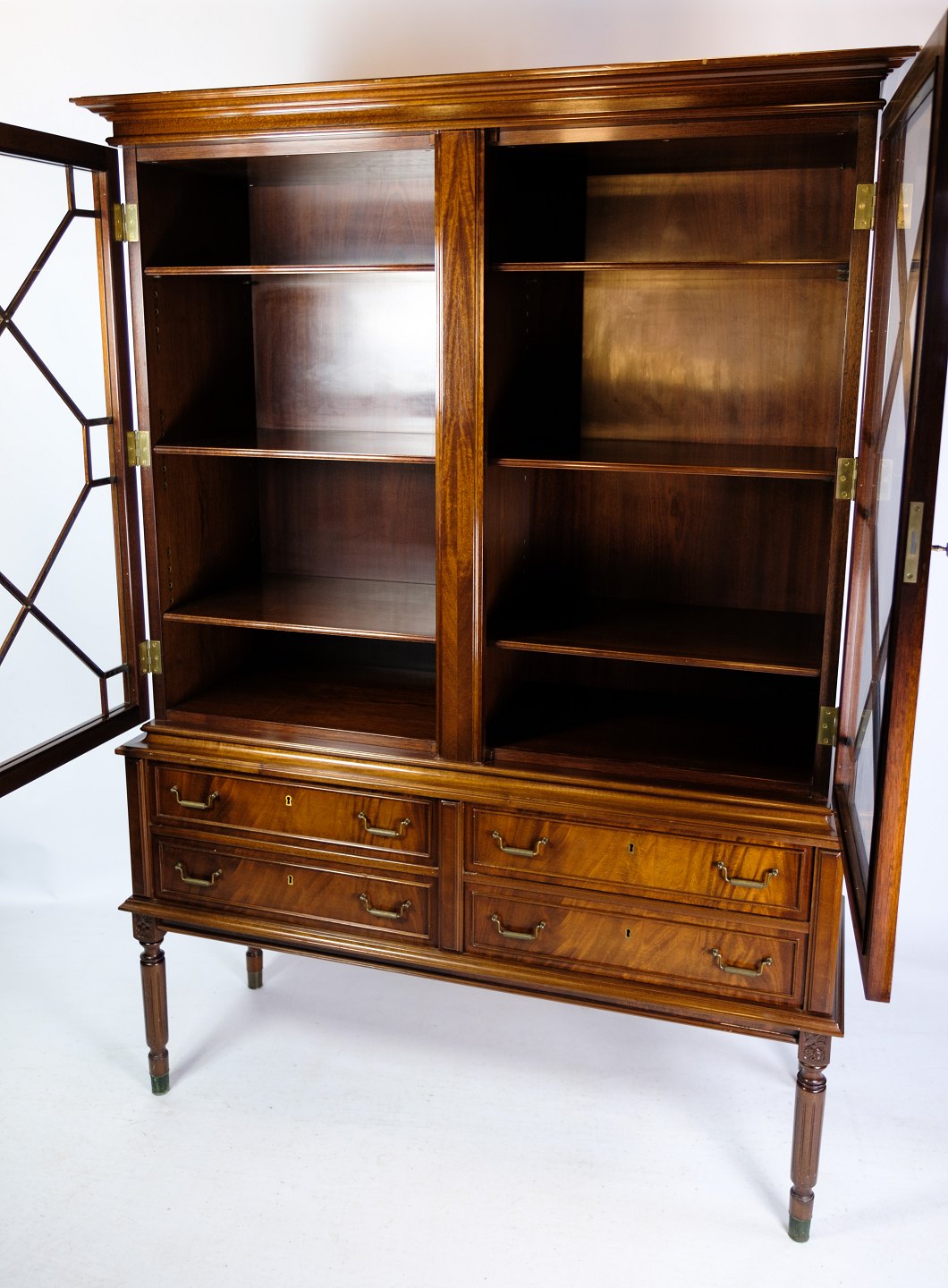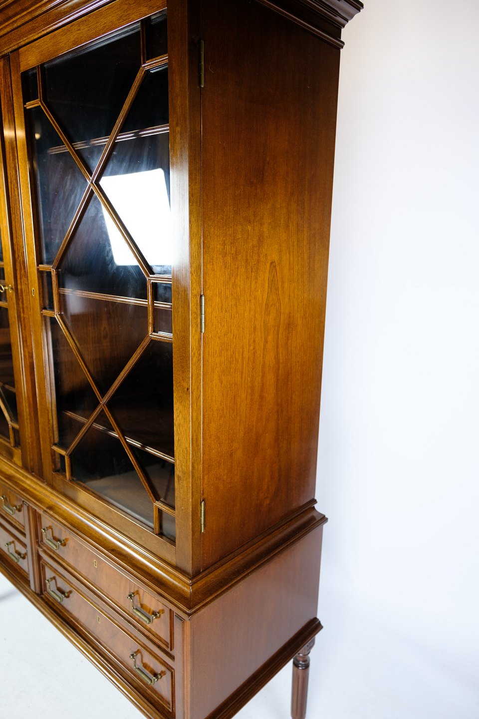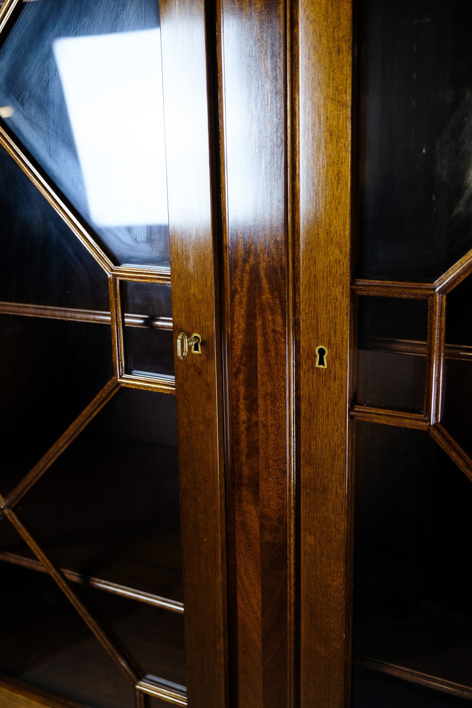 SolgtDette Hepplewhite-stil vitrineskab i mahogni, produceret af Farre Jensen omkring 1960'erne, udstråler elegance og tidløs skønhed.