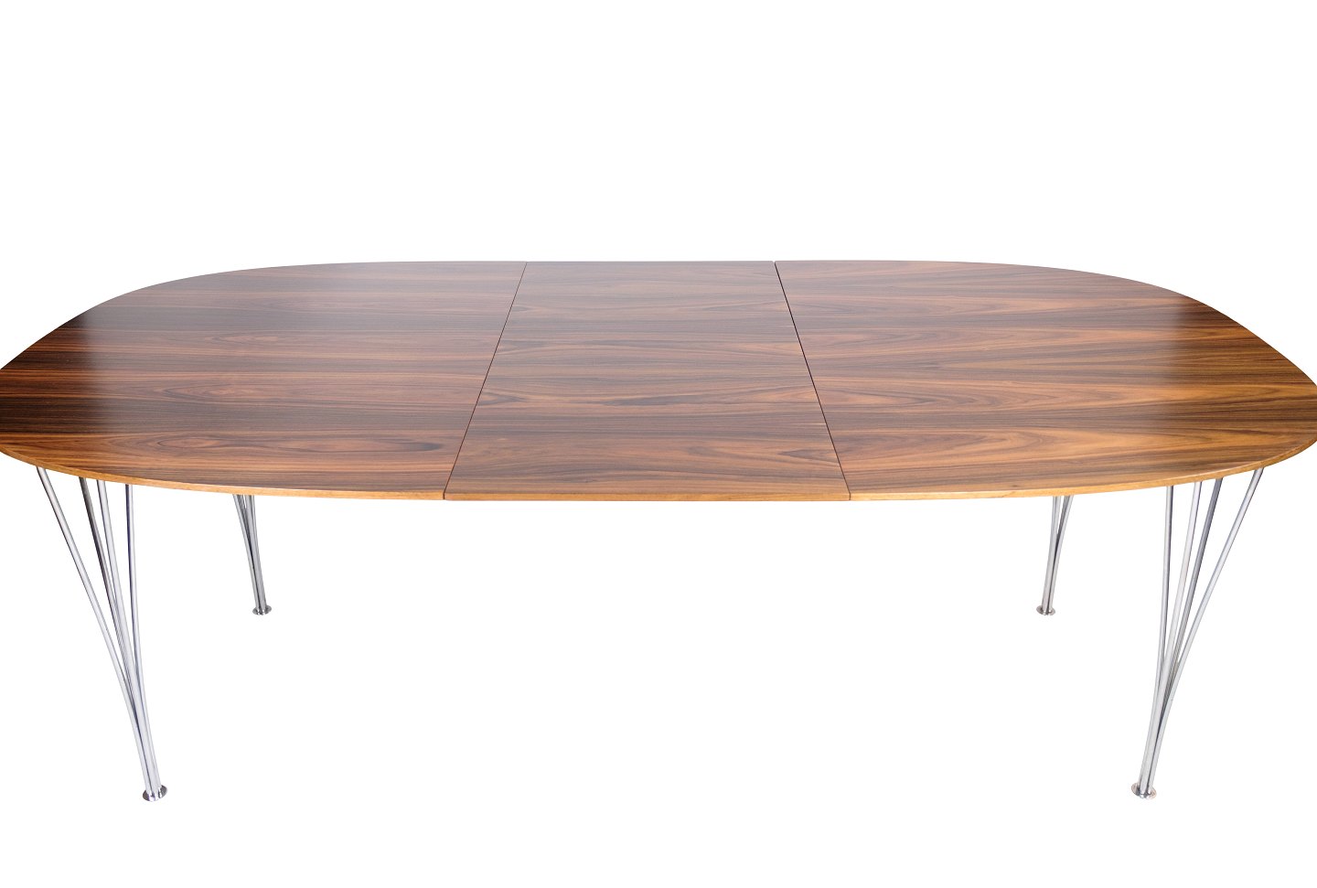 Dining table, designed by Piet Hein & Bruno Mathsson with rosewood veneer and steel legs produced by Fritz Hansen. The table is from the 1960s and is in incredibly nice condition.