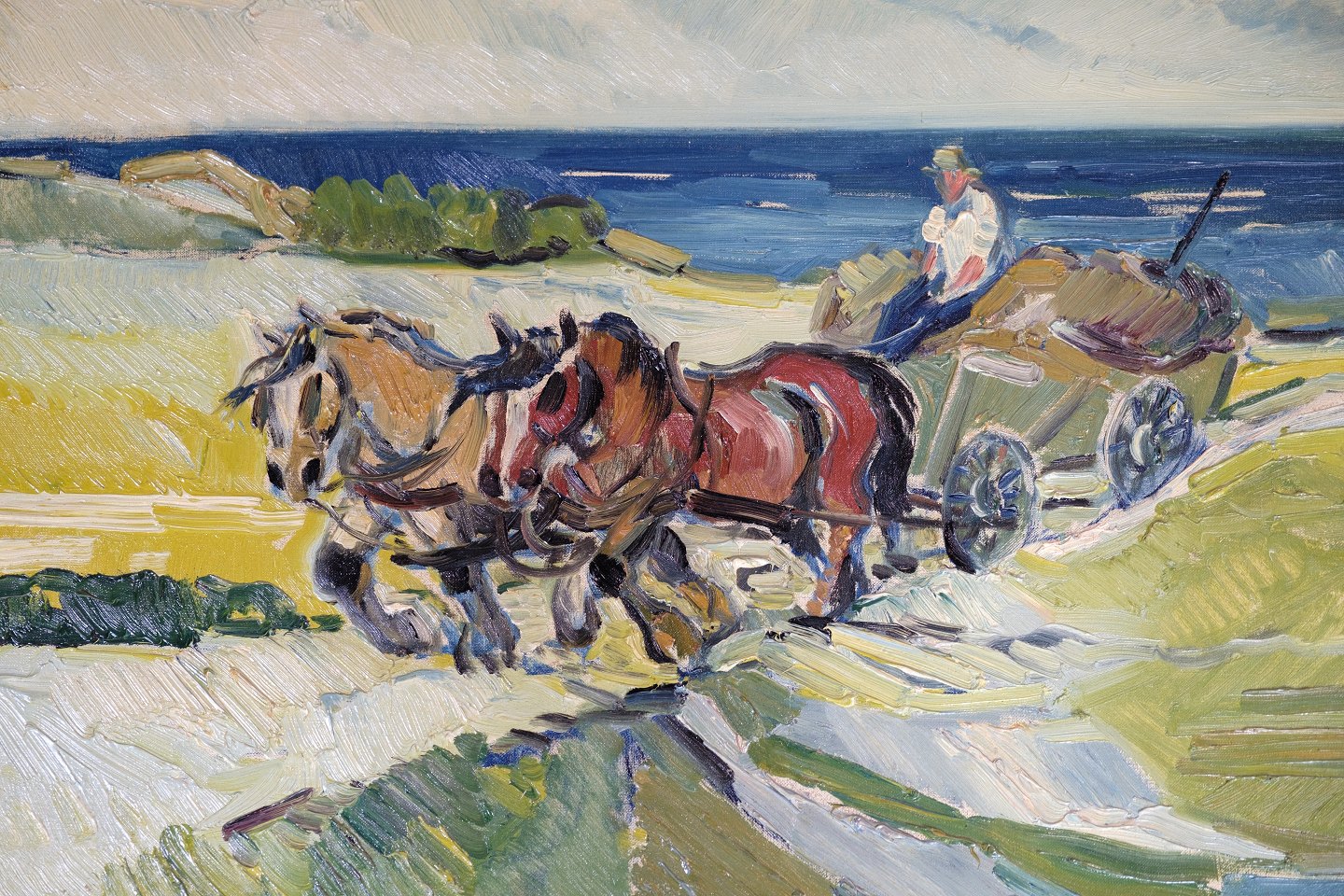Oil painting on canvas with motif of horses with carriage signed ÅS. Painted by Aage Strand, painter from 28/6-1910. The painting was on the artist's subsequent exhibition in 1942 to 54 at Charlottenborg.
