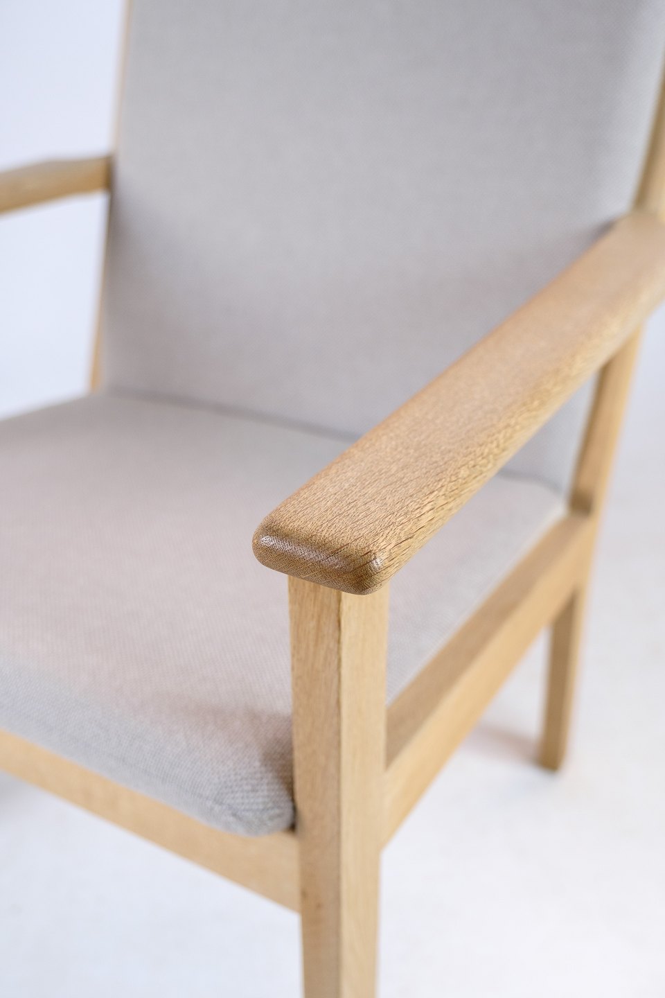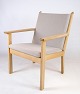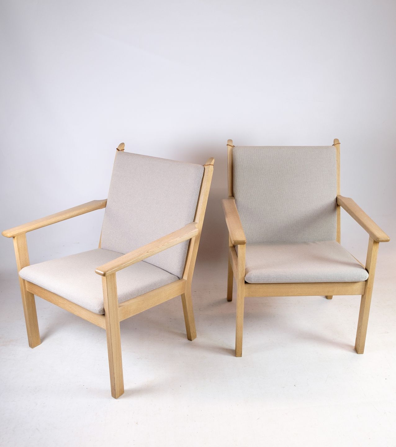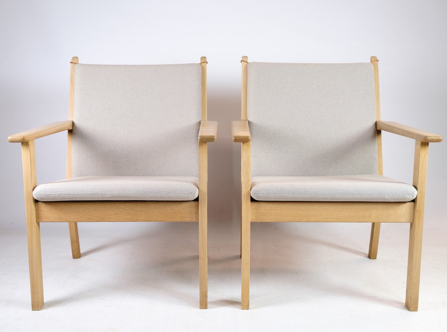 SoldSet of 2 armchairs, model GE284, designed by Hans J. Wegner manufactured by Getama in the 1960s. The chair appears in a nicely used condition with cushions upholstered in light gray fabric. Getema is the concept of the finest quality for this Hans J. Wegner with some of the finest designs of chairs. The collaboration between Hans J. Wegner began with Gedsted Tang and Madrasfabrik after which they had their international breakthrough. In 1953, they decided to change their name to Getama.