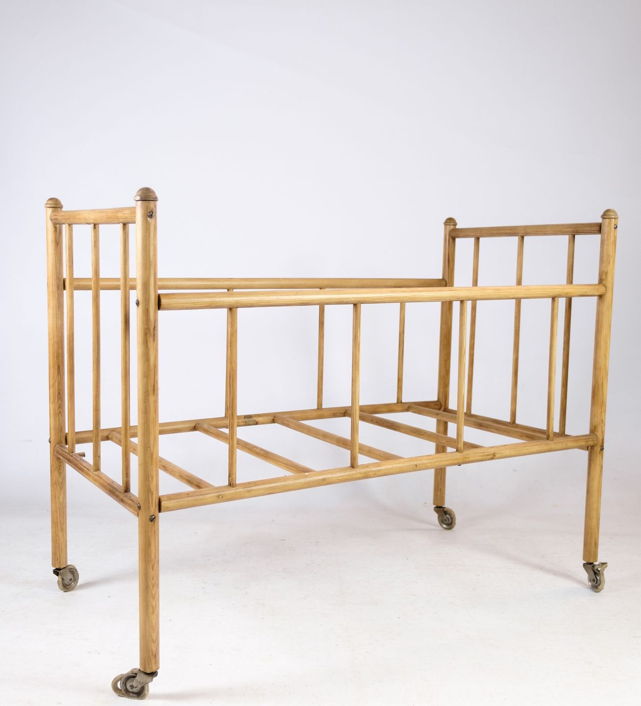 Antik barneseng i lyst fyrretræ med hjul fra omkring år 1920'erne.