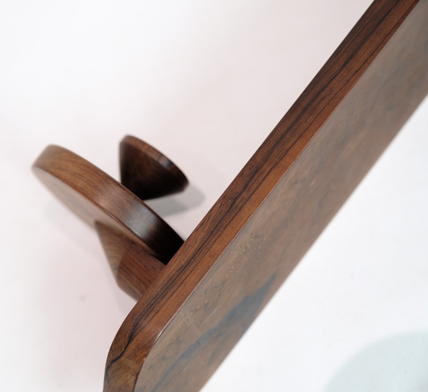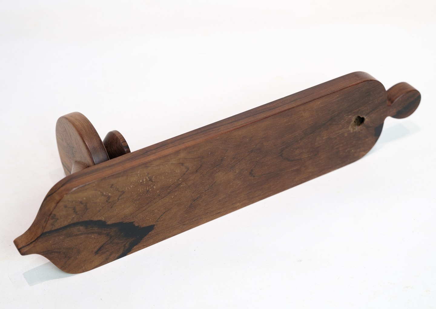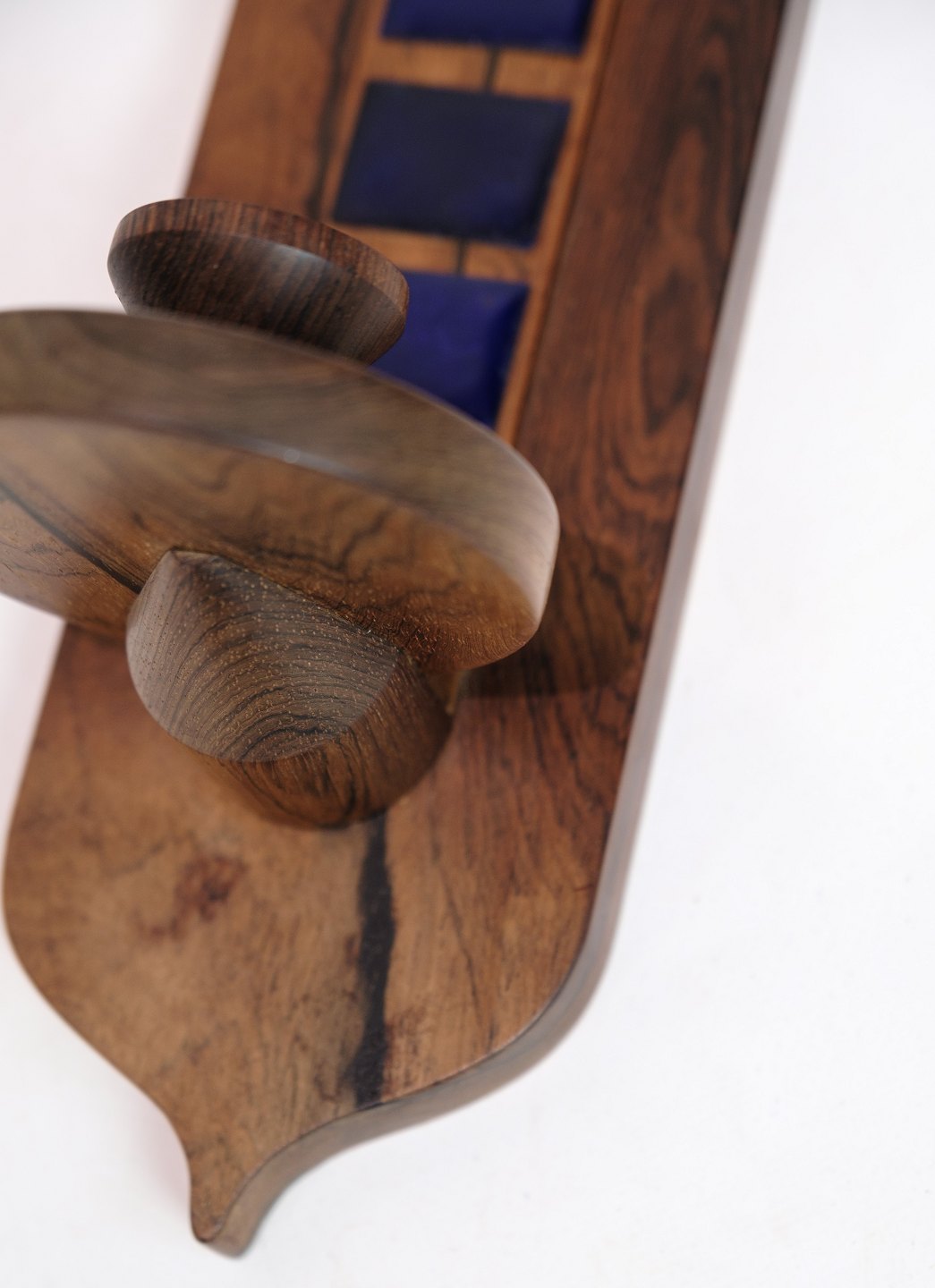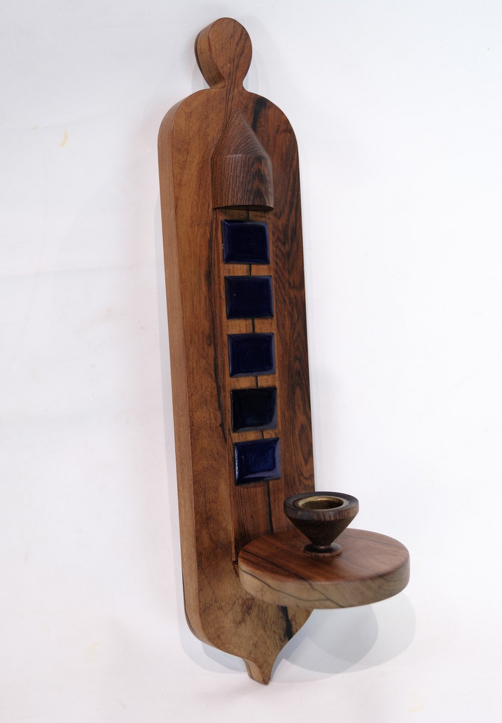 Væglysestage i træsorten palisander med indlæg i blålige farver fra omkring år 1960'erne.