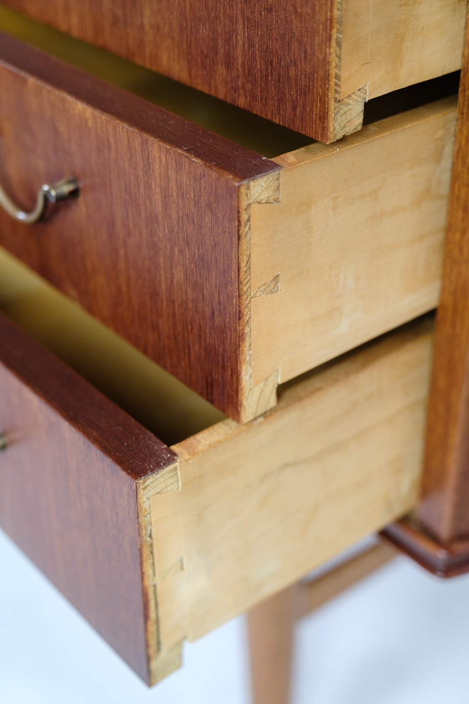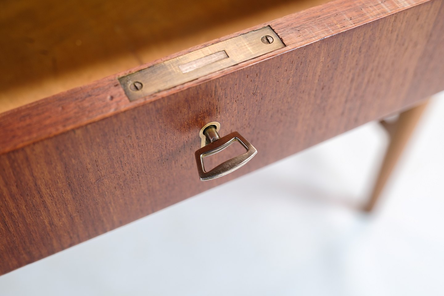 Skrivebordet, du beskriver, er et godt eksempel på dansk møbeldesign fra 1960'erne, hvor funktionalitet og enkelhed var i fokus. Med tre skuffer i hver side er der god opbevaringsplads, og det slanke design giver skrivebordet et moderne udseende.