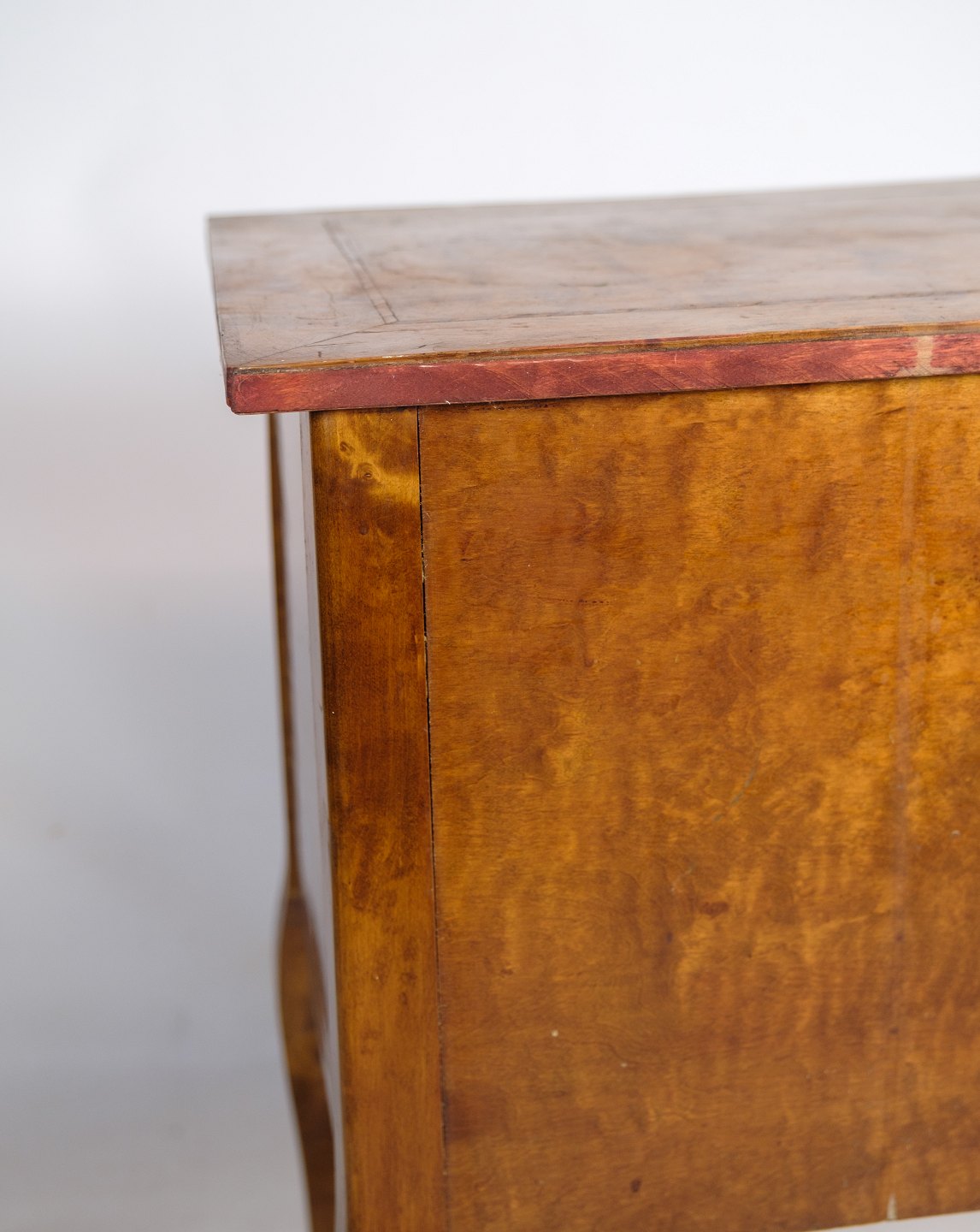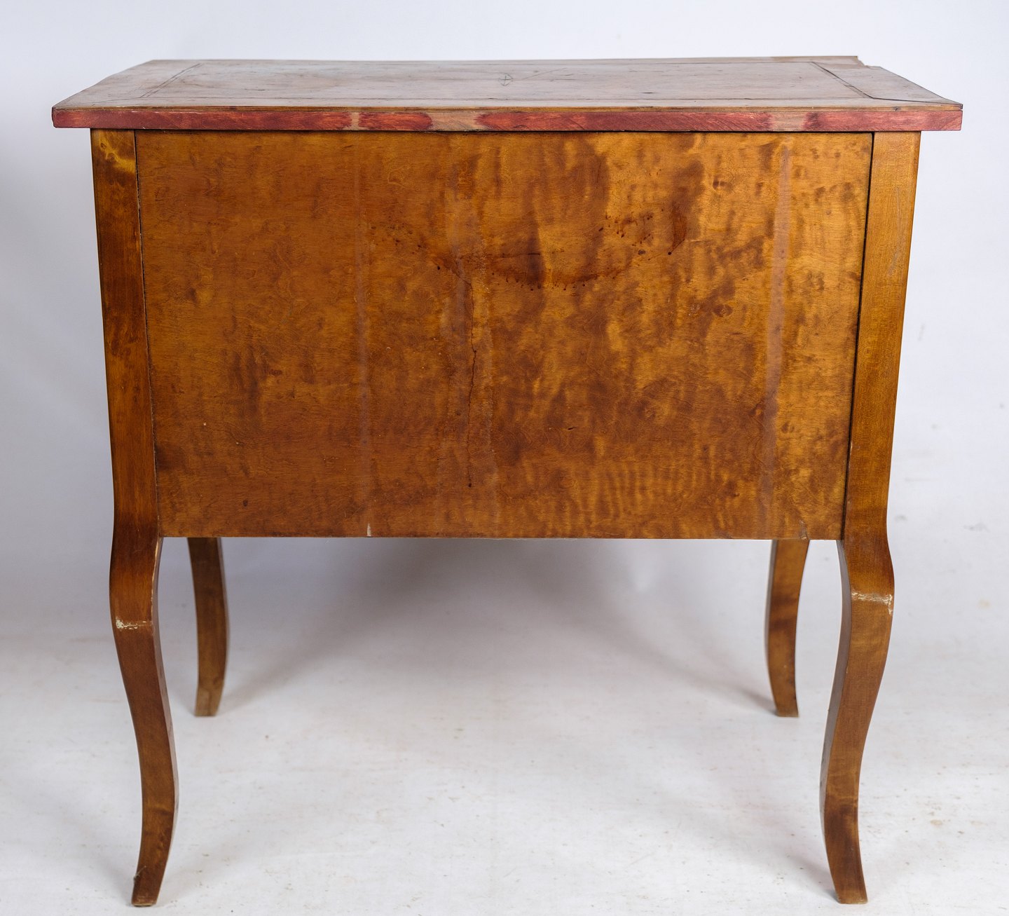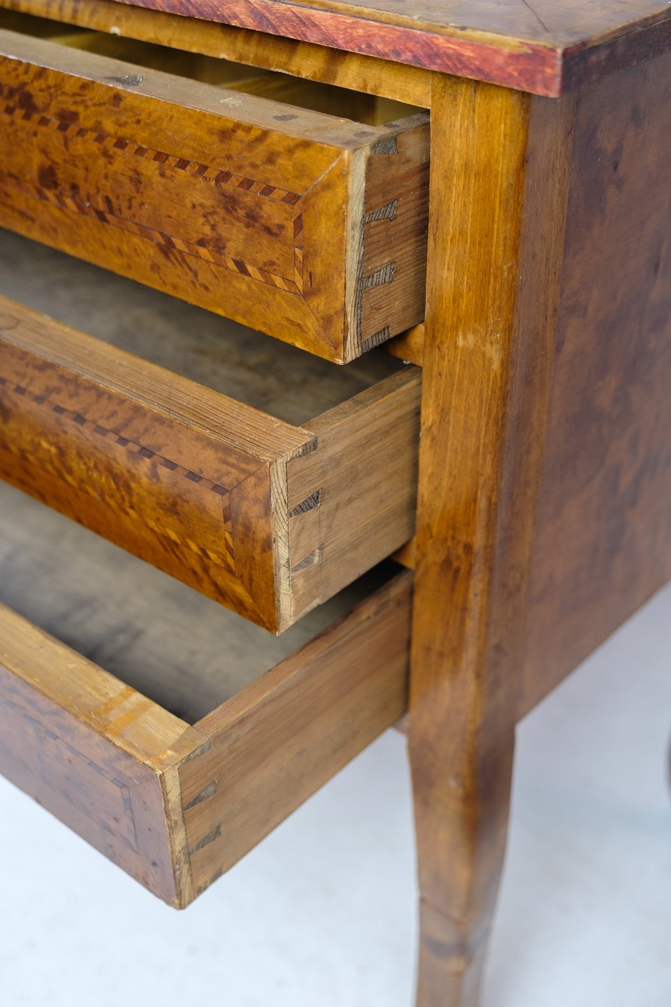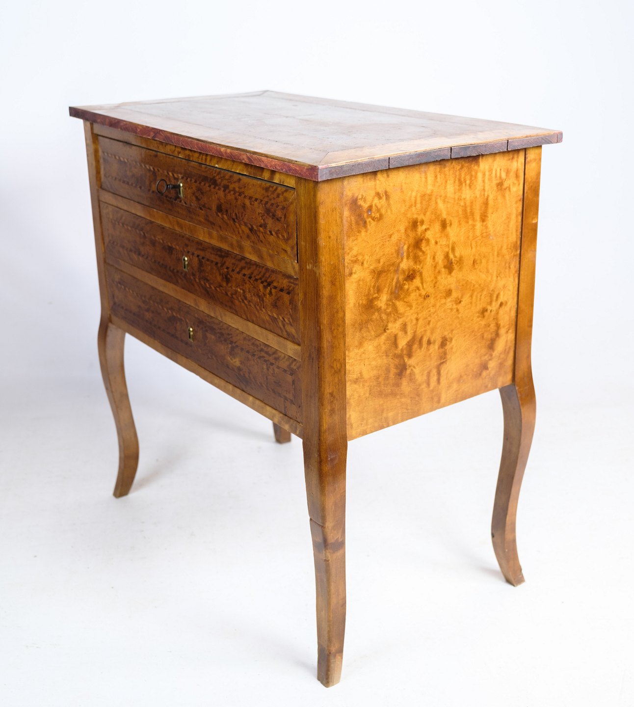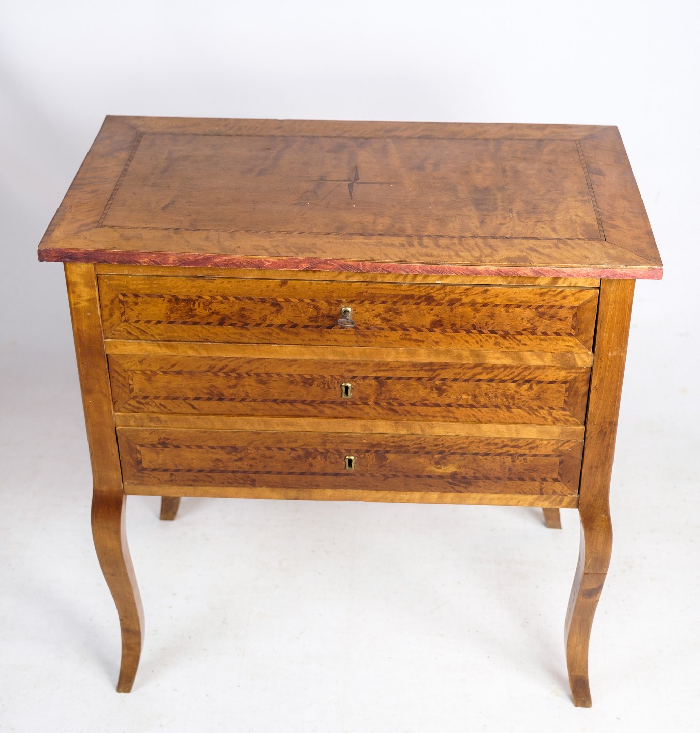 SoldAntique chest of drawers in walnut with marquetry and brass keyholes from around the 1920s. Key included.