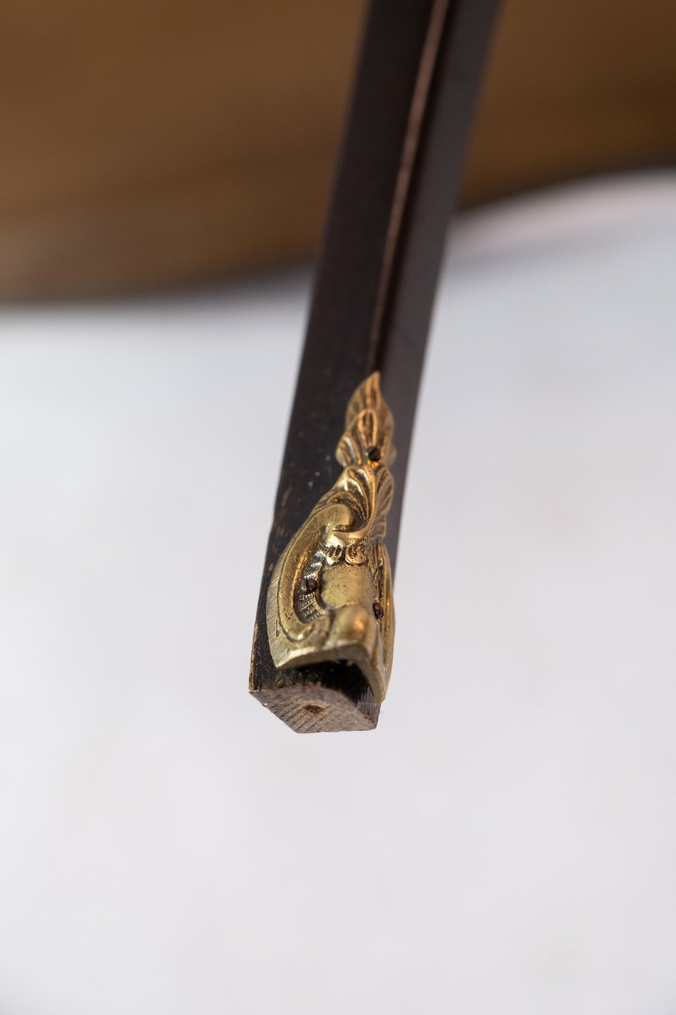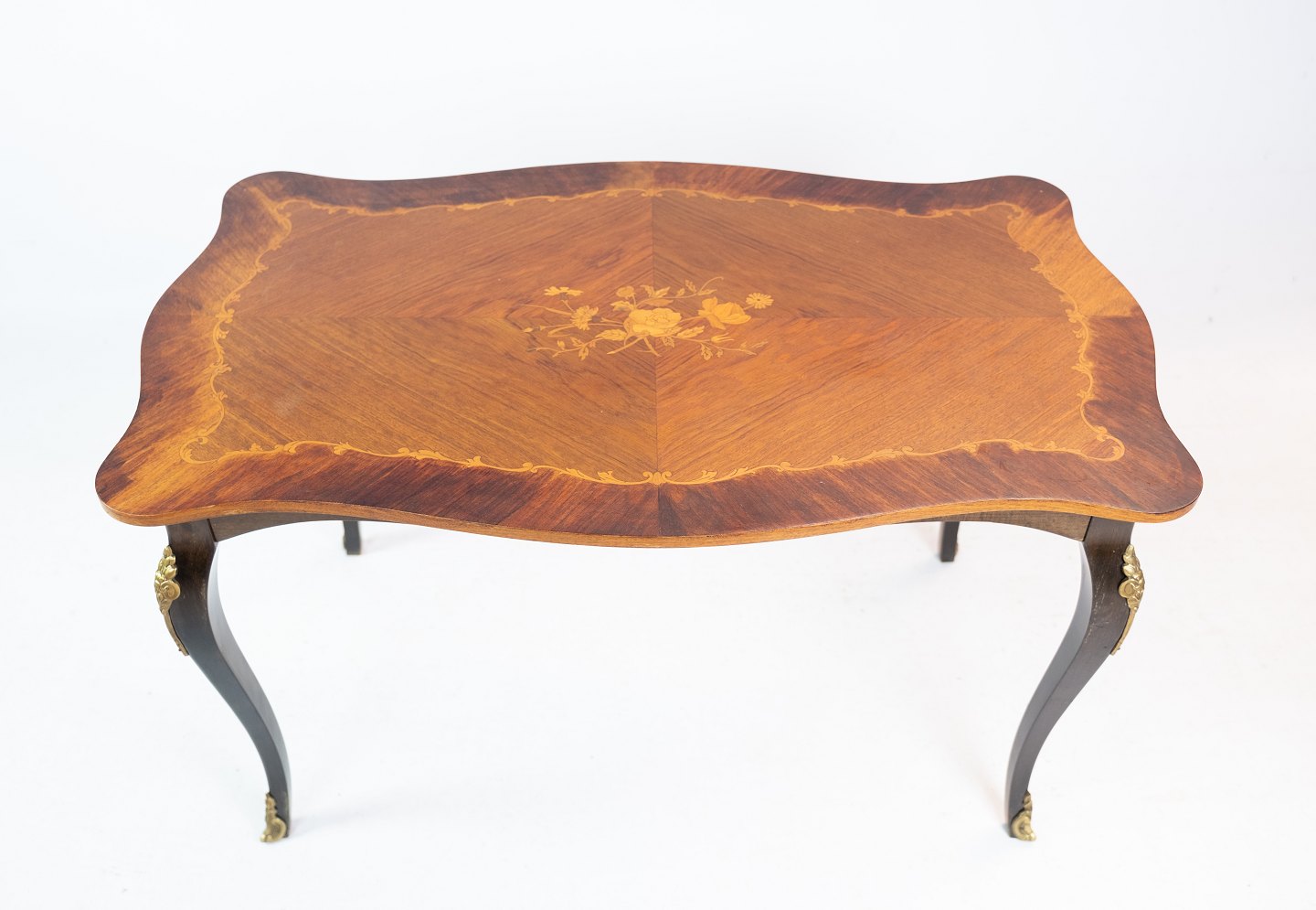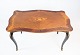 Antikt sofabord af rococo stil med ben af bejdset træ med messing dekoration og overflade i rosentræ med intarsia fra omkring 1930'erne.