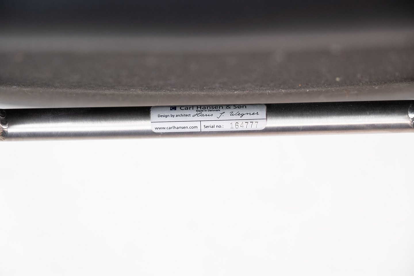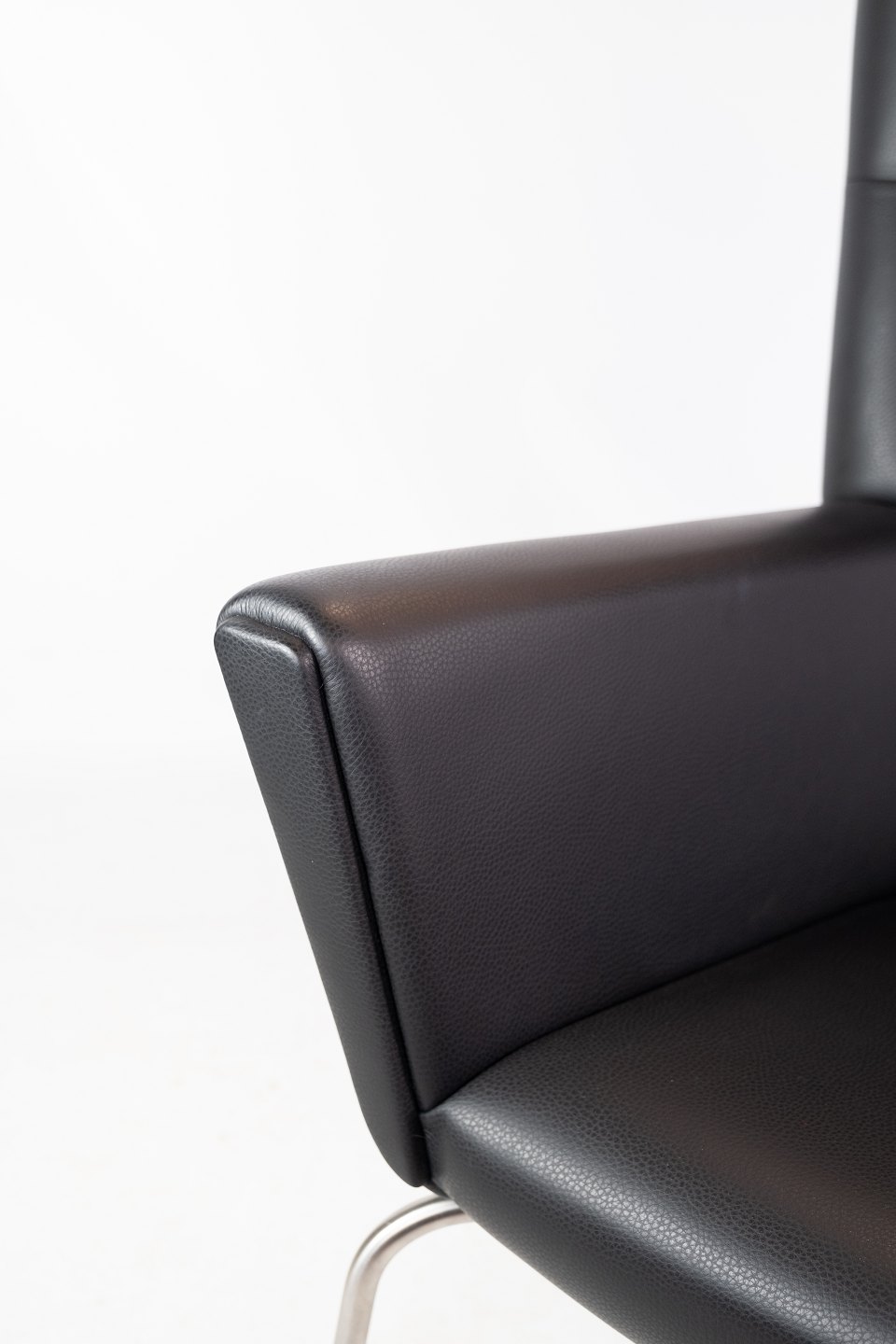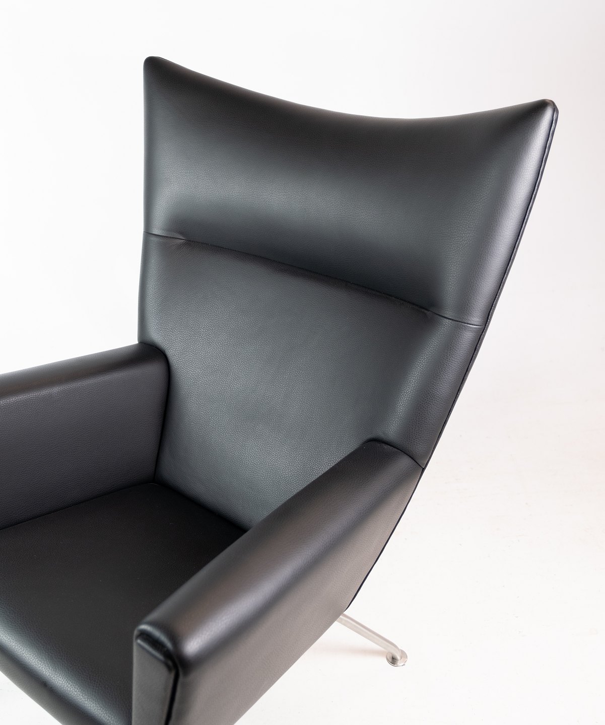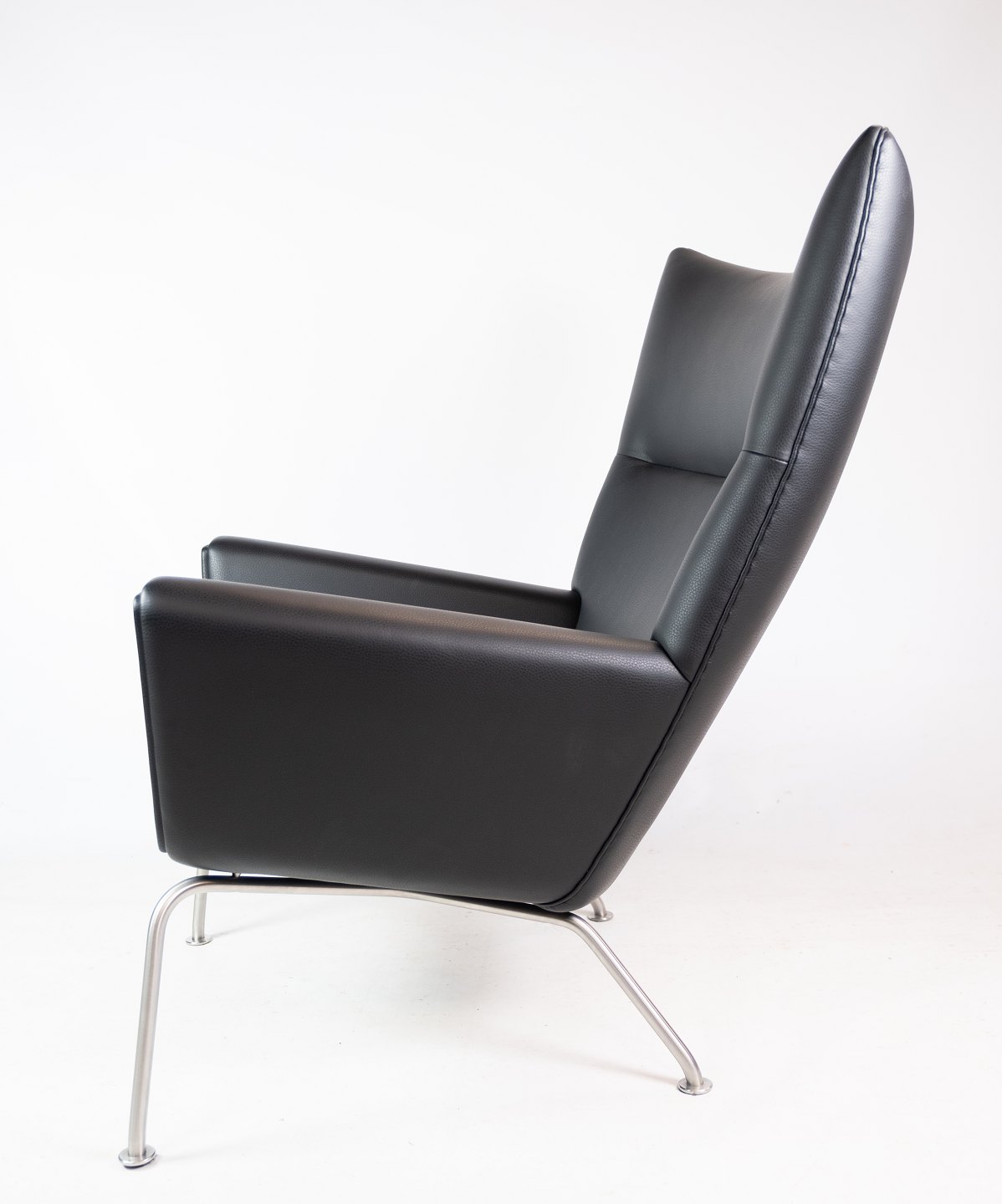 SoldWing chair armchair, model CH445, in brushed steel and black leather. Originally, the Wing Chair was only produced in a very limited number. Carl Hansen & Søn resumed production in 2006 based on the original 1:1 drawings by Hans J. Wegner.