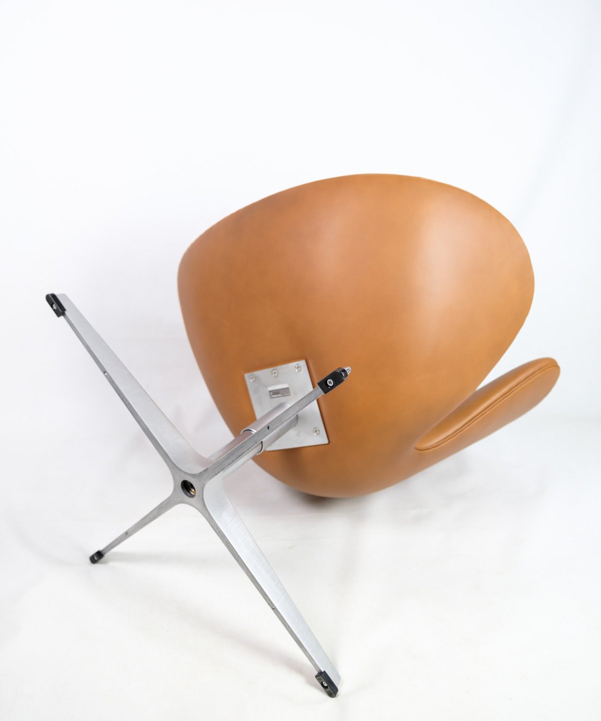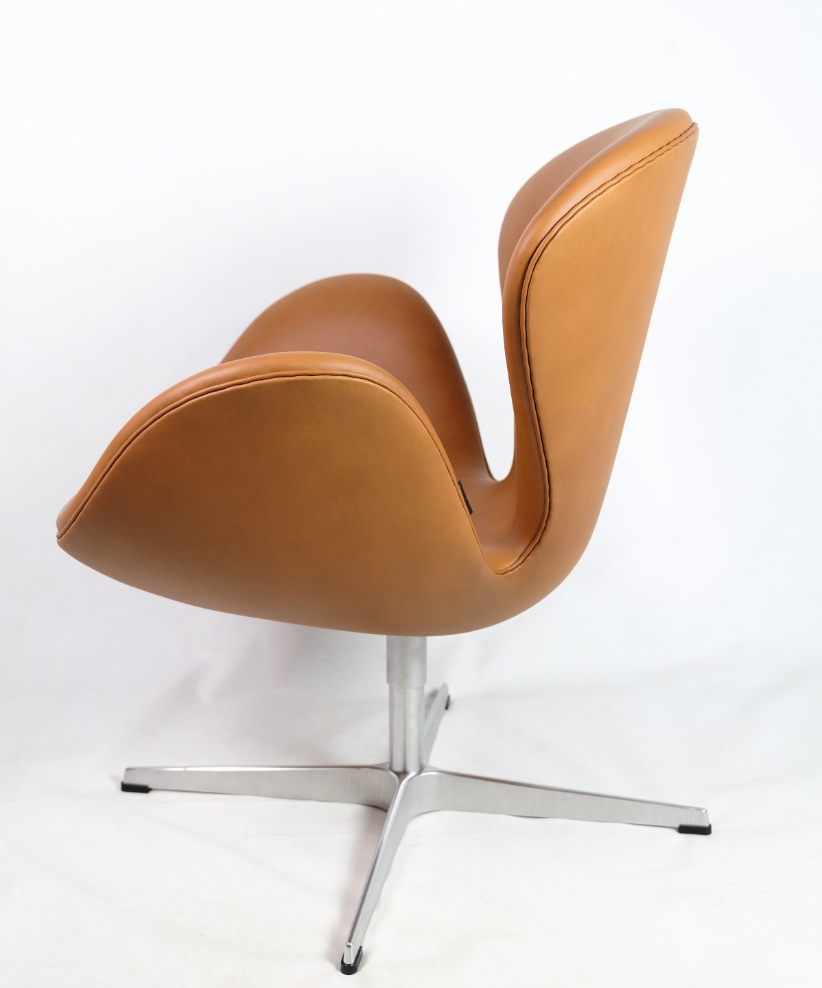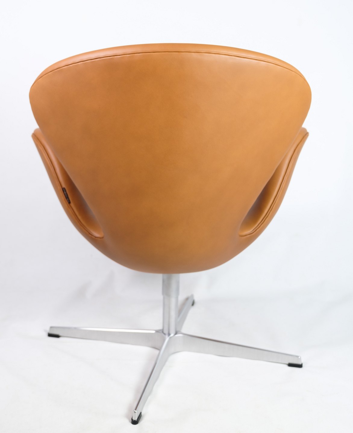 Svanen, model 3320, designet af Arne Jacobsen fremstillet hos Fritz Hansen og formgivet i 1957-1958. Lænestolen står med originalt læder af den højeste kvalitet og i fremragende stand. Stolen er drejelig, med føder af aluminium.