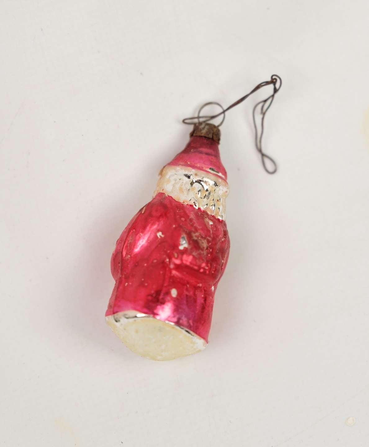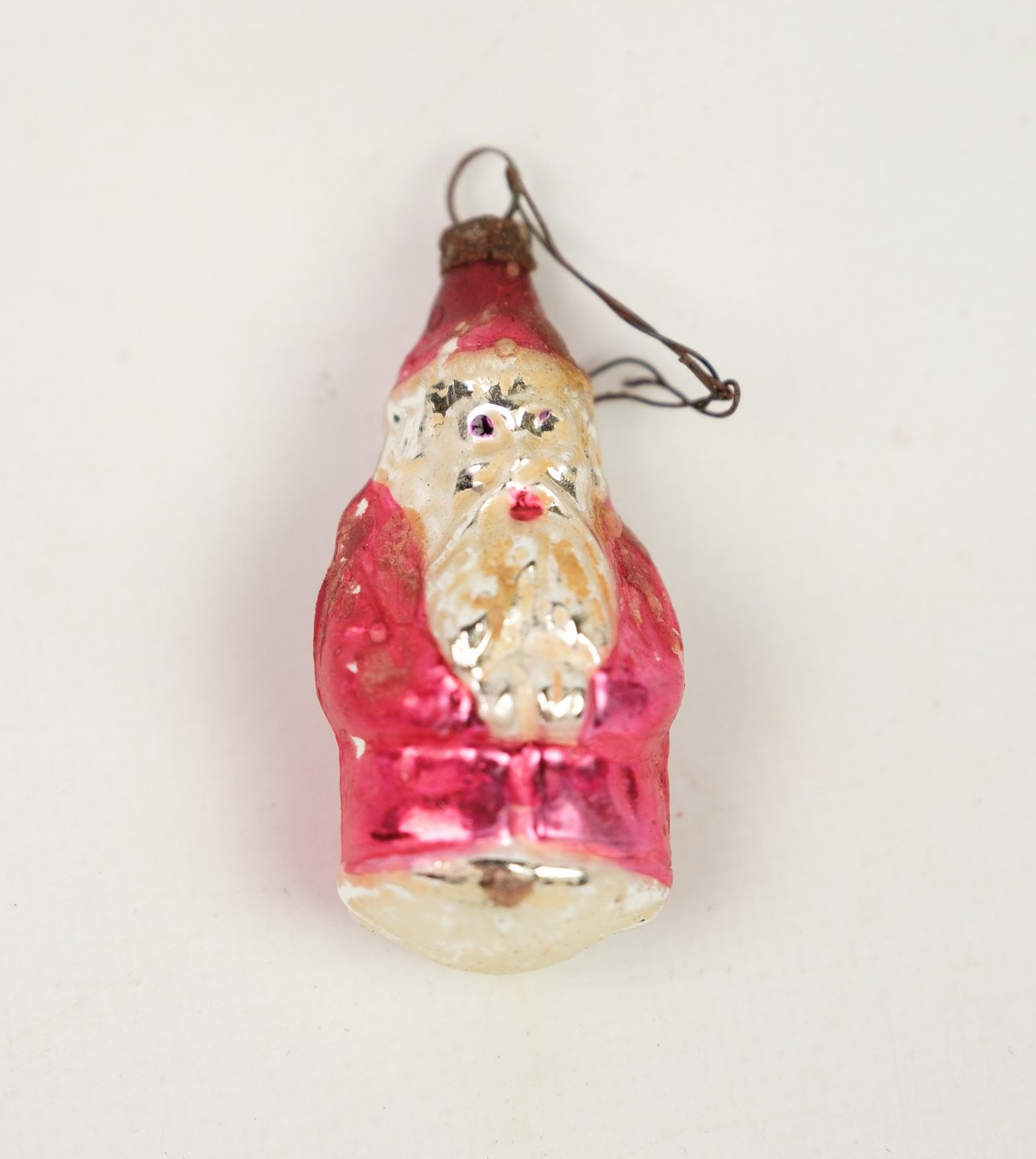 Antique Christmas ornament of a pair of Santas in a red color from around the 1930s.