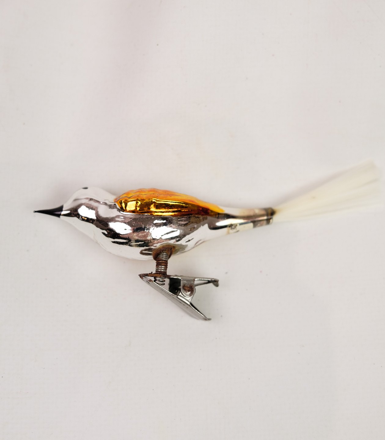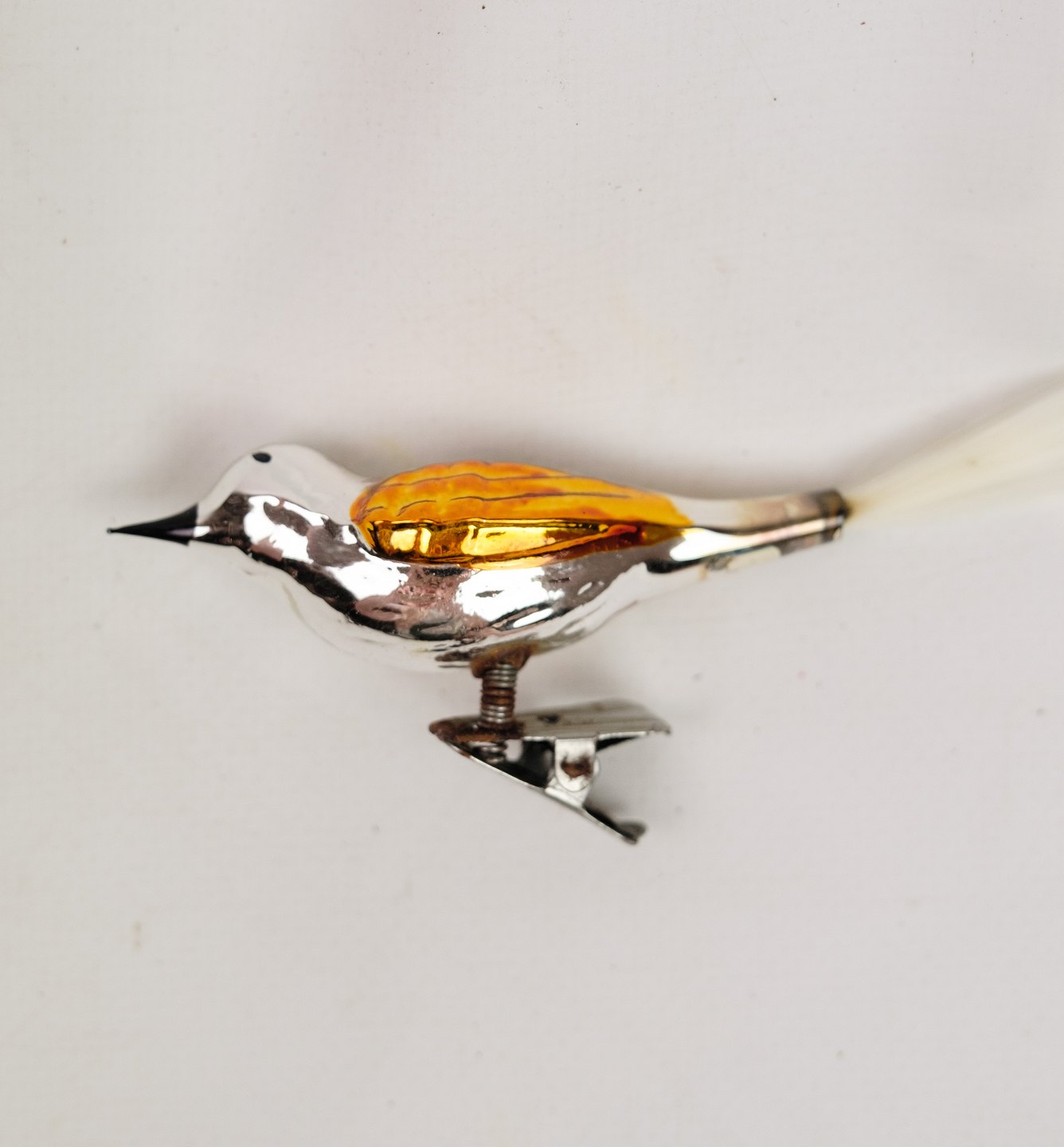 Gammelt julepynt af håndmalet glas fugl fra omkring år 1930'erne.