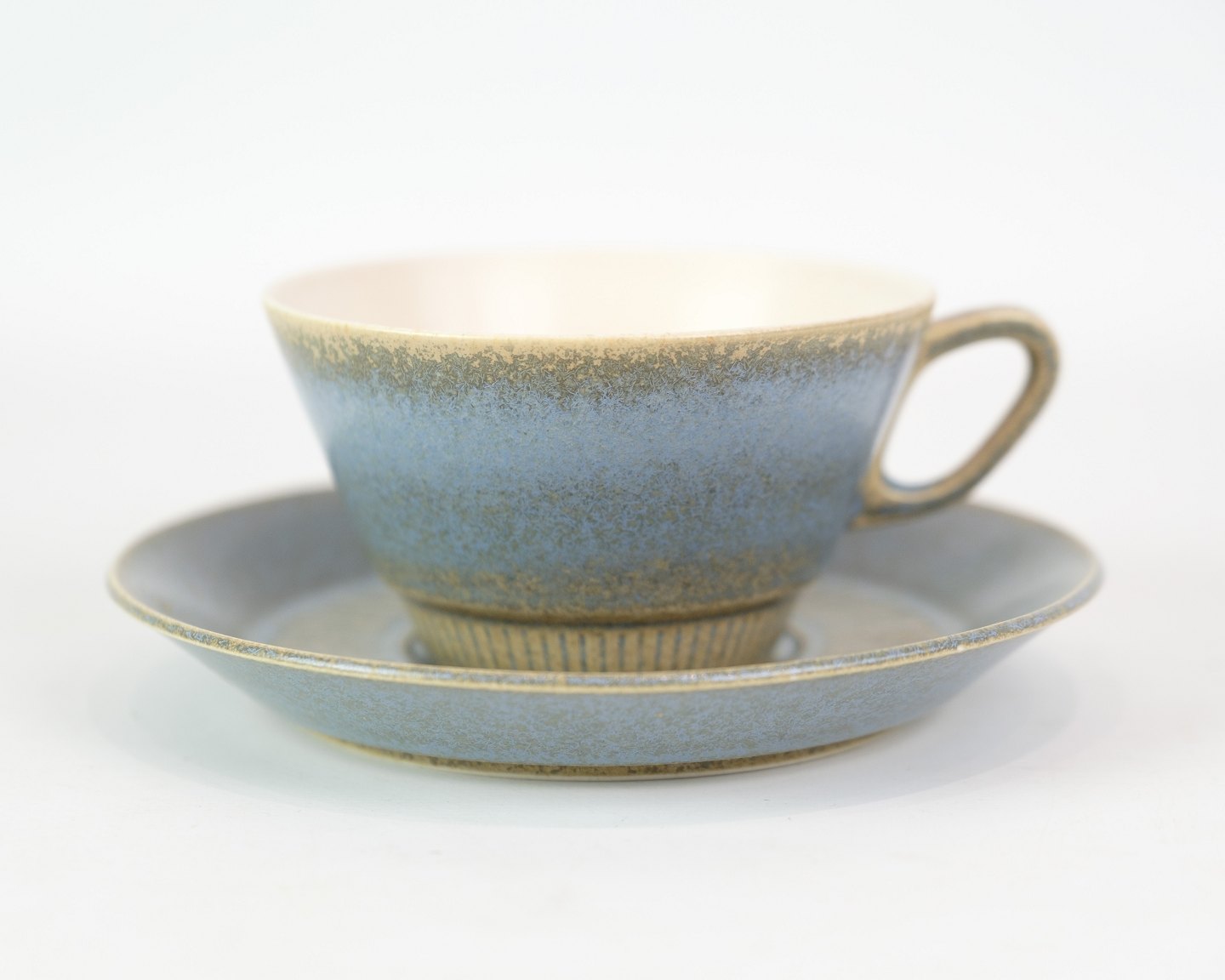 Kaffekopper med underkop i stentøj af Nødebo i blå farver fra omkring 1970'erne.