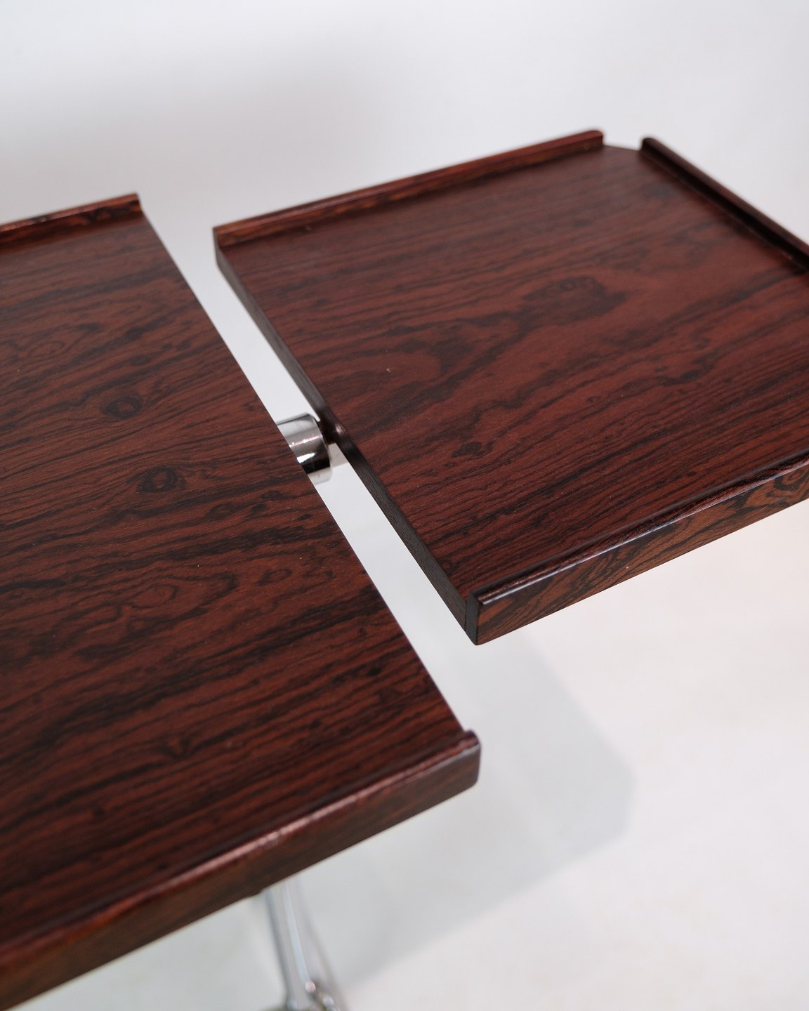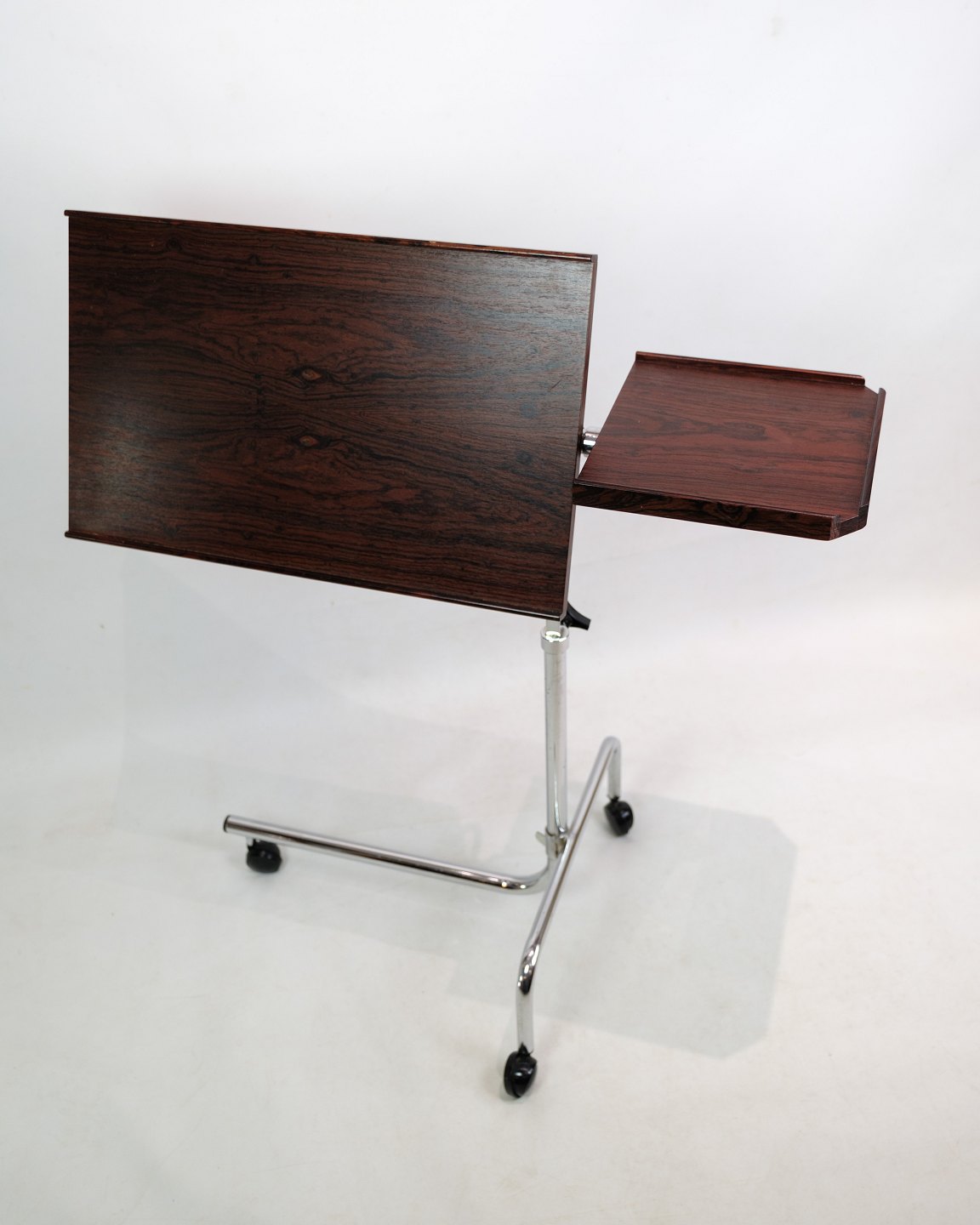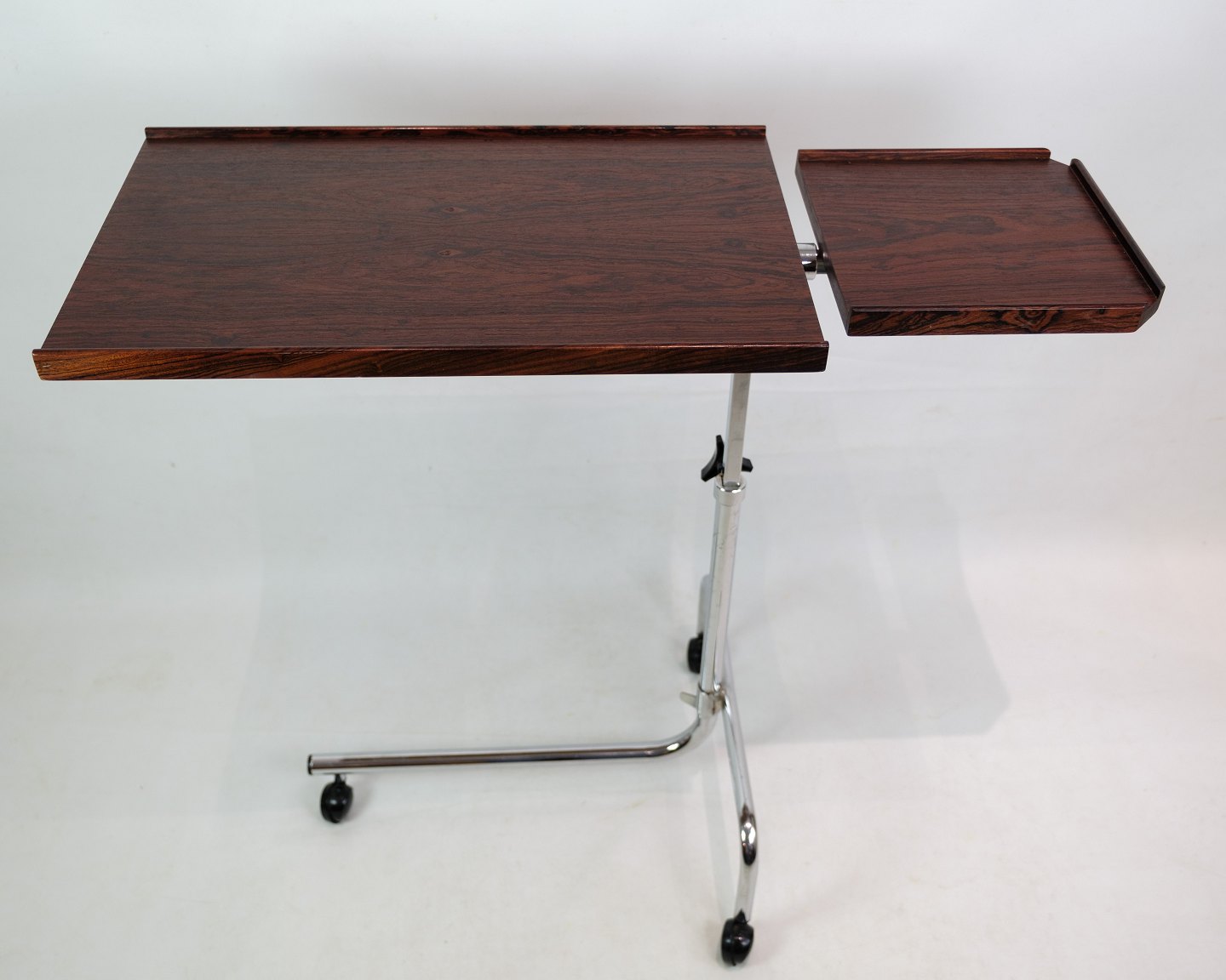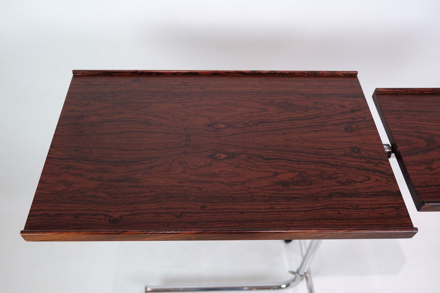 SoldAdjustable sideboard in rosewood wood with polished chrome frame of Danish design from around the 1960s. Will make a nice bedside table, end table, TV table or work table. Small side table is removable. Sits on wheels for easy movement.