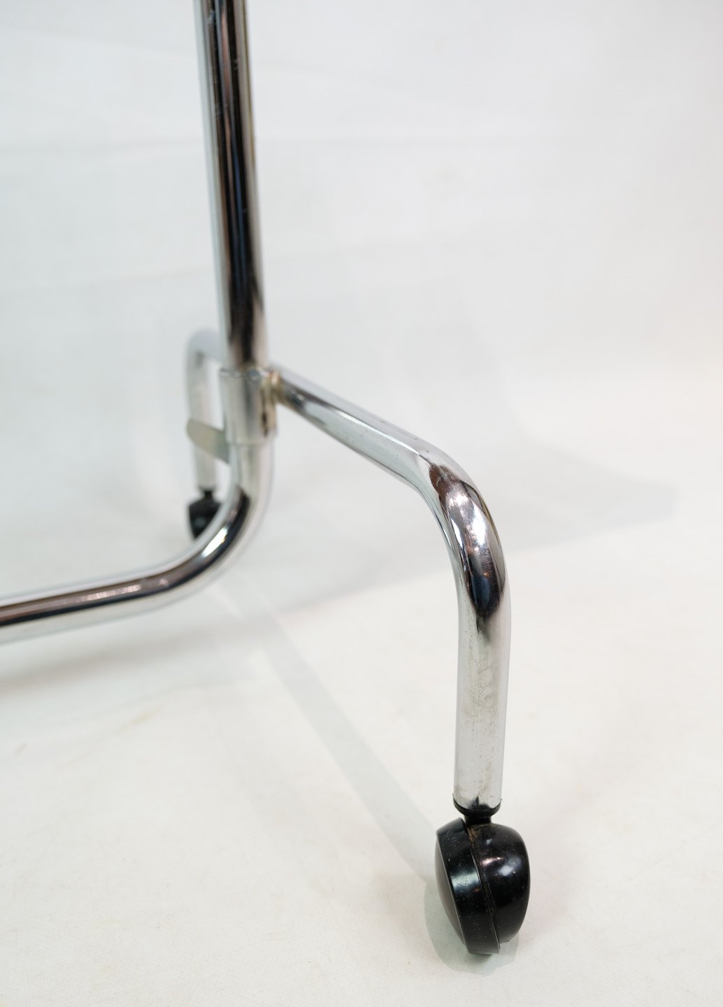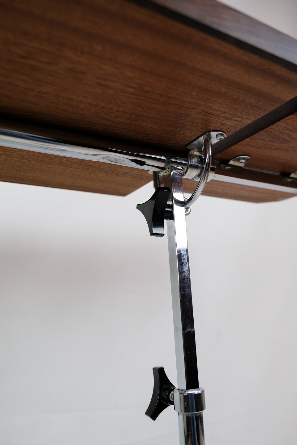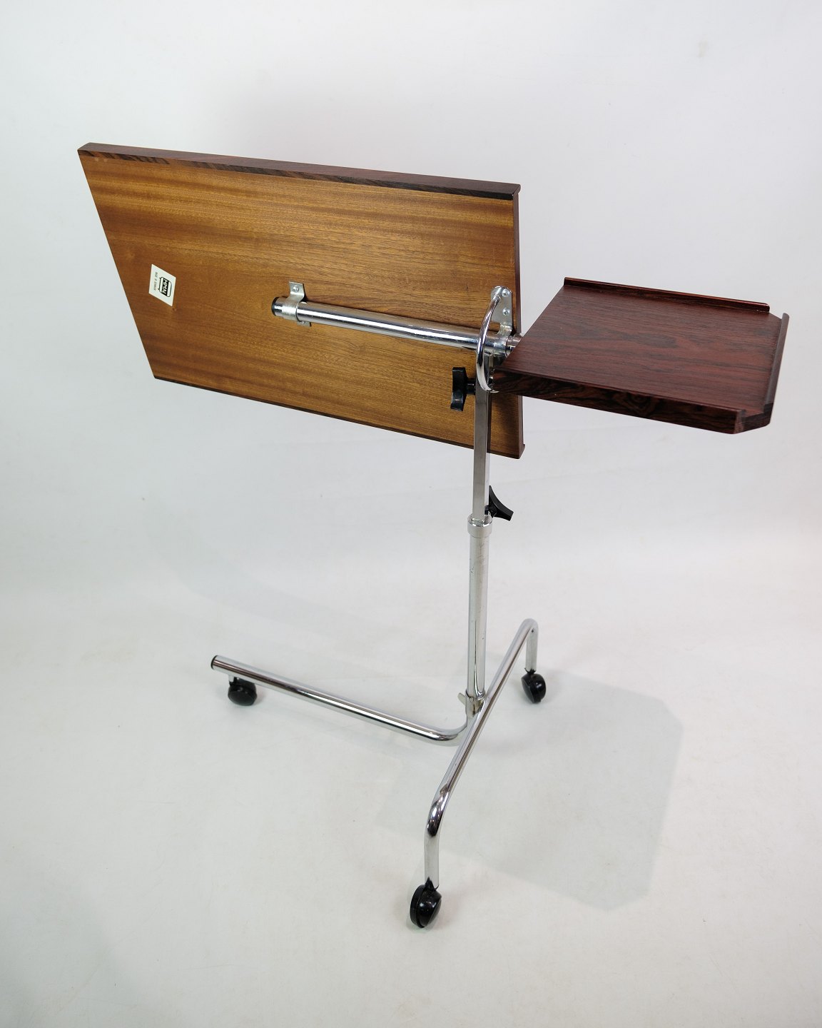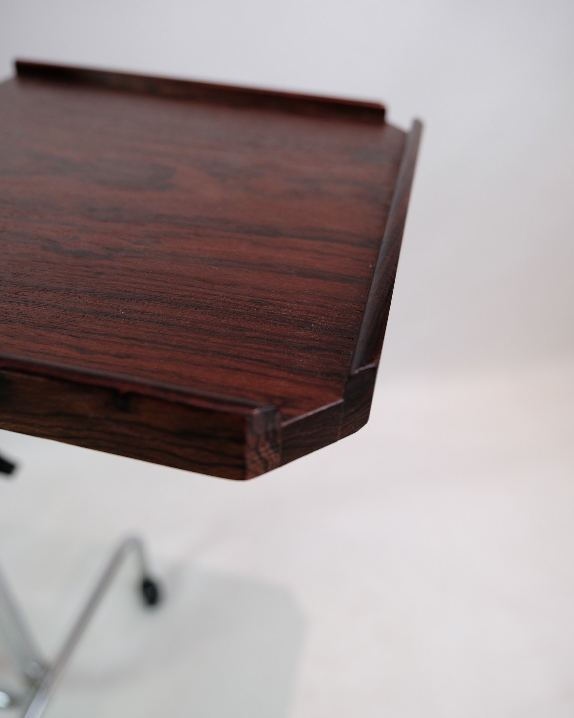 SoldAdjustable sideboard in rosewood wood with polished chrome frame of Danish design from around the 1960s. Will make a nice bedside table, end table, TV table or work table. Small side table is removable. Sits on wheels for easy movement.