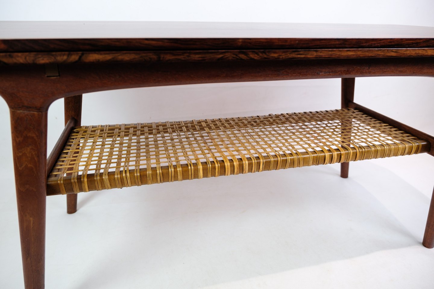 SoldCoffee table in rosewood by Heltborg Møbler Denmark with underlying wicker hearth from around the 1960s. The coffee table also has pull-out plates on each side, which make it 47 cm and 87 cm wide respectively.