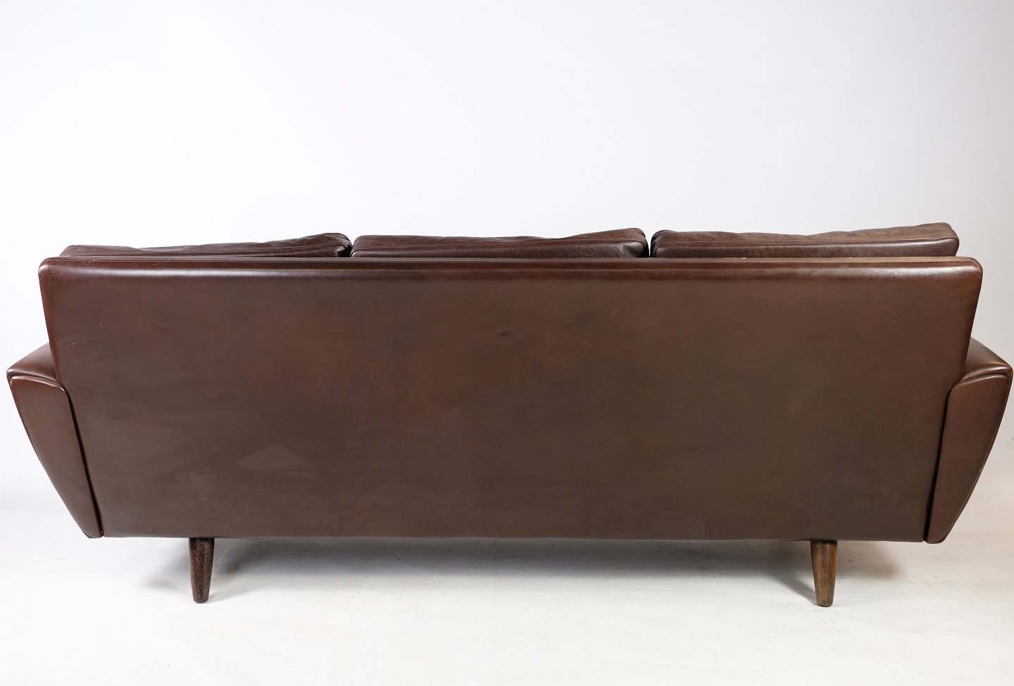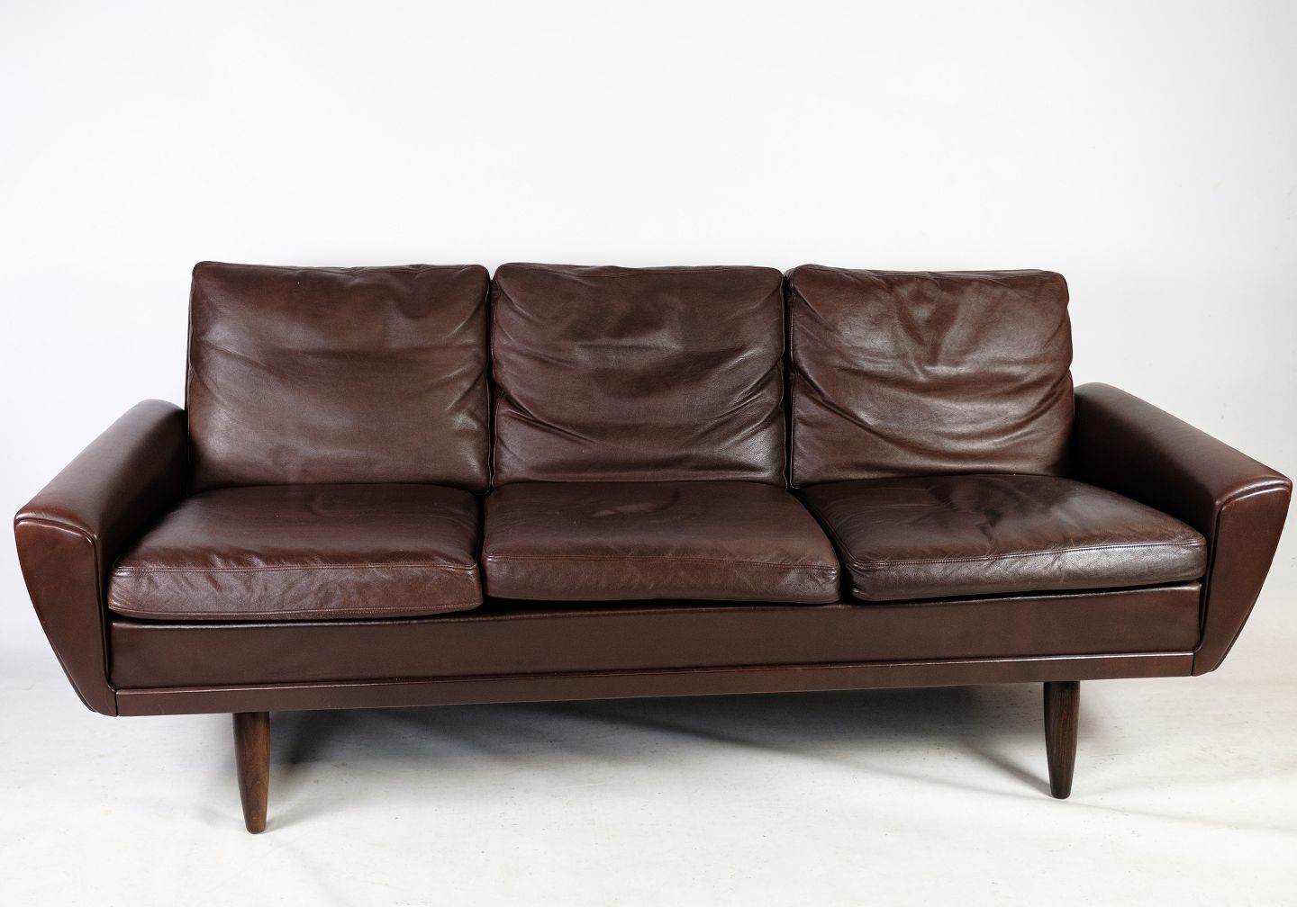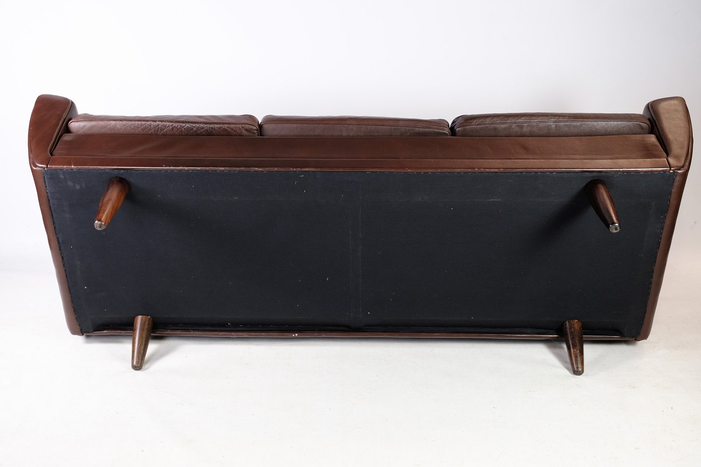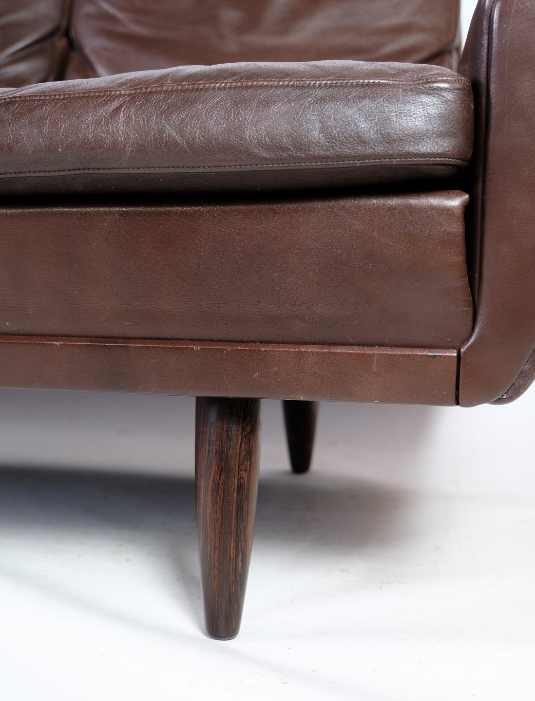 This elegant Brown leather sofa, model 64, was designed by Georg Thams and manufactured by Vejen Polstermøbelfabrik in Denmark in the 1960s. The sofa is made with solid rosewood feet, which gives a beautiful and durable finish. The leather is of high quality and will age beautifully over time, while the solid rosewood feet add a touch of elegance to the sofa. With its timeless design and high quality, this sofa will be an excellent choice for any decor.