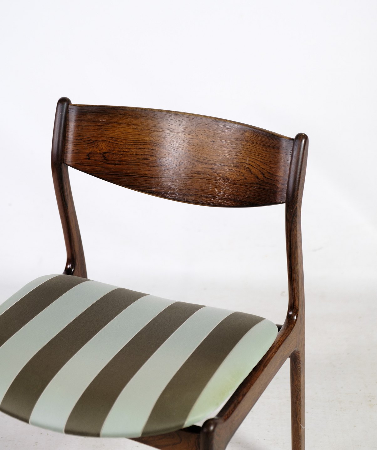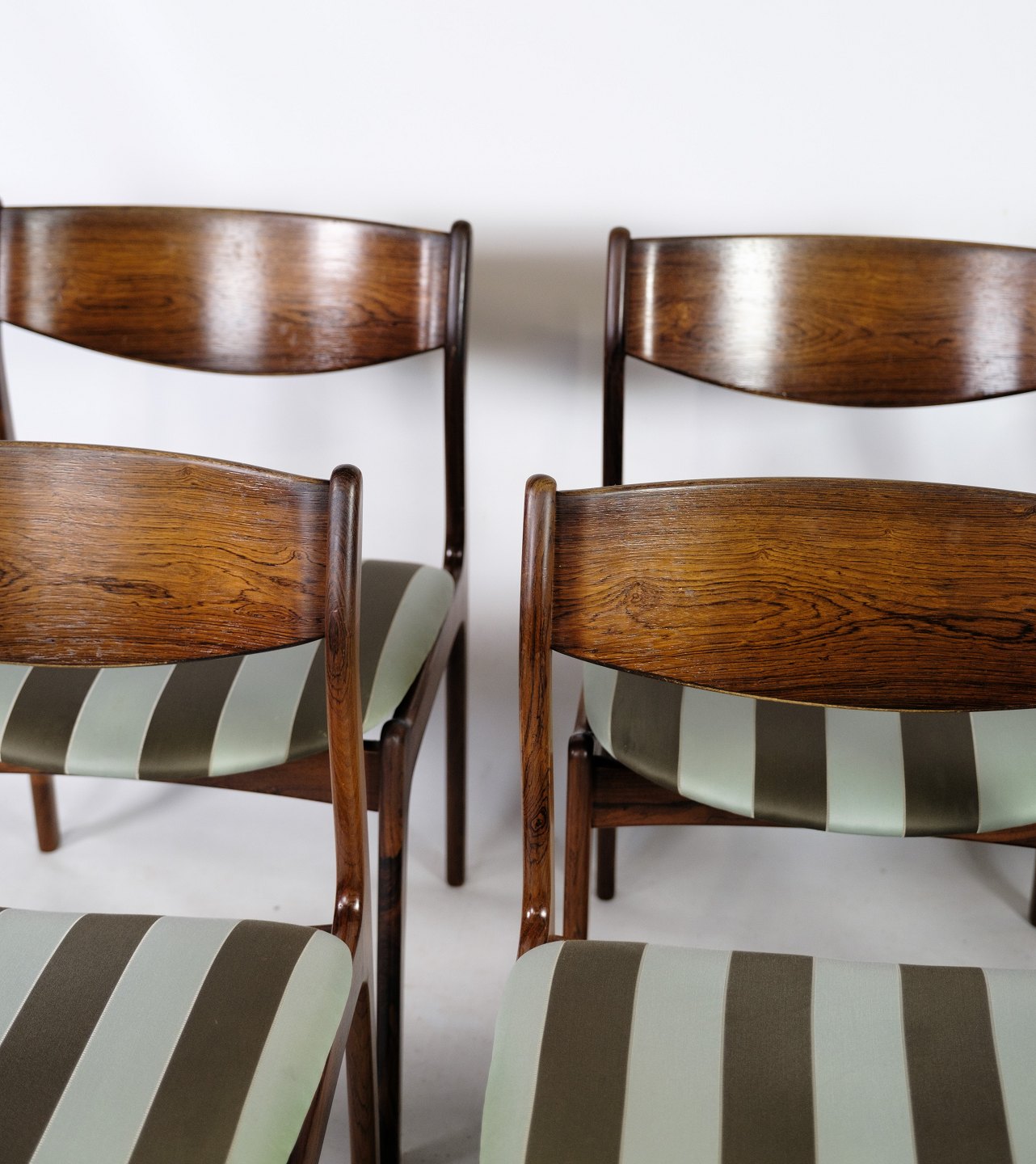 SoldSet of six dining chairs of Danish design in the wood type rosewood manufactured by Farsø møbelfabrik from around the 1960s. The chair is in very nice condition with striped fabric cover.