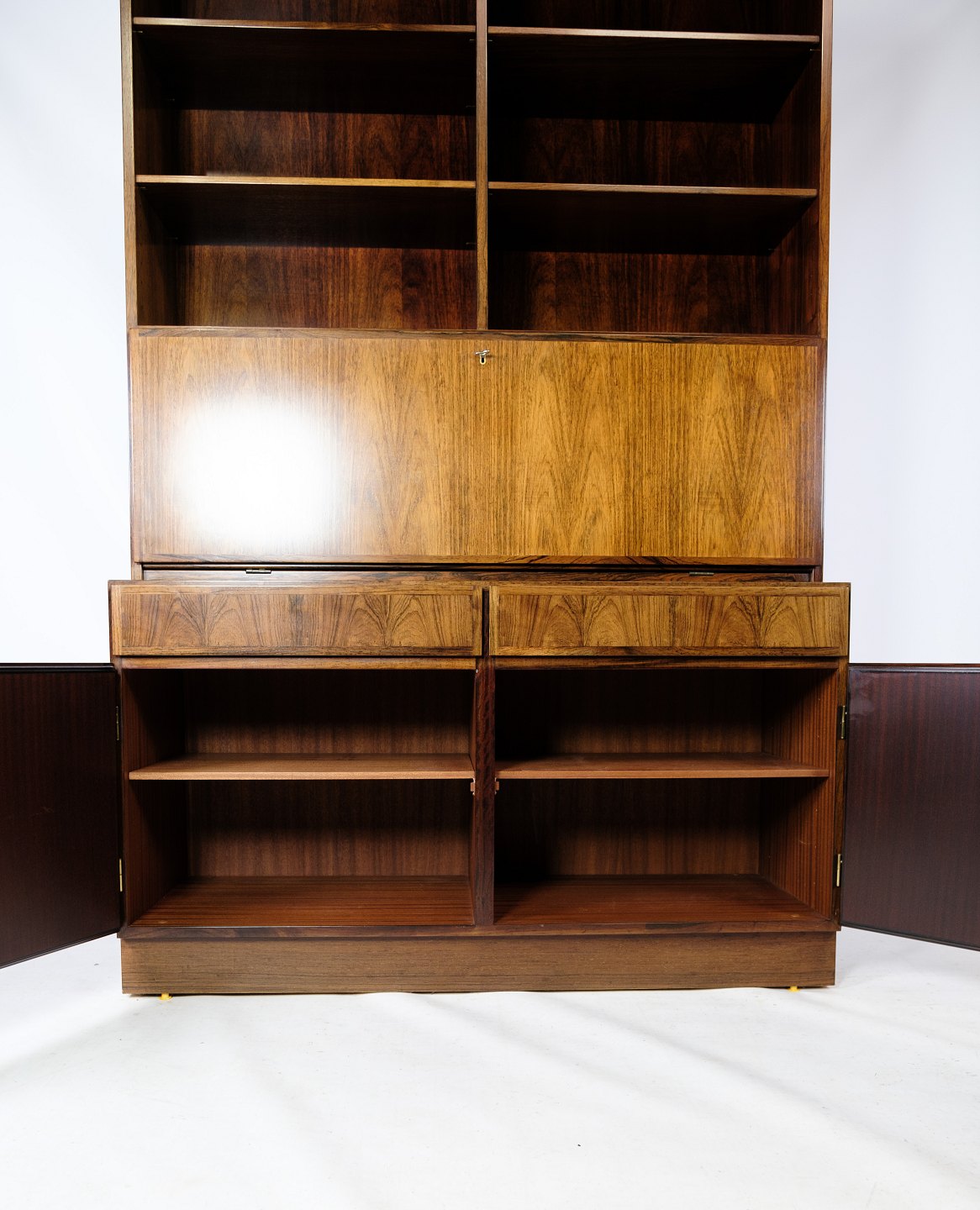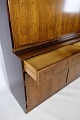 Reol system med sekretær, Model 9, designet af Omann Junior i palisander af dansk design fremstillet hos Omann Juniors Møbelfabrik fra 1960'erne. Bestående af underdel med 2 låger og vitrine overdel med hylder.