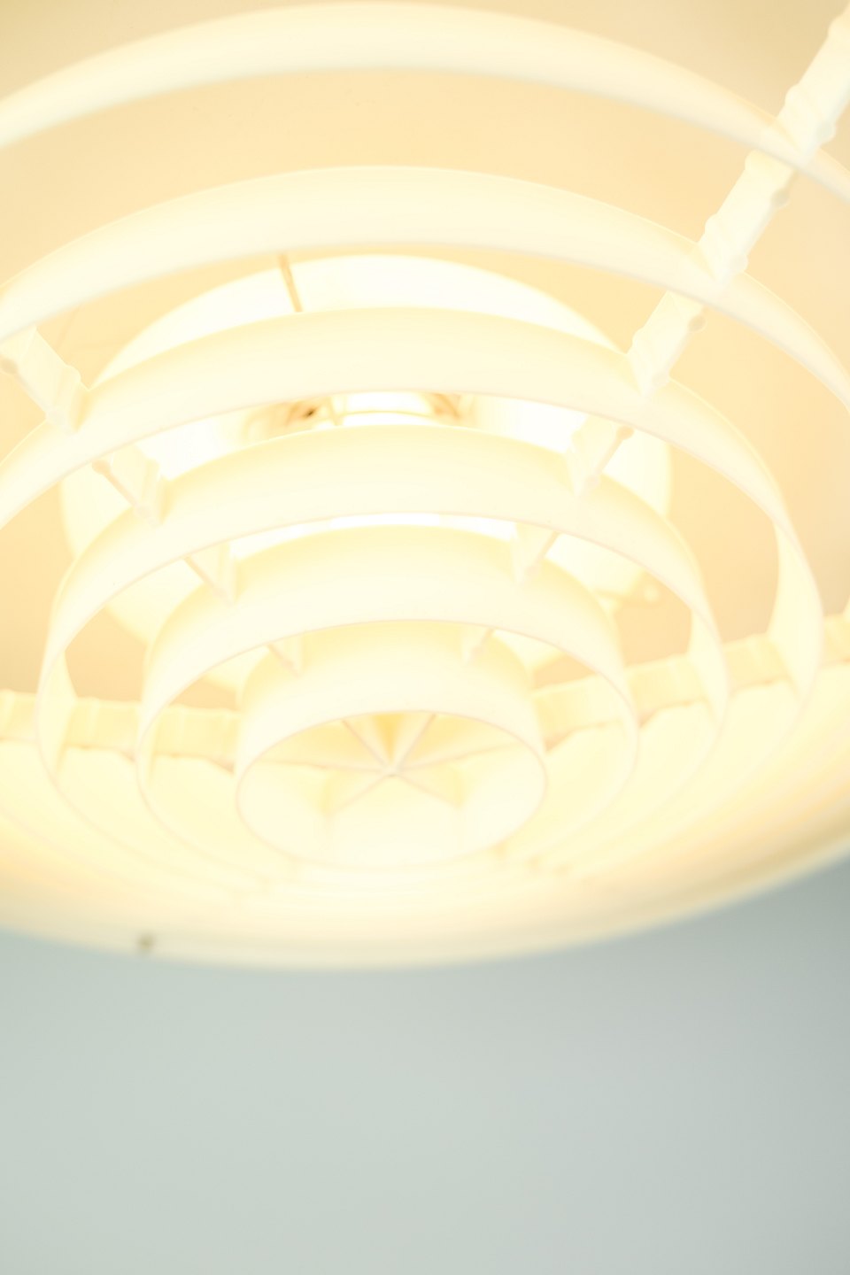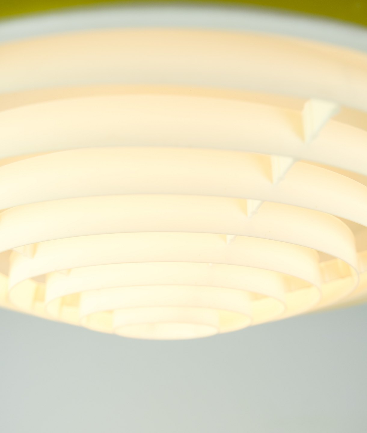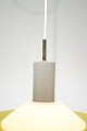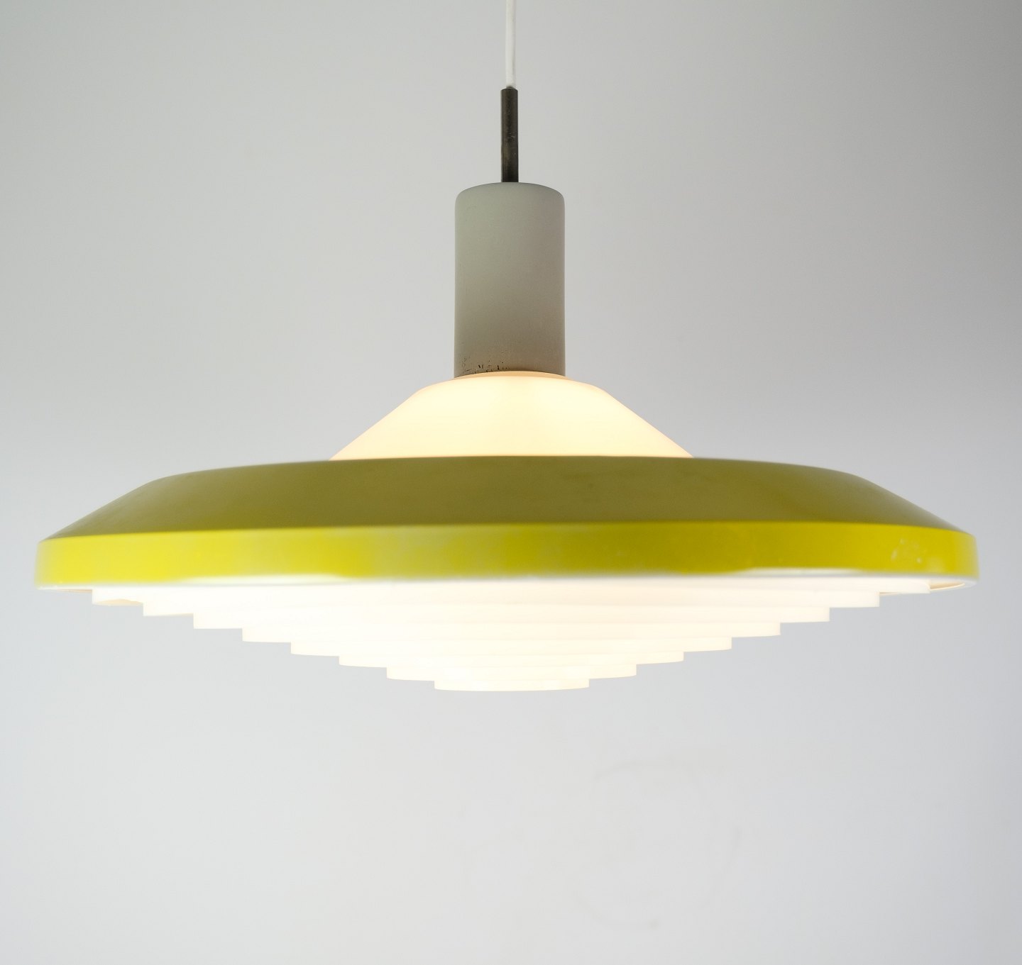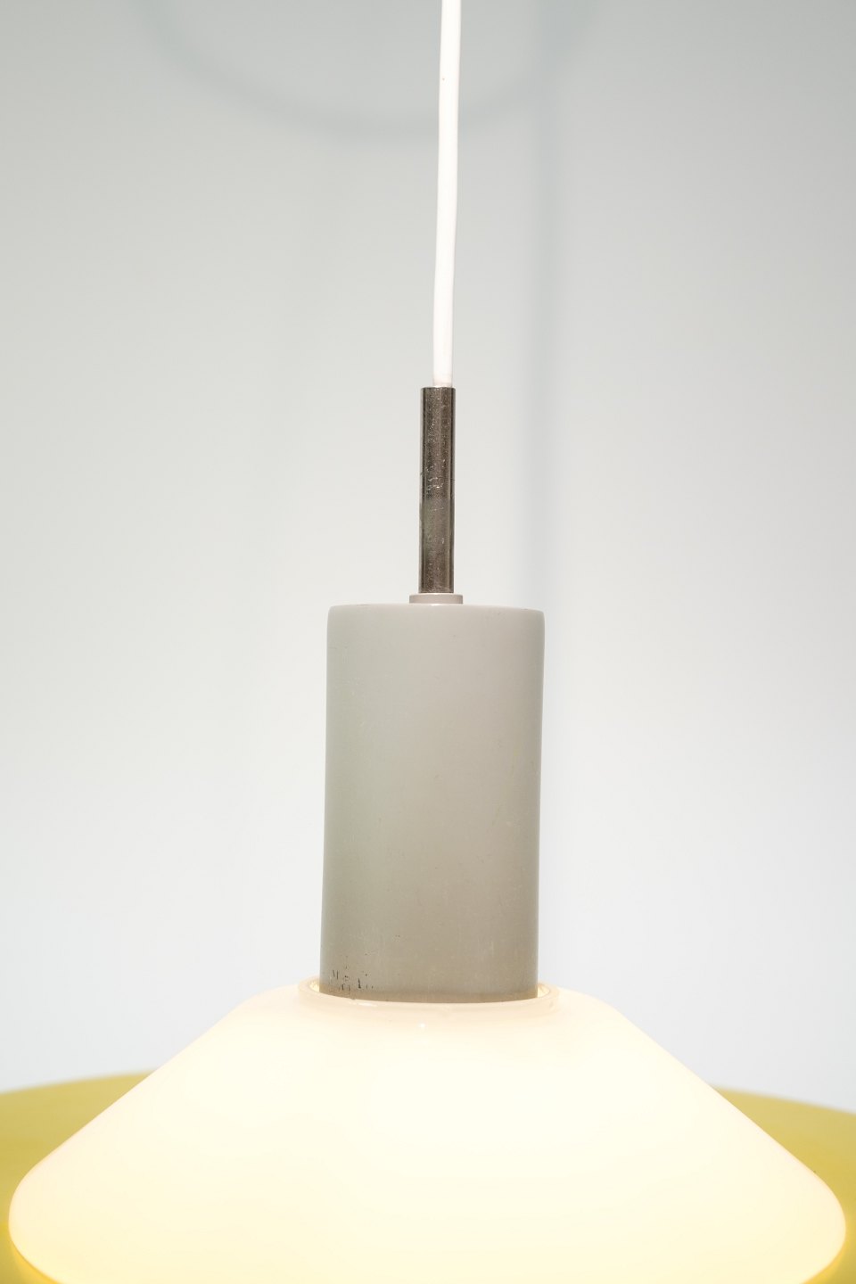 Stockholm pendant in yellow lacquered metal and opal glass by Louis Poulsen from the 1960s.