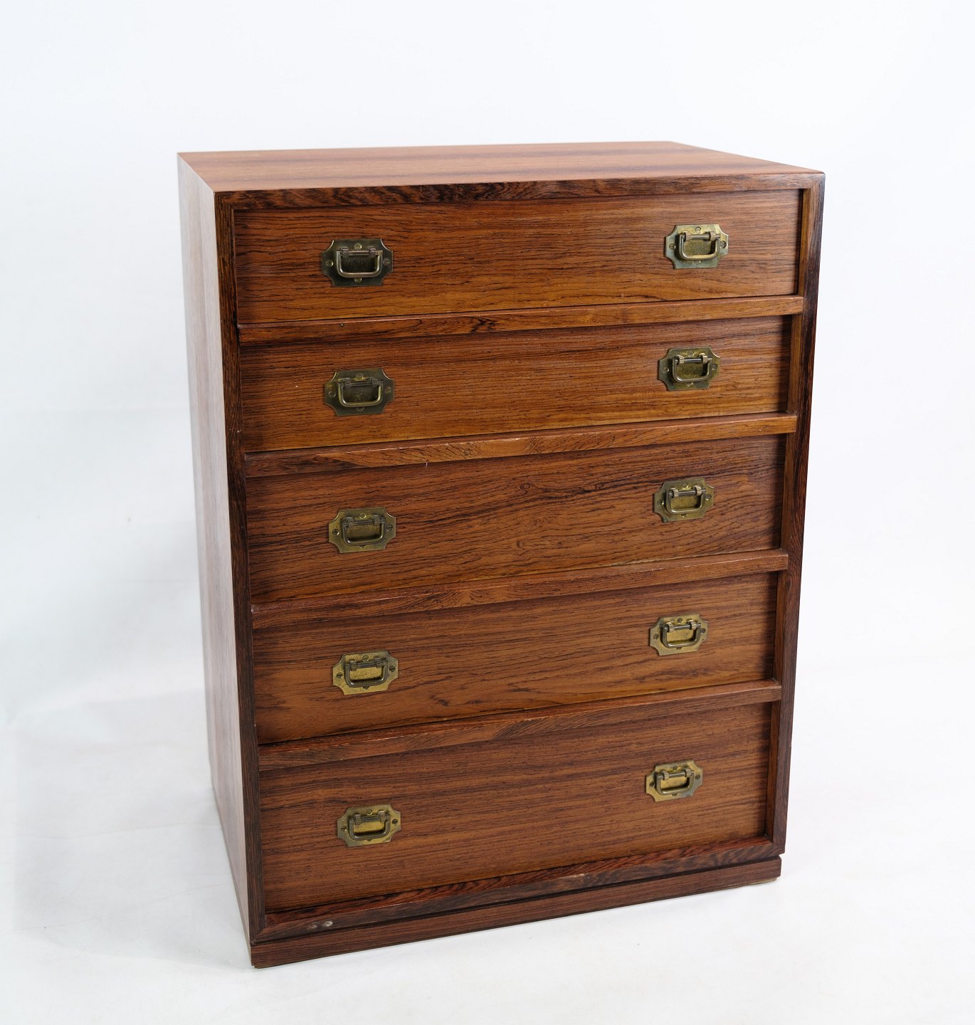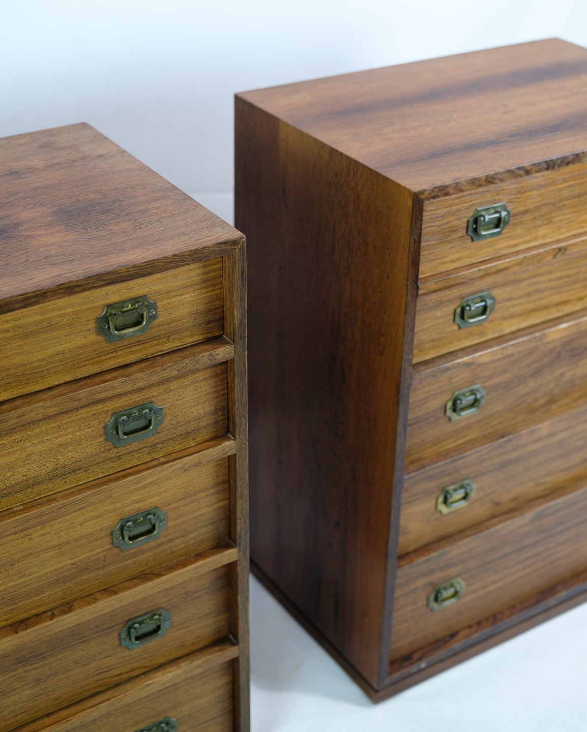 This set of two chests of drawers, designed by Henning Korch, is made of rosewood and makes an elegant and functional addition to any room. Each chest of drawers has five spacious drawers with brass handles that add a subtle touch of luxury to the design. The natural warmth and beautiful texture of the rosewood is combined with the timeless aesthetics and craftsmanship quality that is characteristic of Henning Korch's designs. Manufactured at Silkeborg Møbelfabrik, these chests of drawers are not only beautiful, but also durable and functional, making them a valued addition to any interior.
