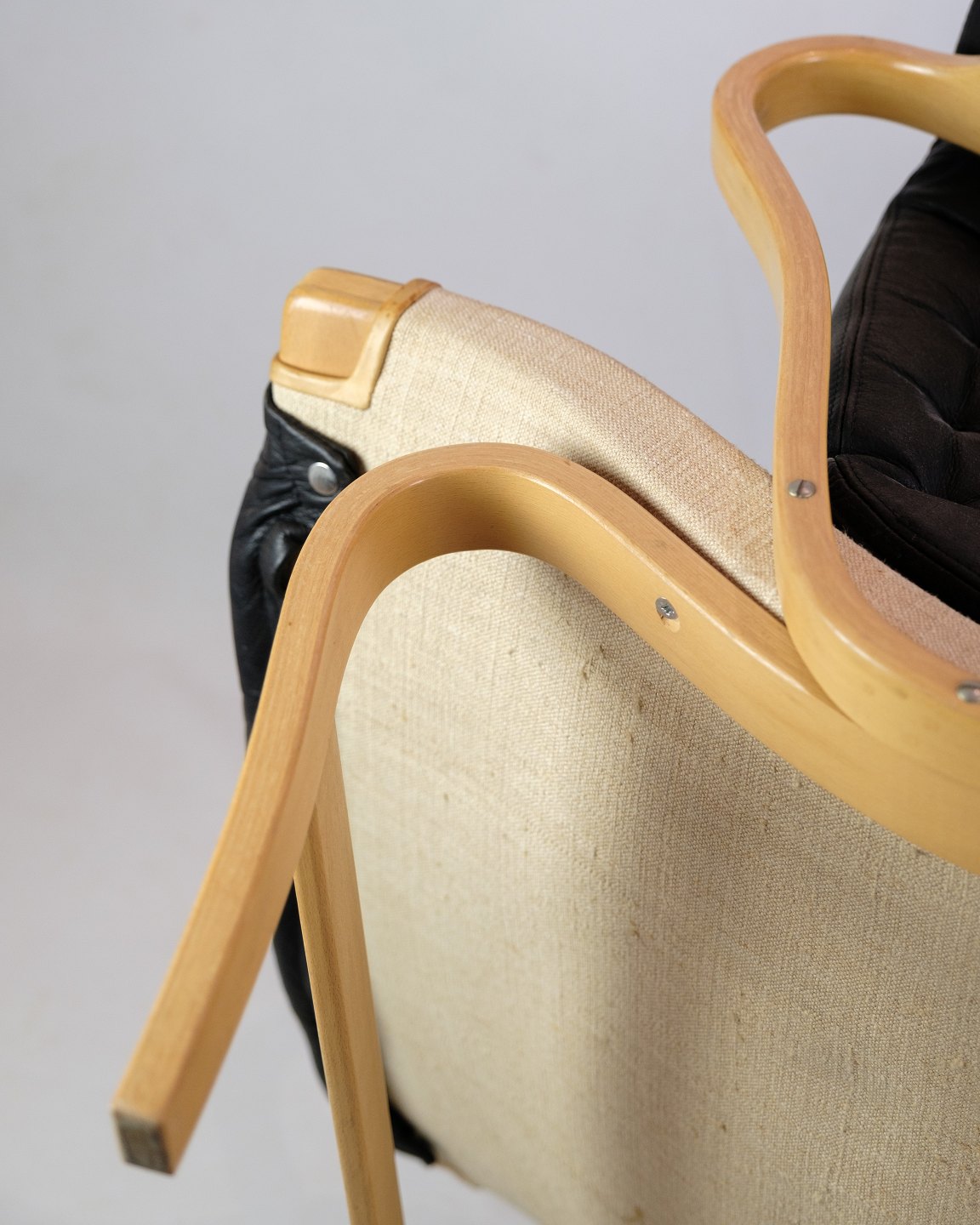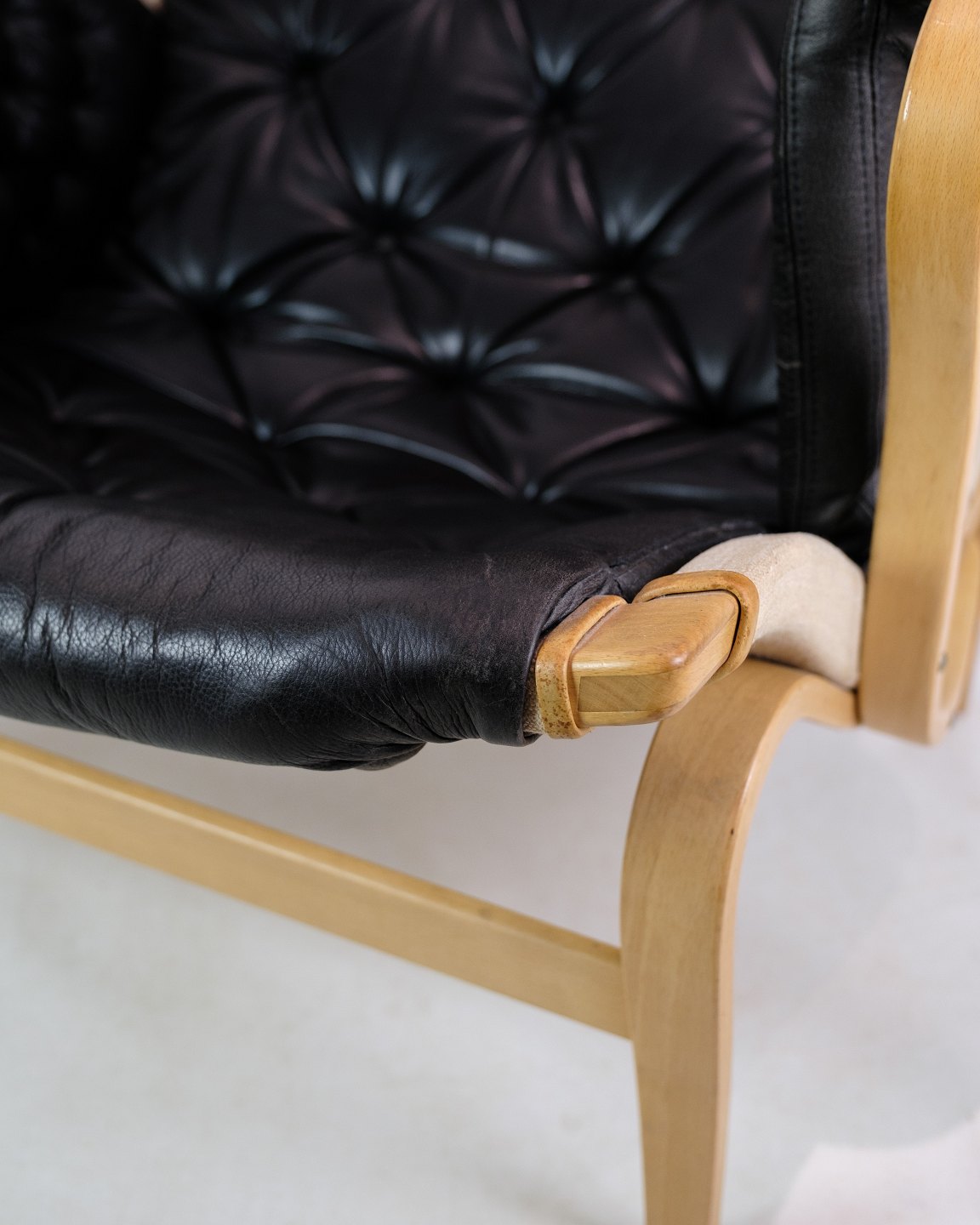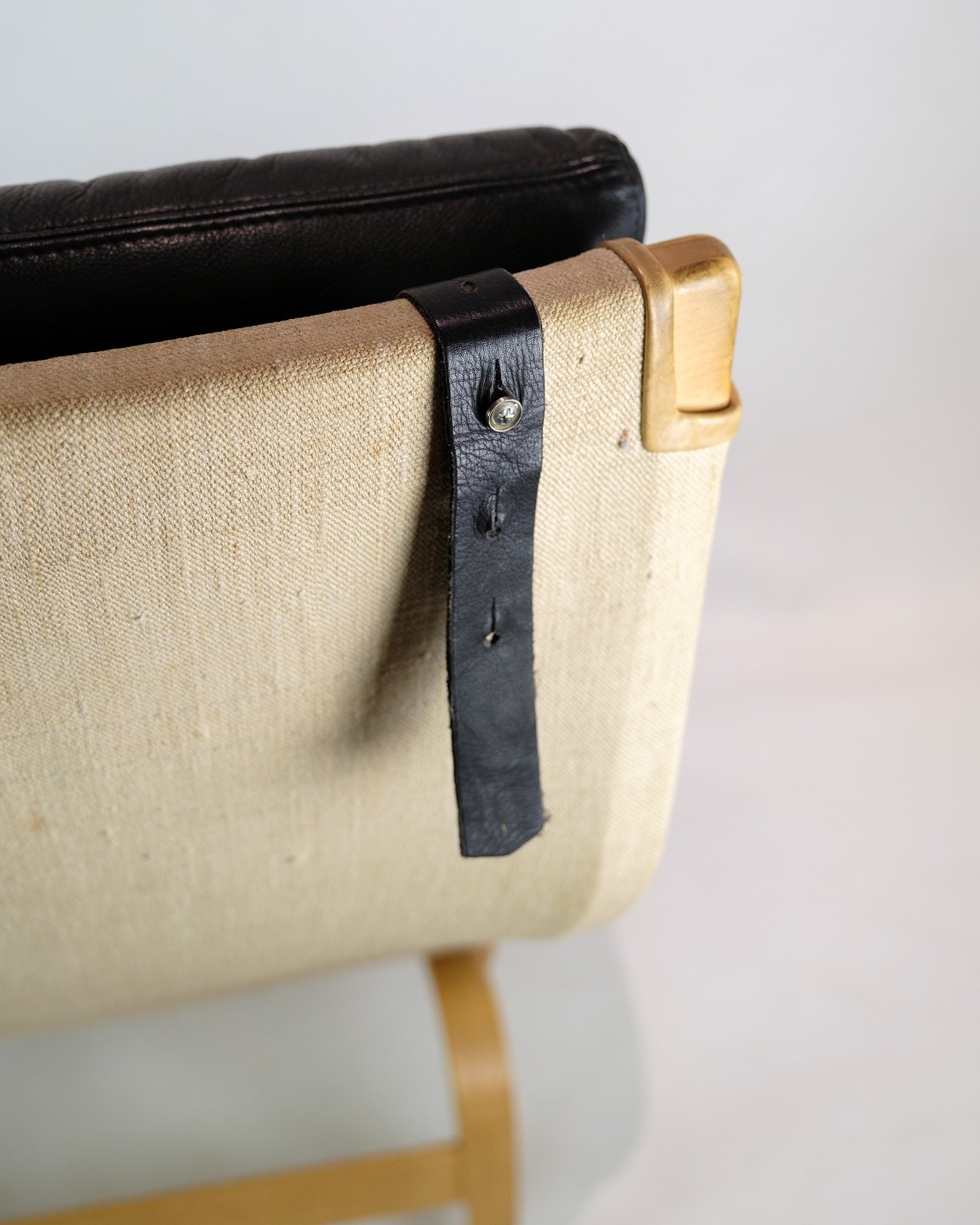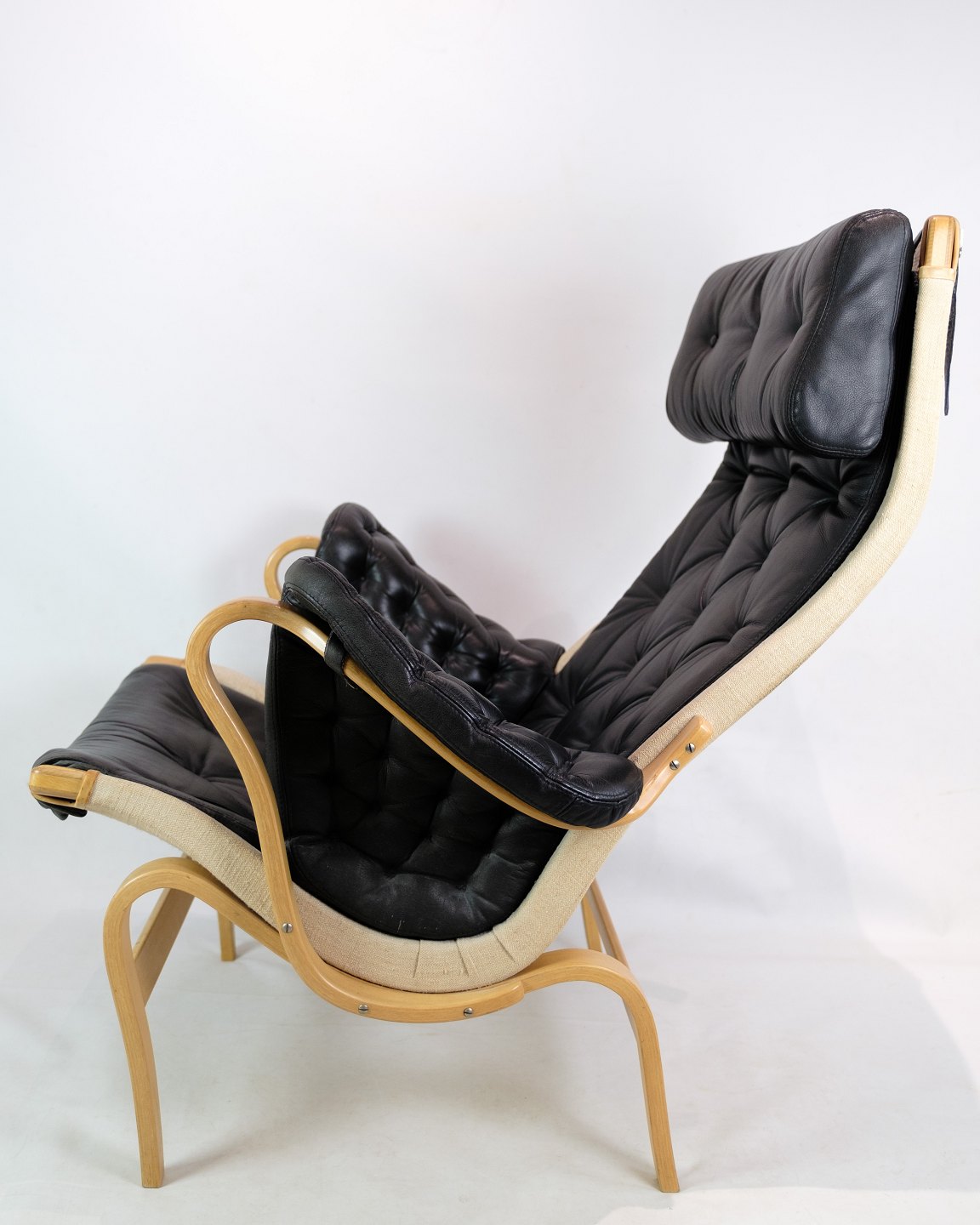 Armchair, Pernilla 69, beech, canvas and black leather, Bruno Mattsson