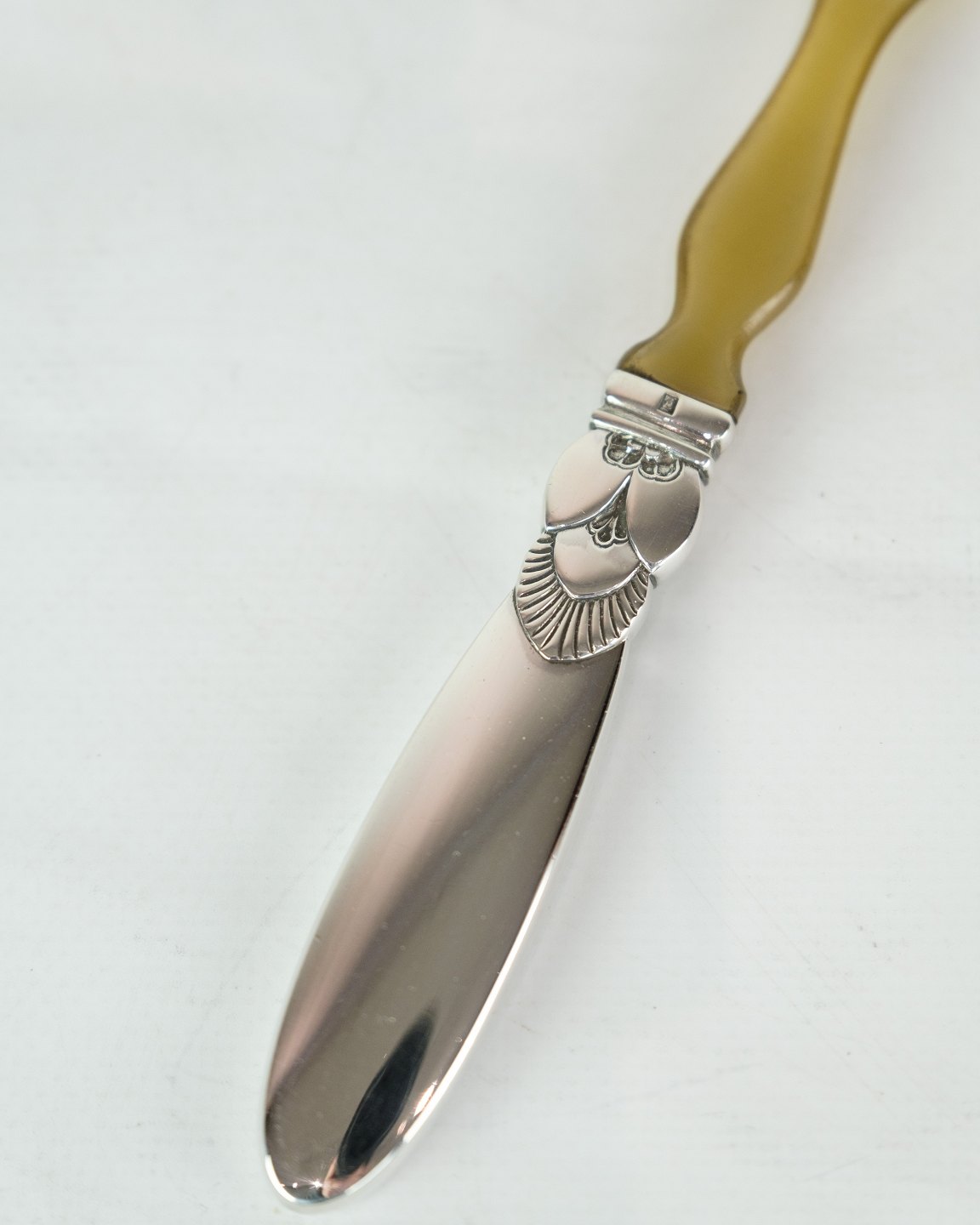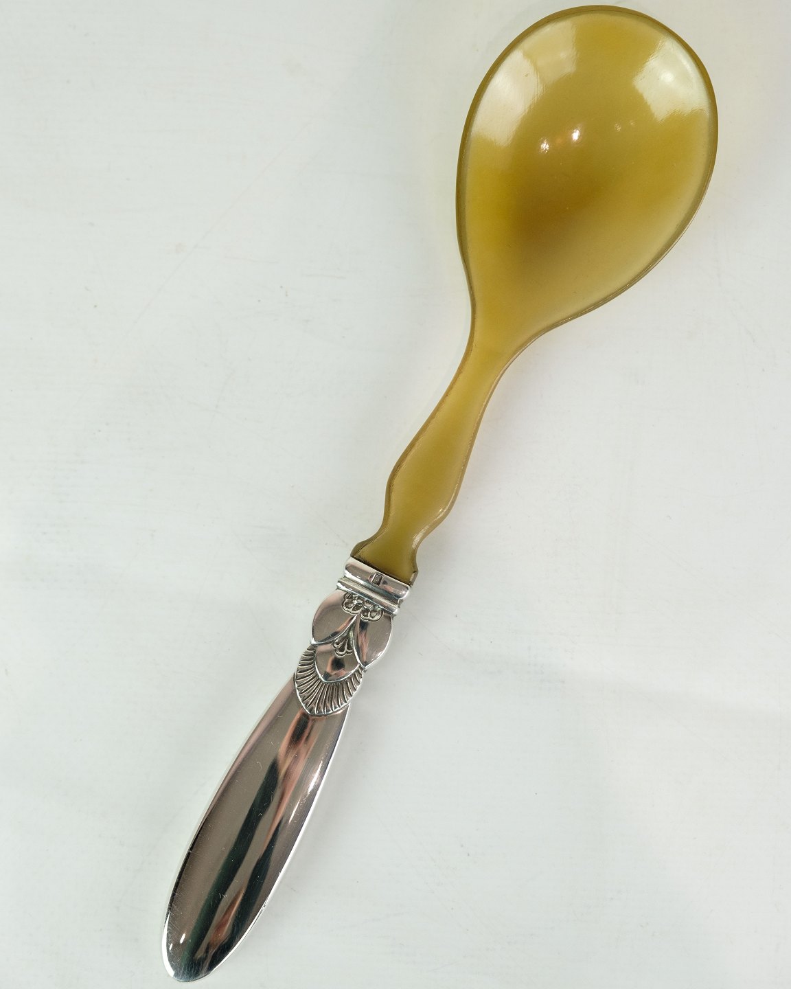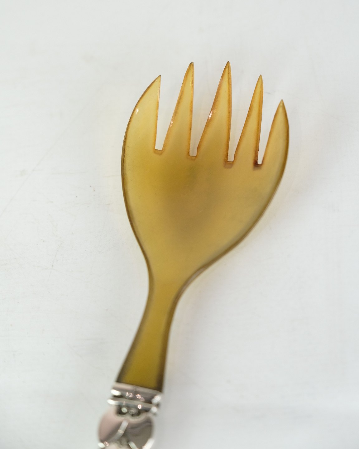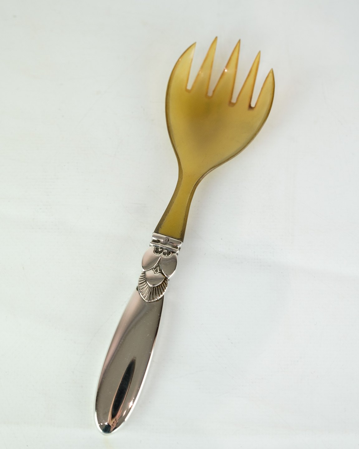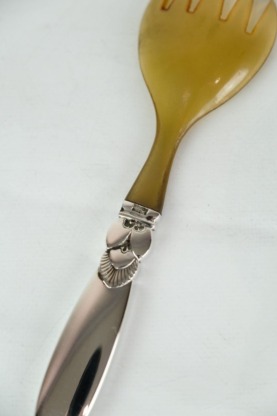 The Georg Jensen Cactus salad set is an elegant and unique item for any home. Made of sterling silver with a vintage horn stamp GI 925, this salad set dates from 1931 and appears in a nice well maintained condition. Designed by Gundorph Albertus in 1930, it is part of Georg Jensen Sølvsmedie's collection in Denmark. Featuring the classic Cactus pattern, this salad set will upgrade any dining room table.