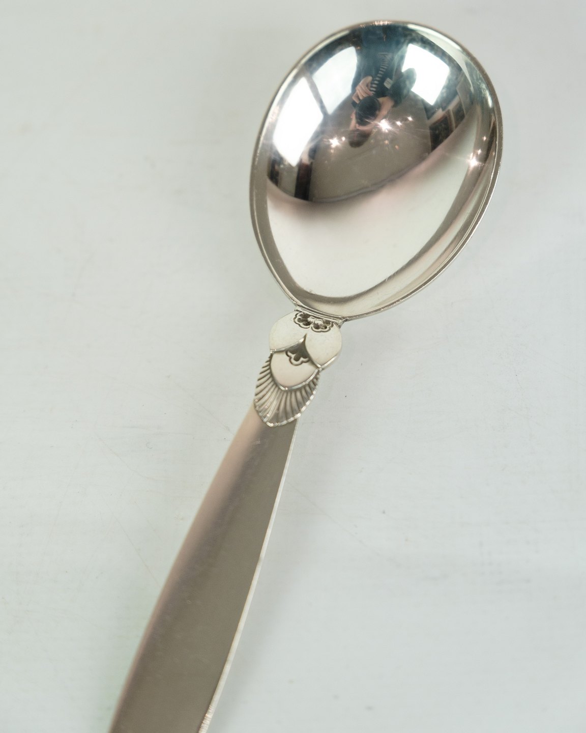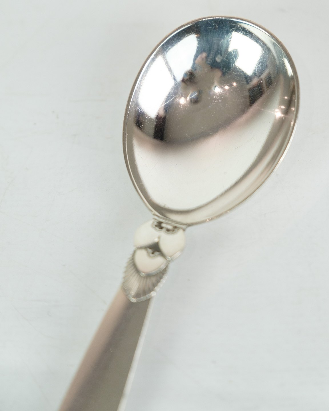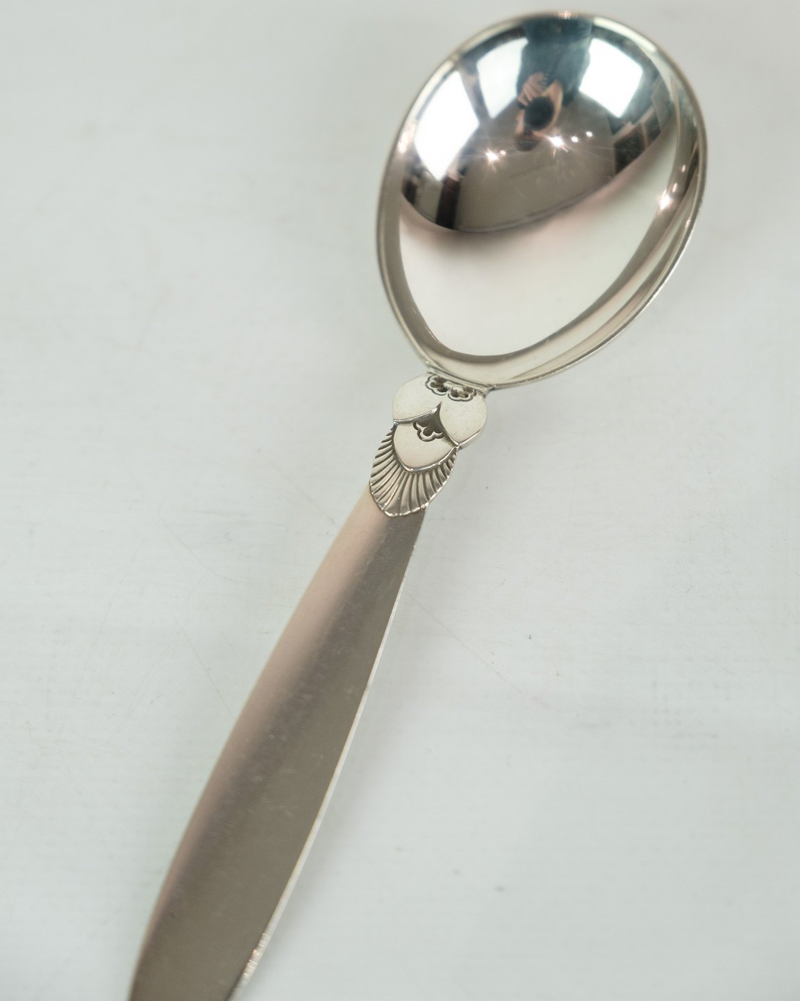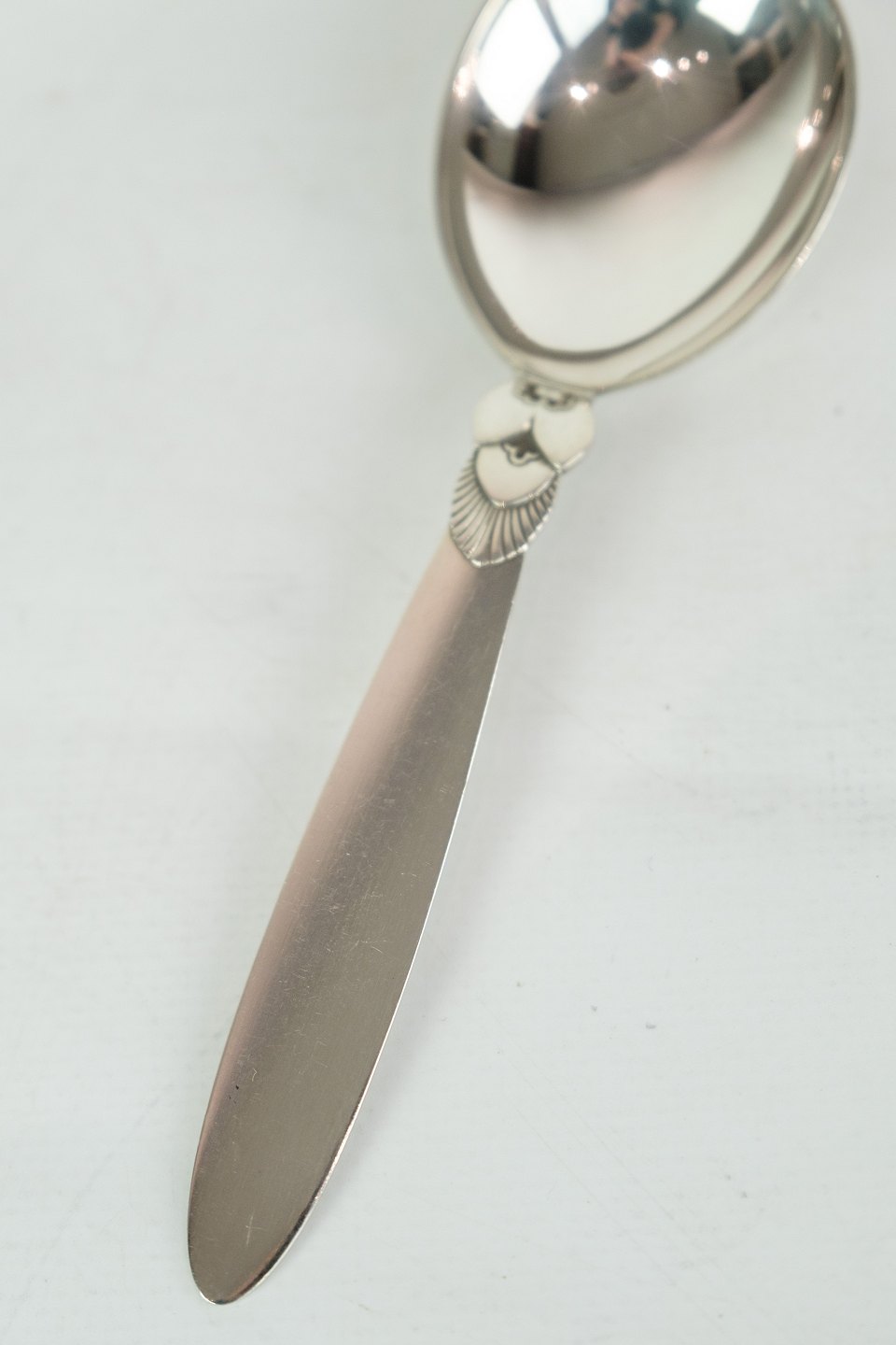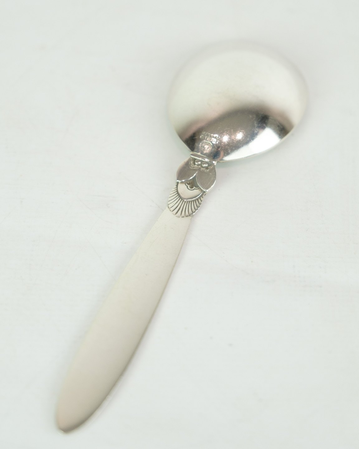 This Georg Jensen Kaktus jam spoon in sterling silver is a beautiful and practical addition to your dining table. With a well-known Cactus pattern designed by Gundorph Albertus in 1930 for Georg Jensen Sølvsmedie, Denmark, this spoon exudes tradition, quality and elegance. Although in a nice used condition with normal signs of use, it will still add charm to your breakfast or brunch. Order this unique and beautiful silver cutlery today.