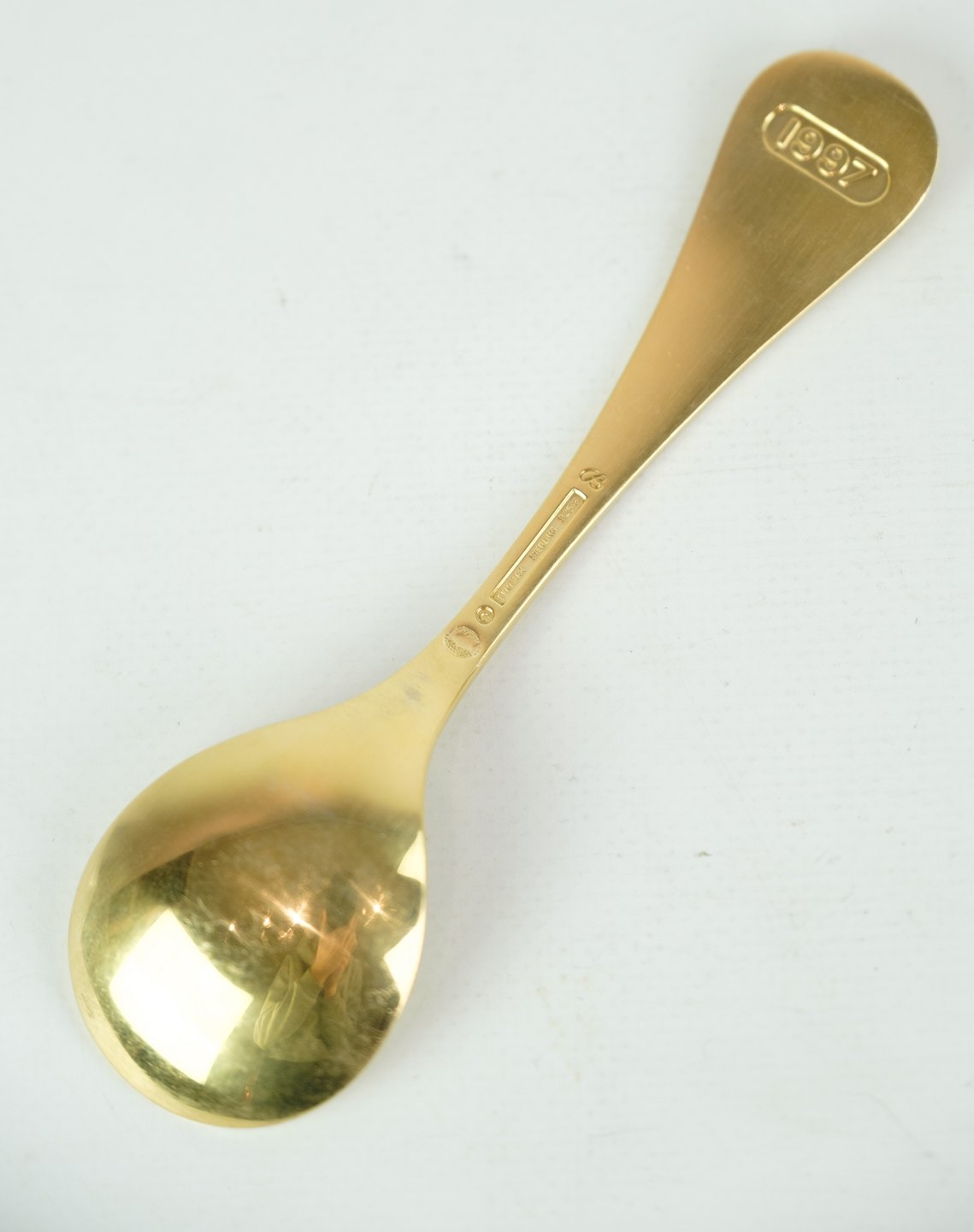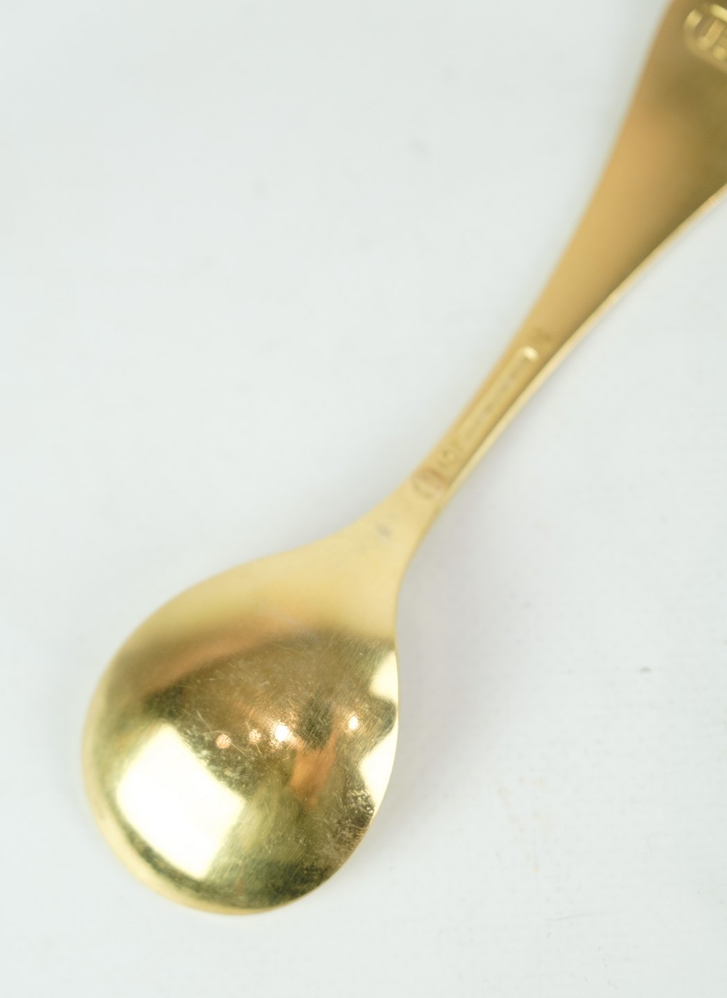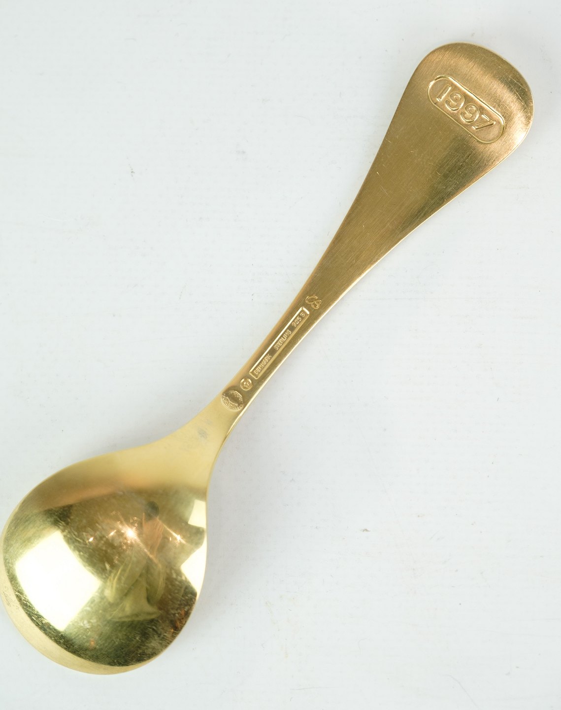 SoldGeorg Jensen year 1997 Cherry is a beautiful and elegant accessory for any festive occasion. It is made of gold-plated sterling silver and has a detailed cherry design created by the famous designer Annelise Bjørner (designer for Georg Jensen 1971-03). The spoon is in nice, used condition and would make a valuable addition to any collection of Georg Jensen silverware. With its unique and beautiful shape, it will be a remarkable element on any table.