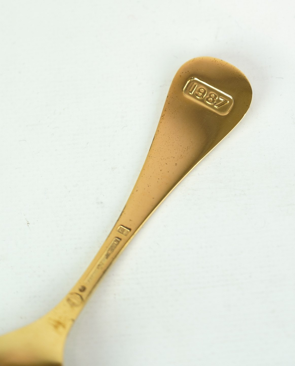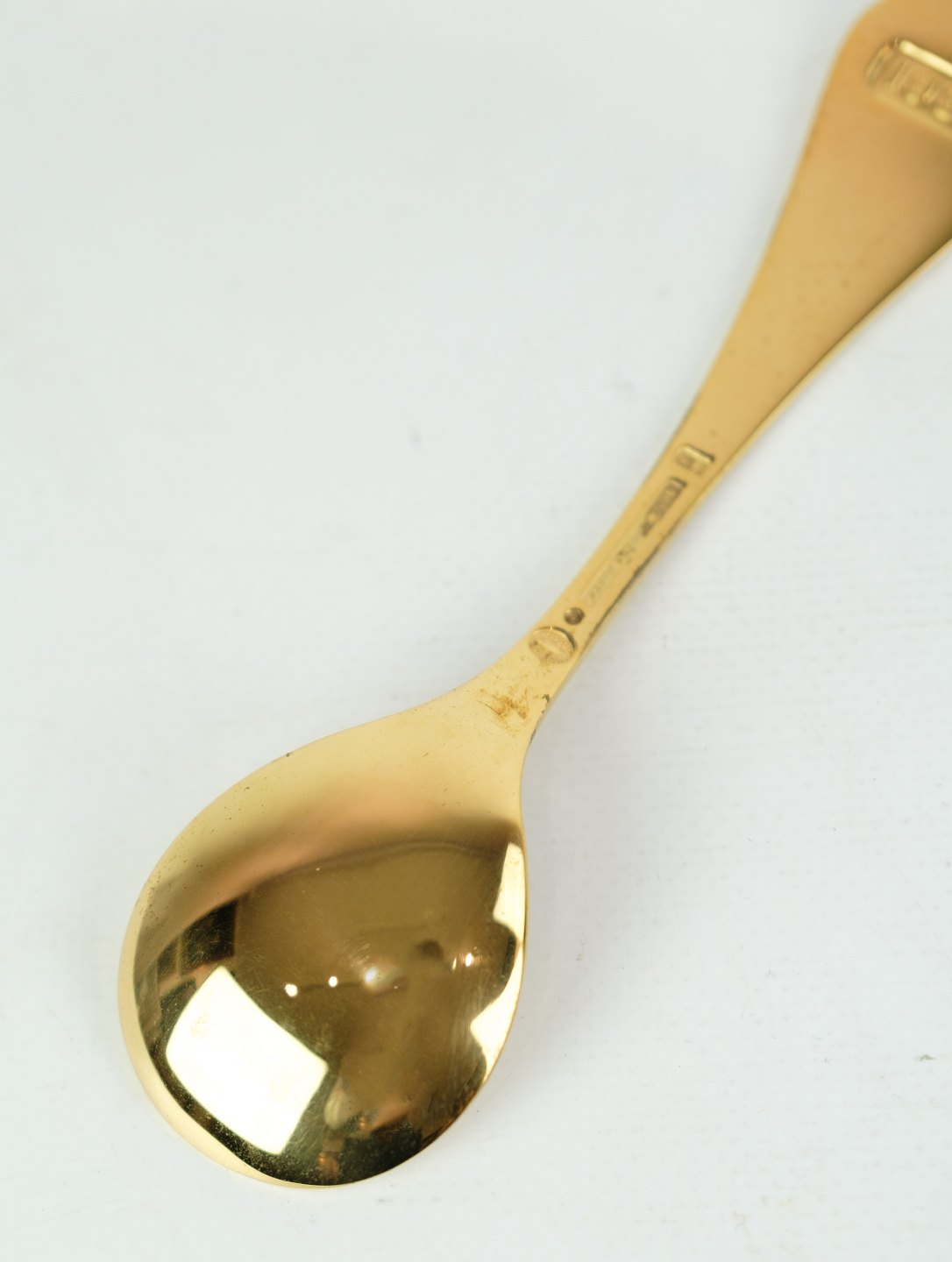 SoldGeorg Jensen year 1987 in white bull's eye in gold-plated sterling silver is a beautiful and elegant addition to your silver jewelery collection. The spoon is in good condition and appears with a smooth and shiny surface. The motif on the spoon is a beautiful floral pattern. With its timeless style and the quality of the gold-plated sterling silver, the spoon will be a treasured gift or personal purchase for many years to come