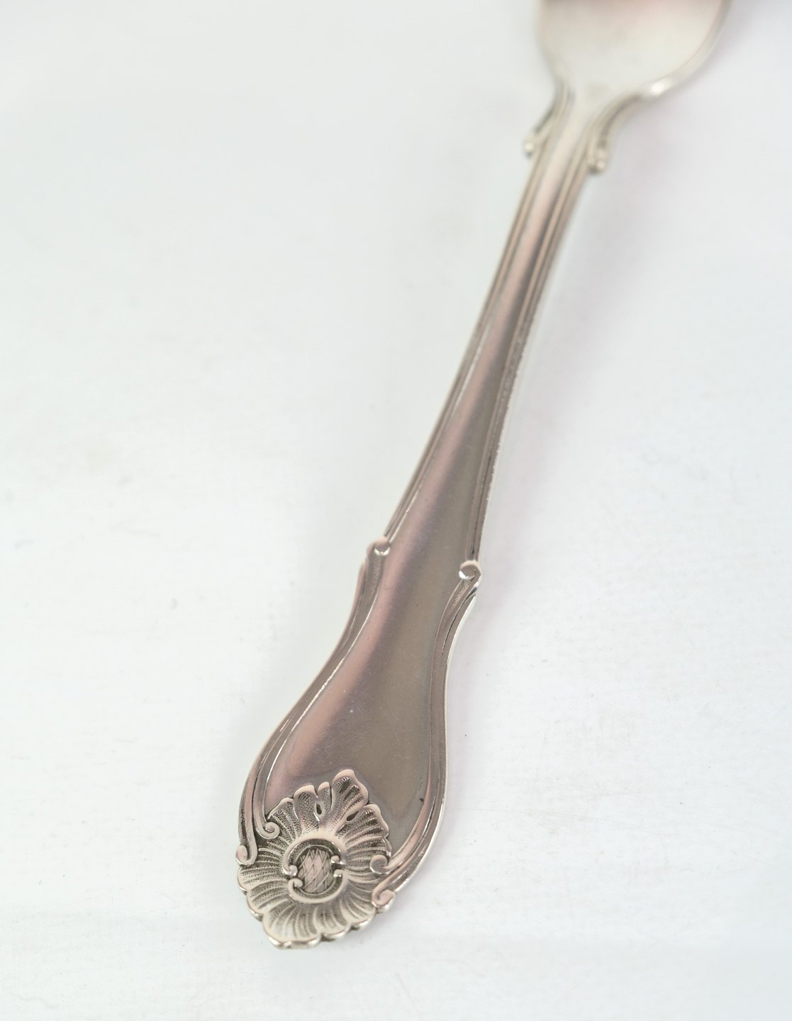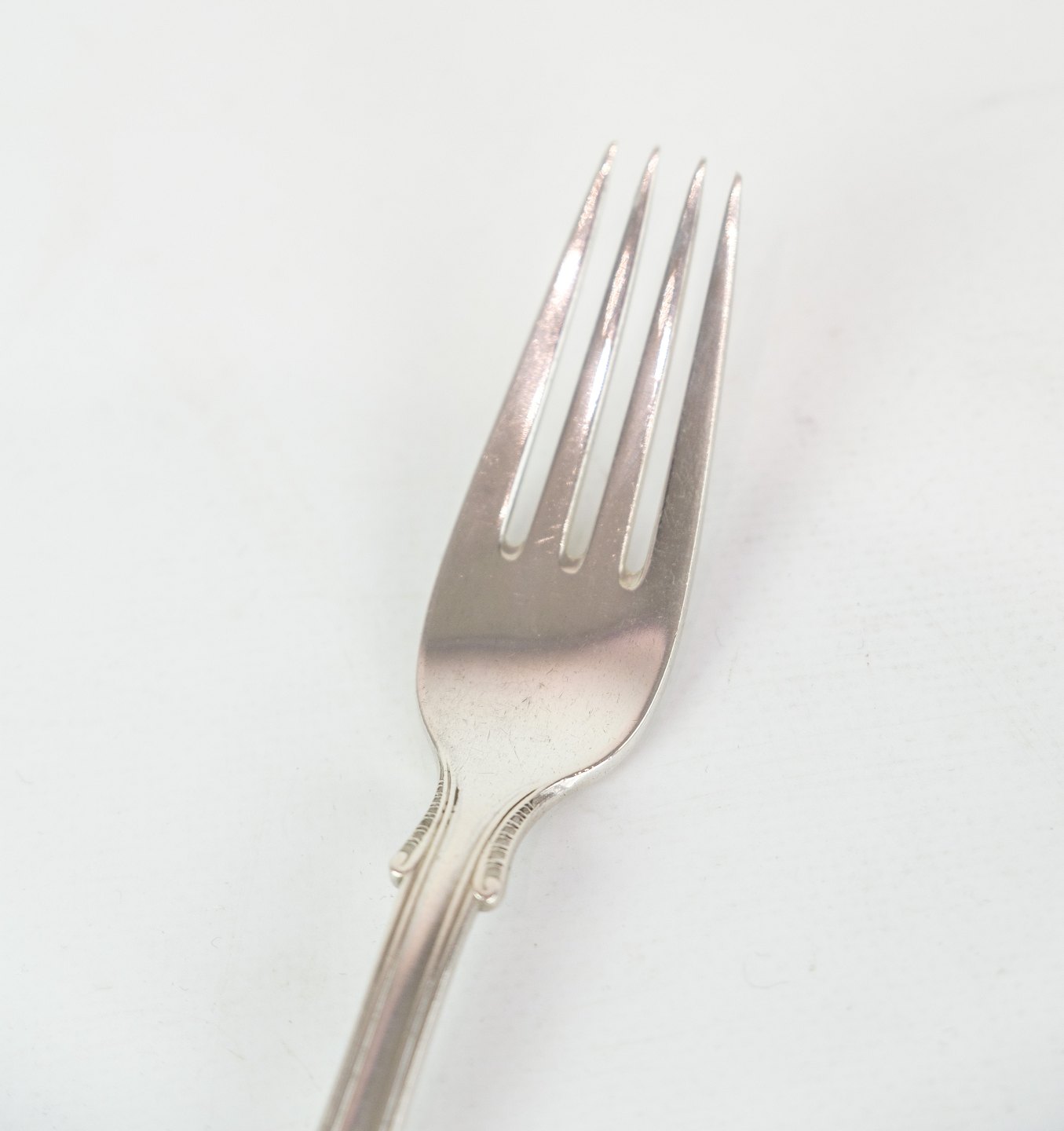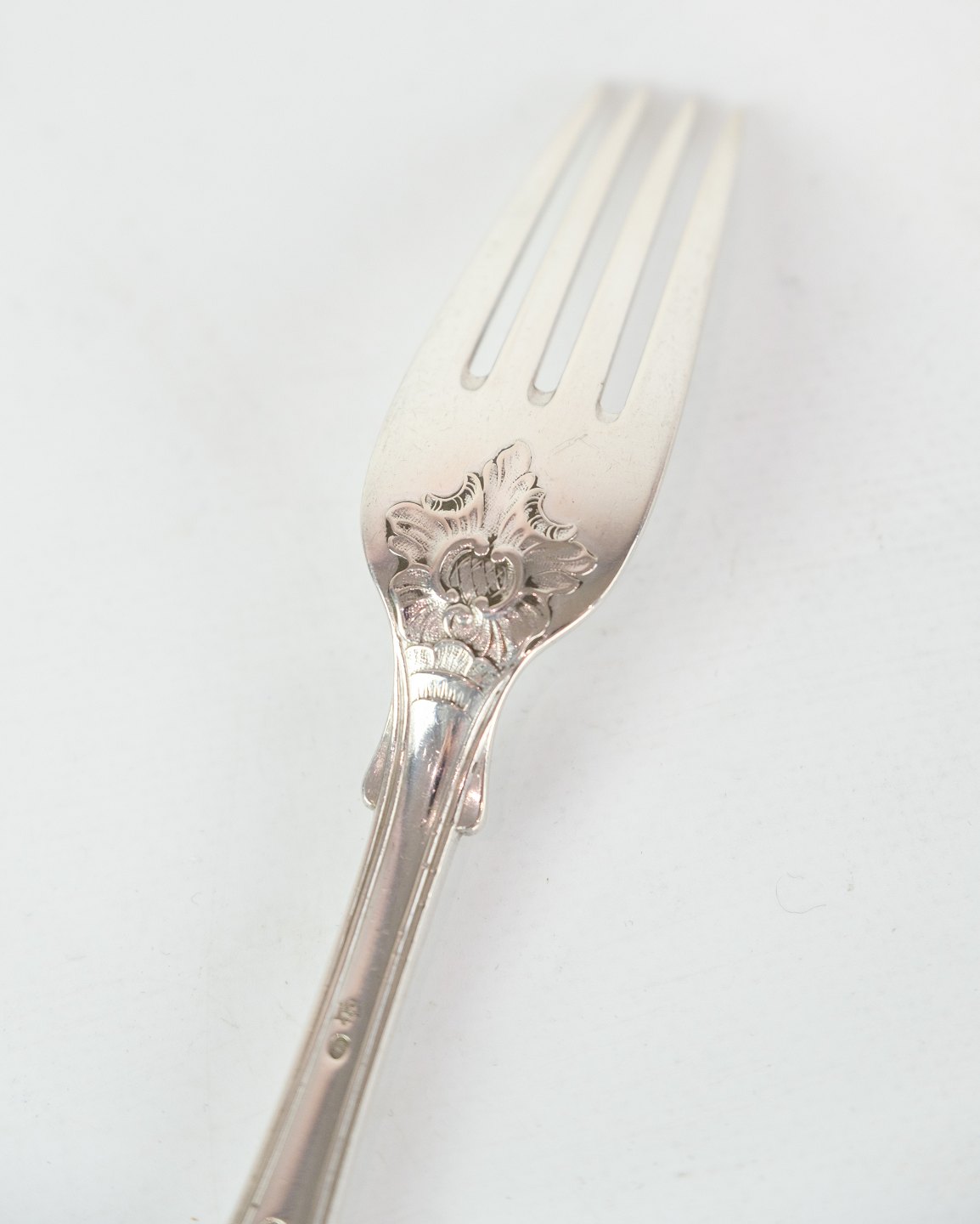 Middagsgaffel i rokoko af dansk sølvbestik i tretårnet 830s, fremstillet hos Horsens sølvvarefabrik.