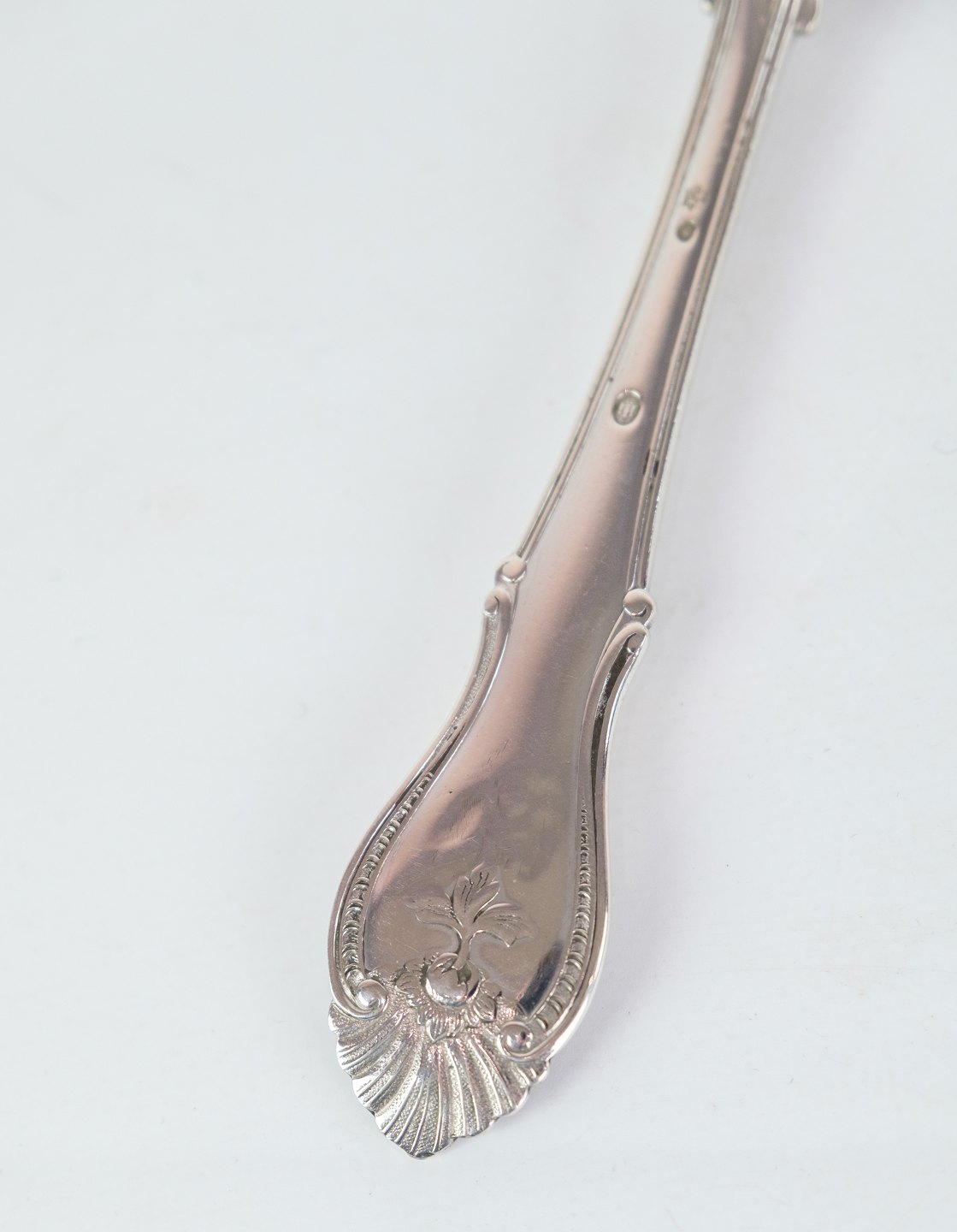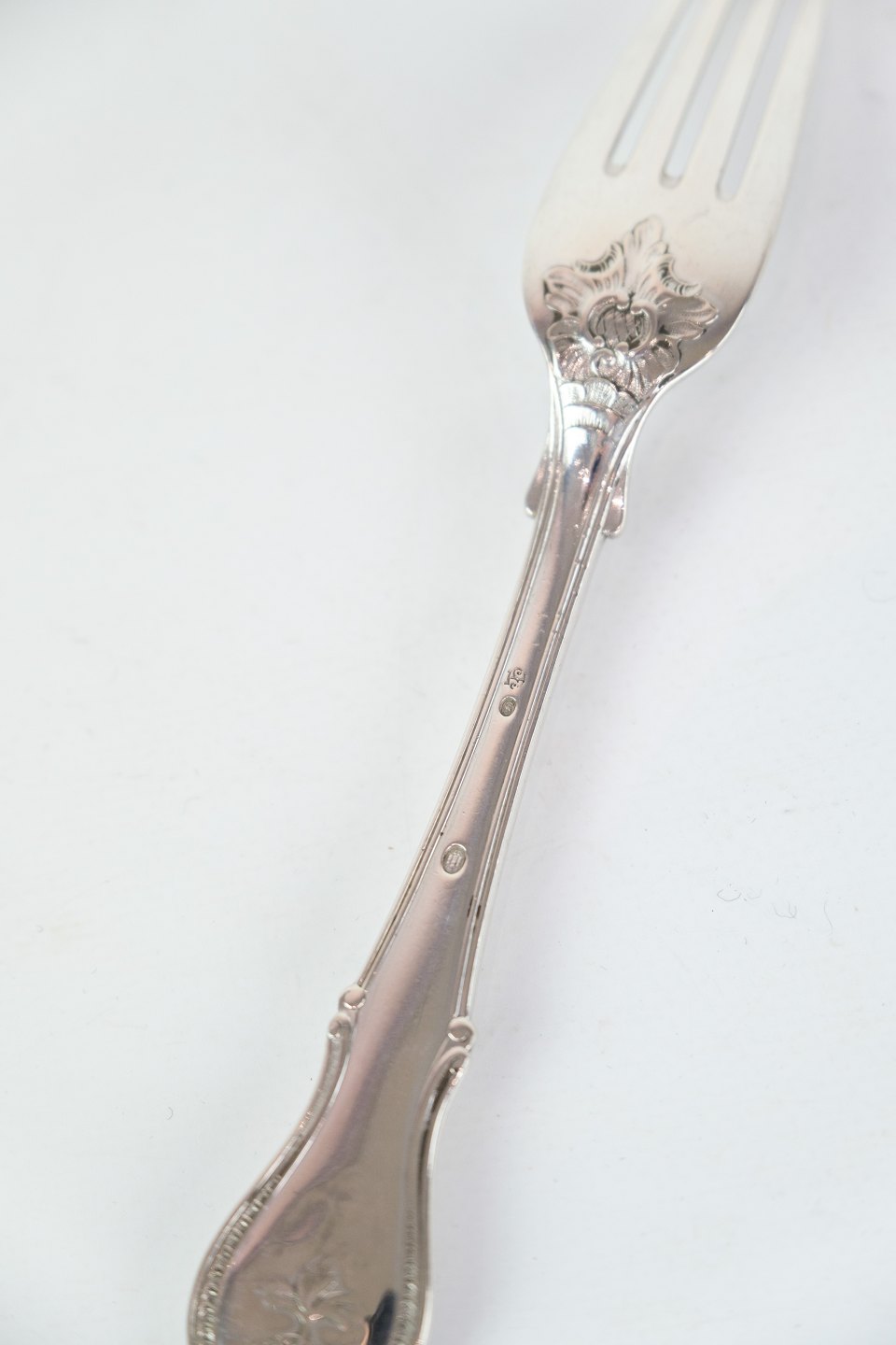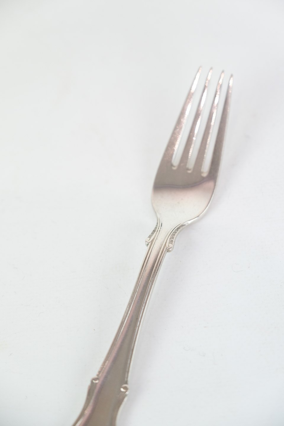 Middagsgaffel i rokoko af dansk sølvbestik i tretårnet 830s, fremstillet hos Horsens sølvvarefabrik.