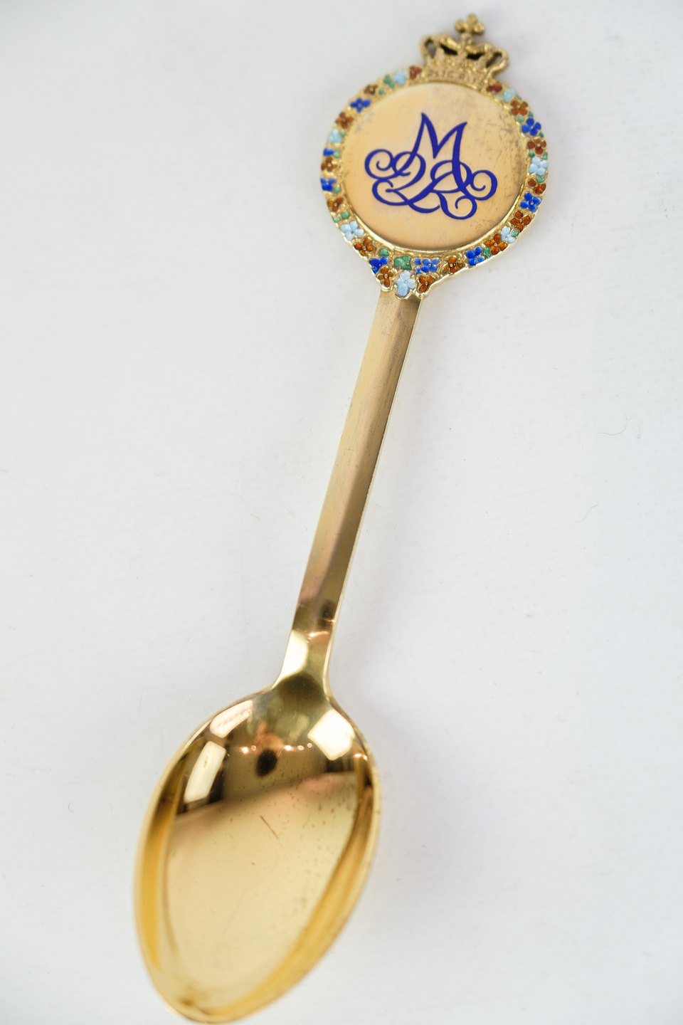 Jubilæumsske af A. Michelsen i anledning af Dronning Margrethe II's kroning, sterlingsølv. Fremstillet af forgyldt sterlingsølv med emaljedekoration.