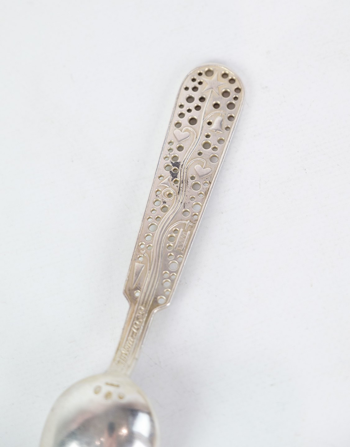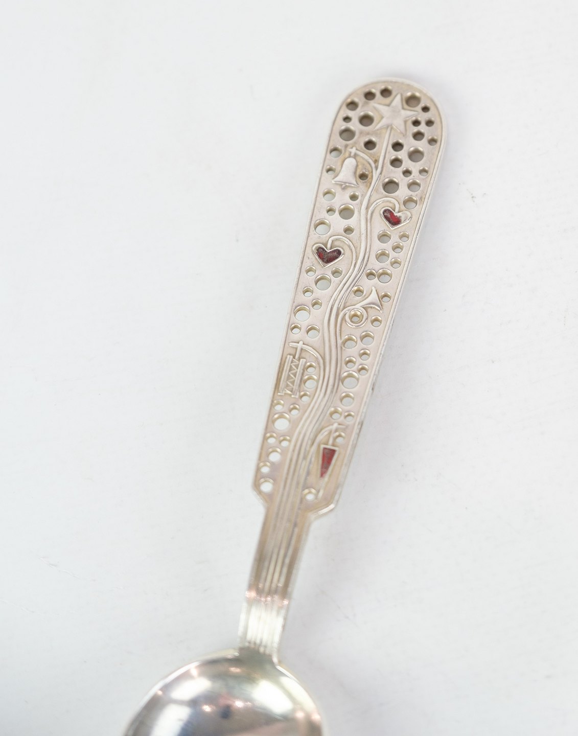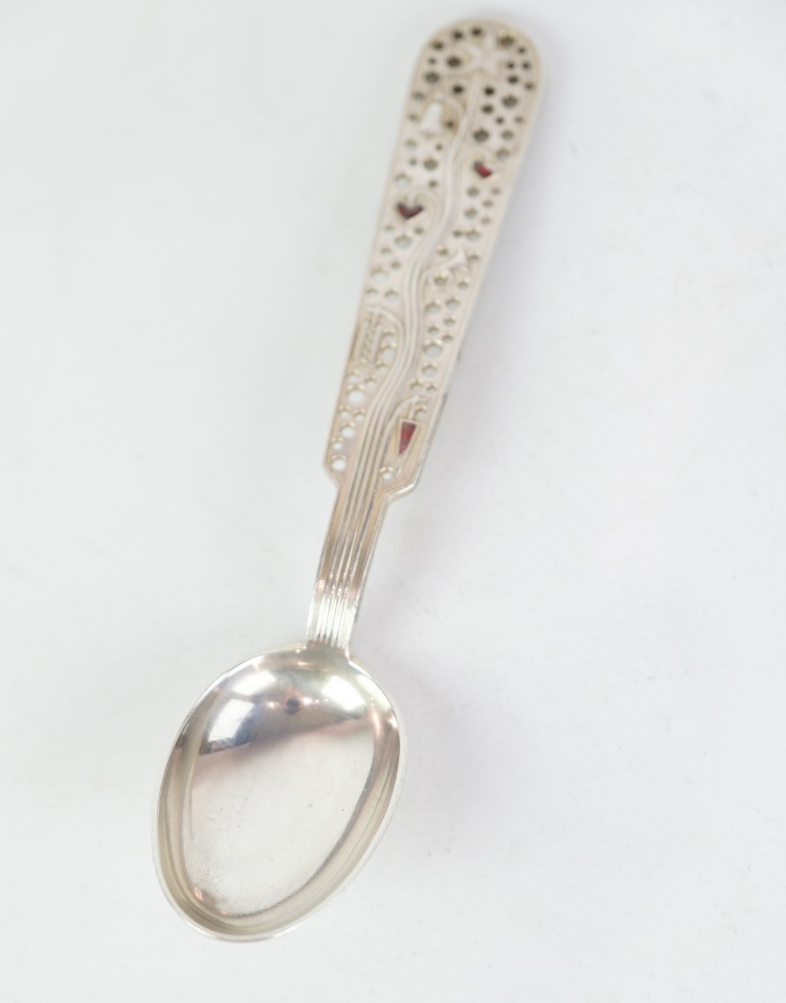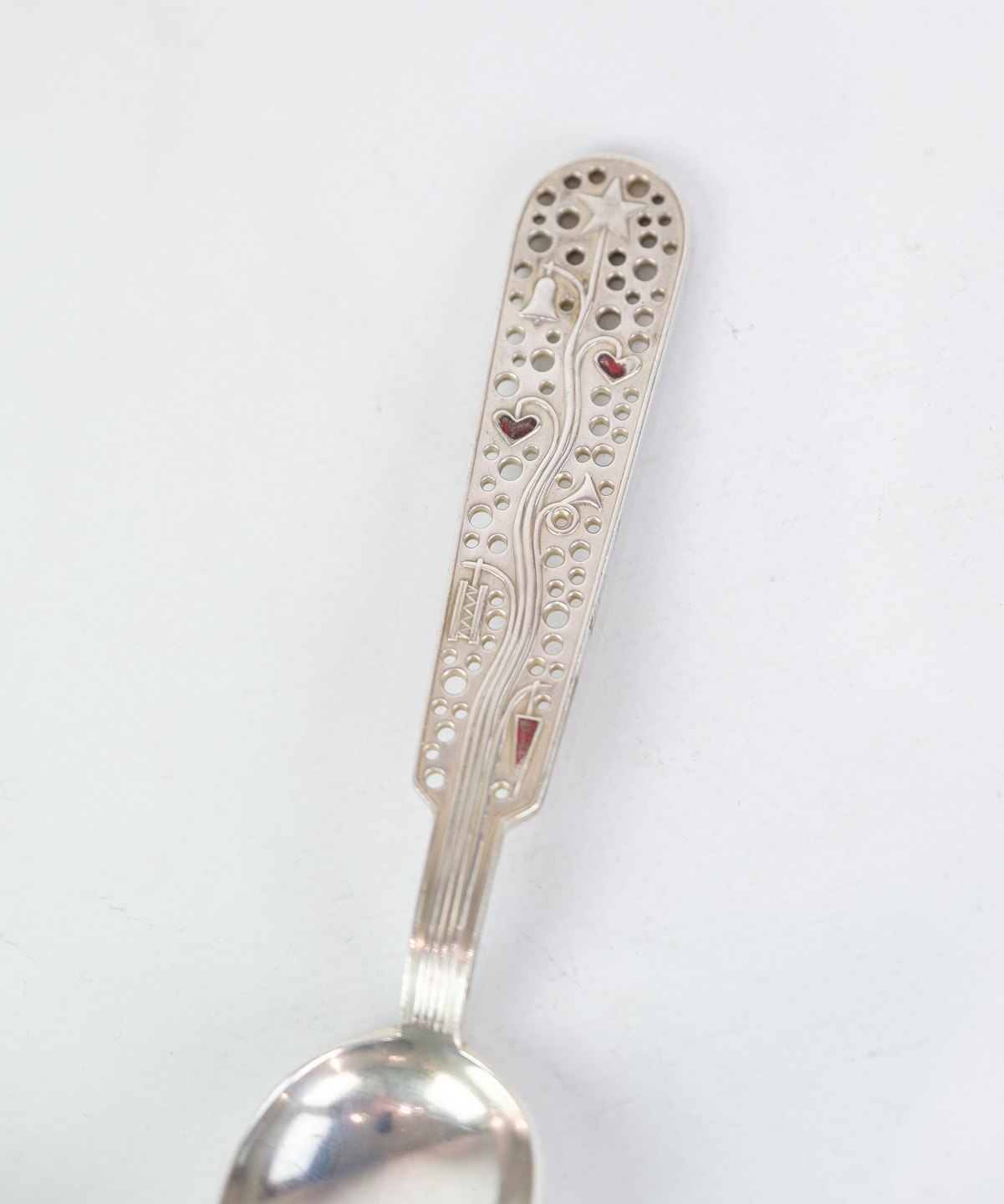 Jubilæumsske i tretårnet sølv med flot dekoreret mønster. I fin brugt stand